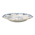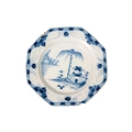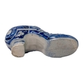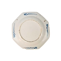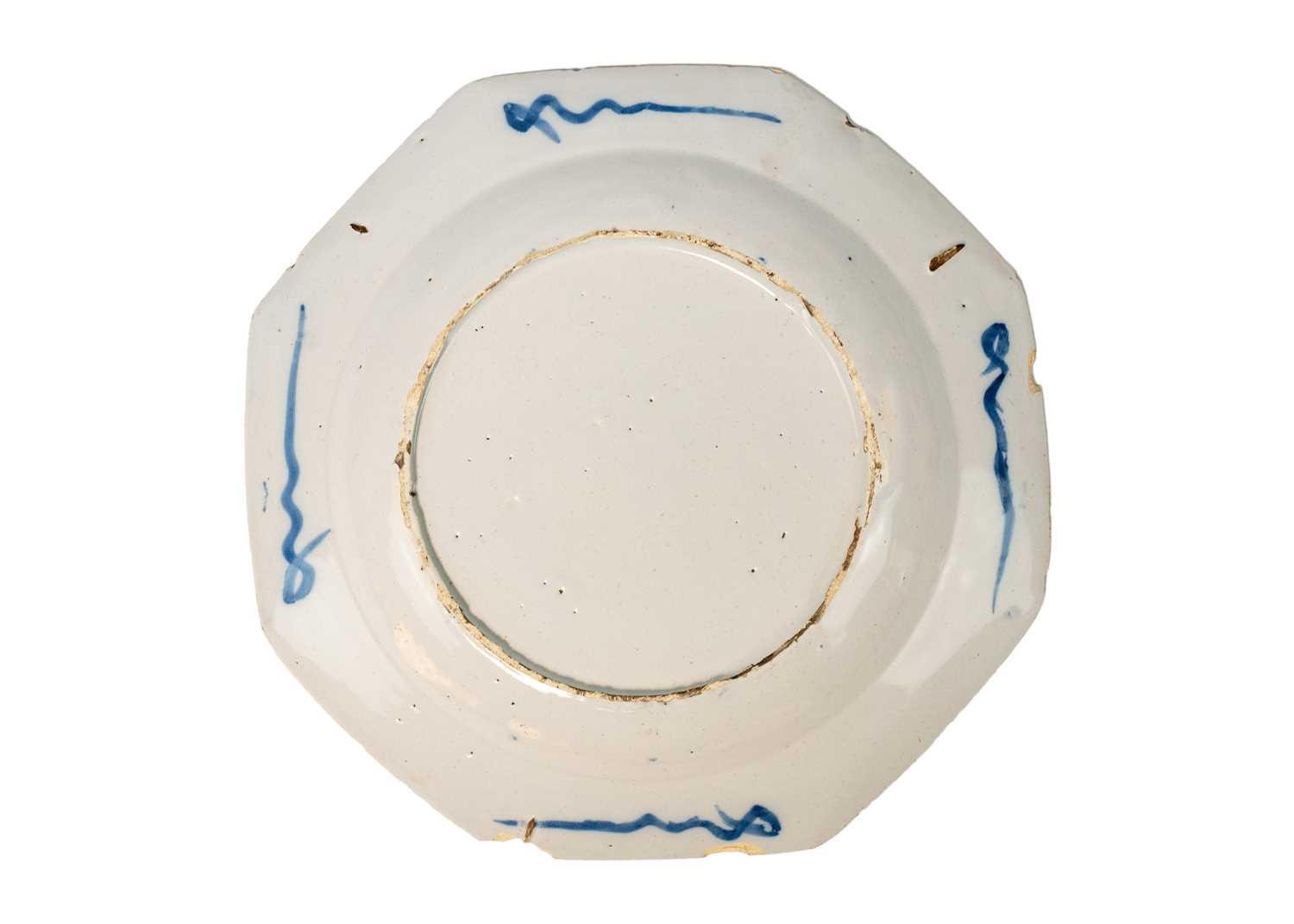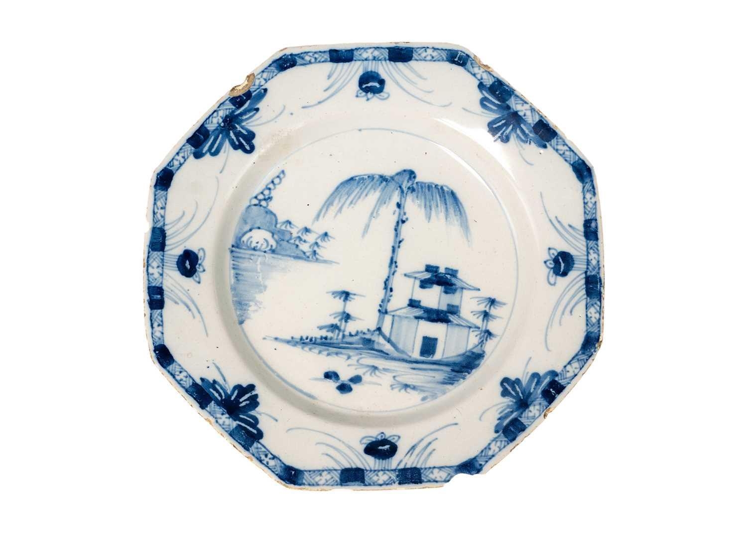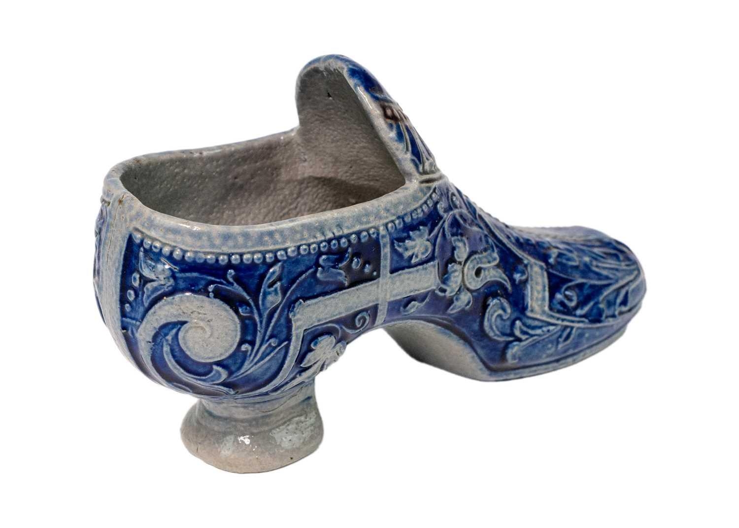 An English Delft hexagonal plate. Circa 1770, painted in blue with an unusual decoration of a palm diameter 21.5cm together with a salt glaze stoneware marriage shoe, moulded and painted in blue.