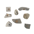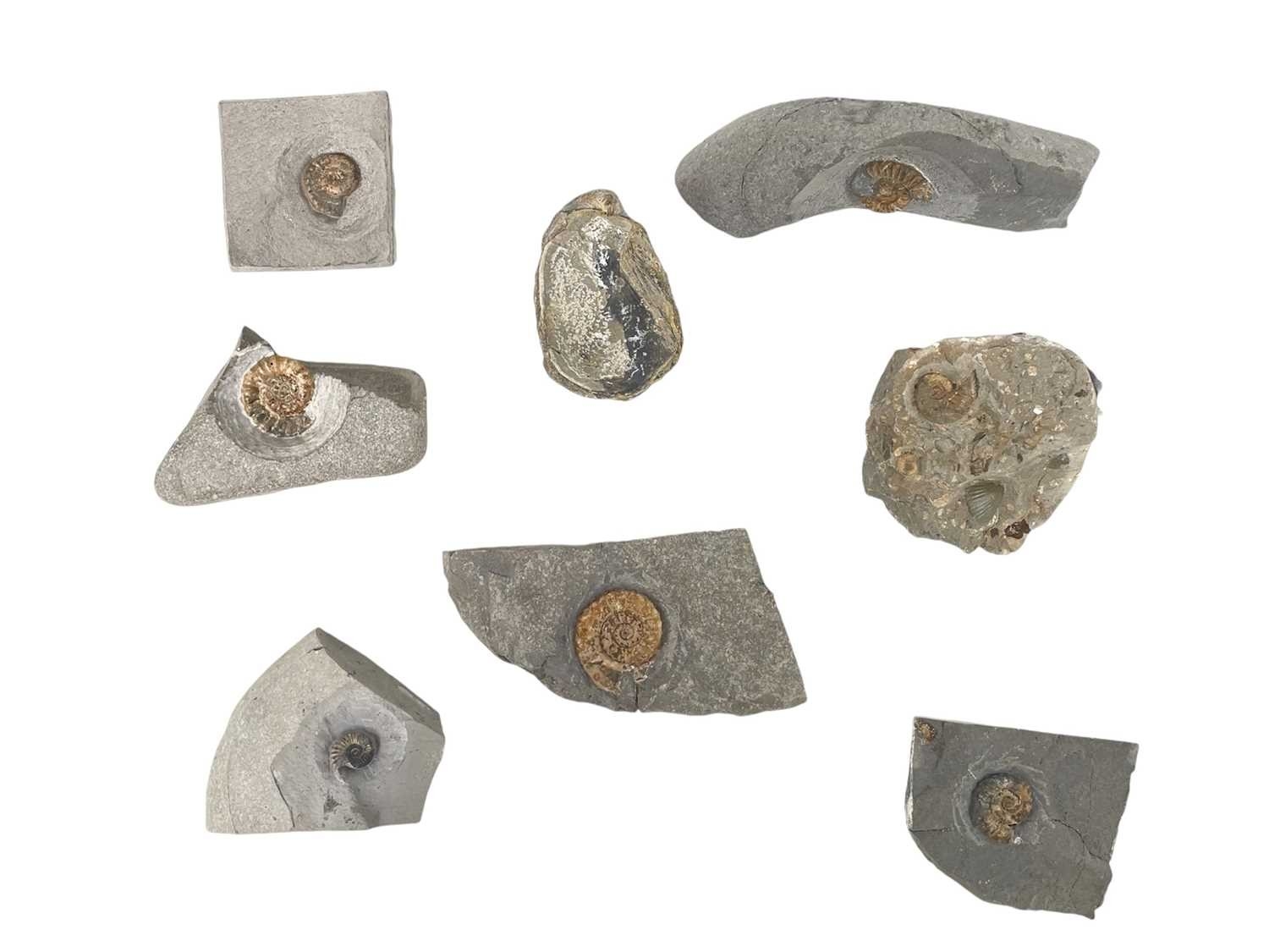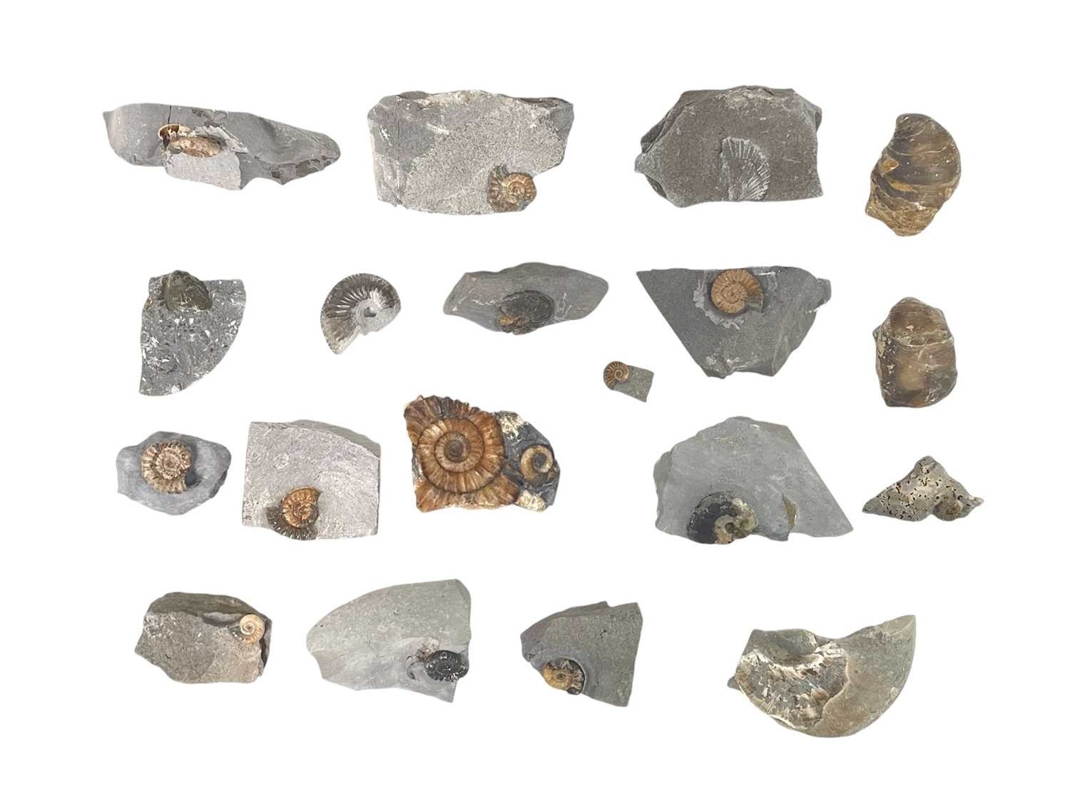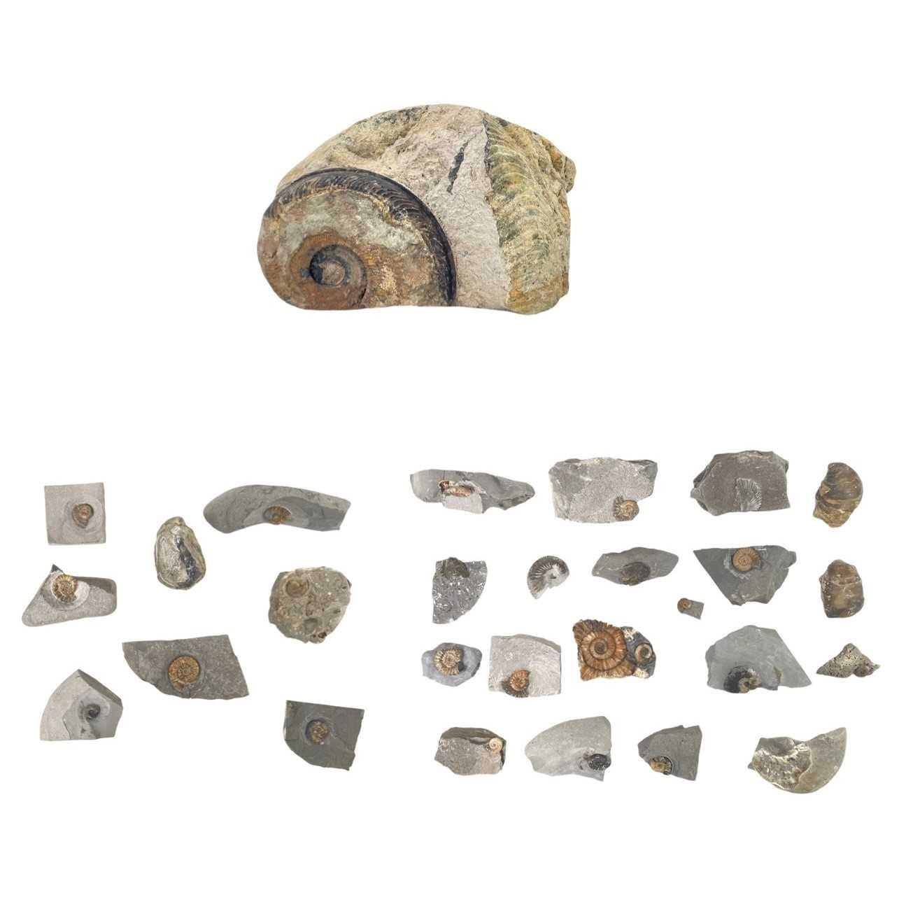 A collection of fossils. To include a large Harpoceras, and various other ammonite genera labelled with names and where they were discovered. (28)