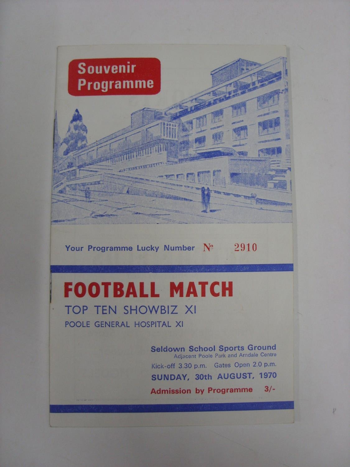 AT SELDOWN SCHOOL, 1970/1971, a football programme from the Charity Match, Top Ten Showbiz XI versus Poole General Hospital, played on 30/08/1970, includes BobbY Smith [England], Kevin O'Shea [Limerick City], Dick Richardson [Boxer], Ed Stewart [DJ], John Peel [DJ]. The Referee was Johnny Bond, manager of Borunemouth, ex West Ham United player. Estimate: £8/£10 - Opening Bid: £6
