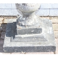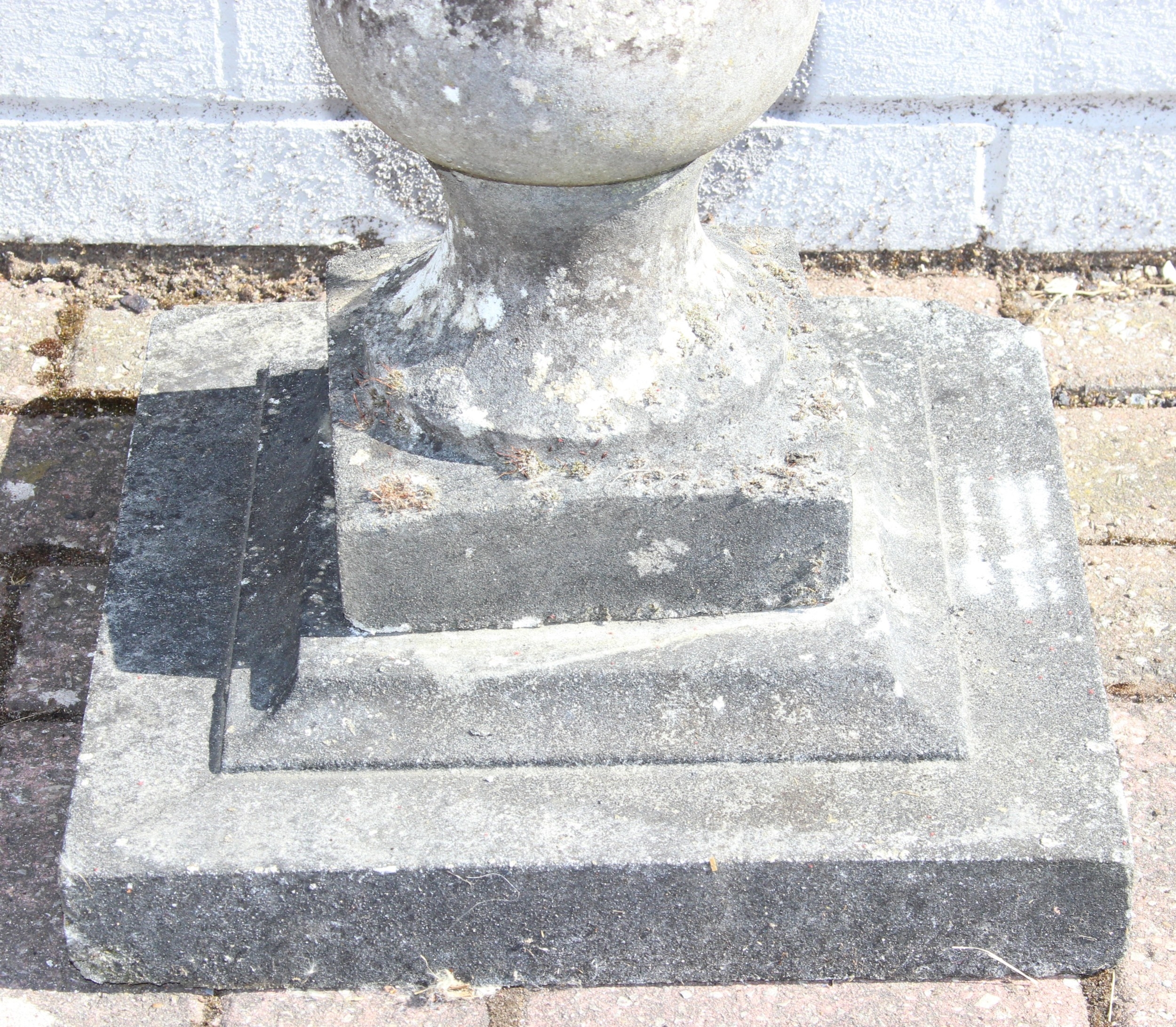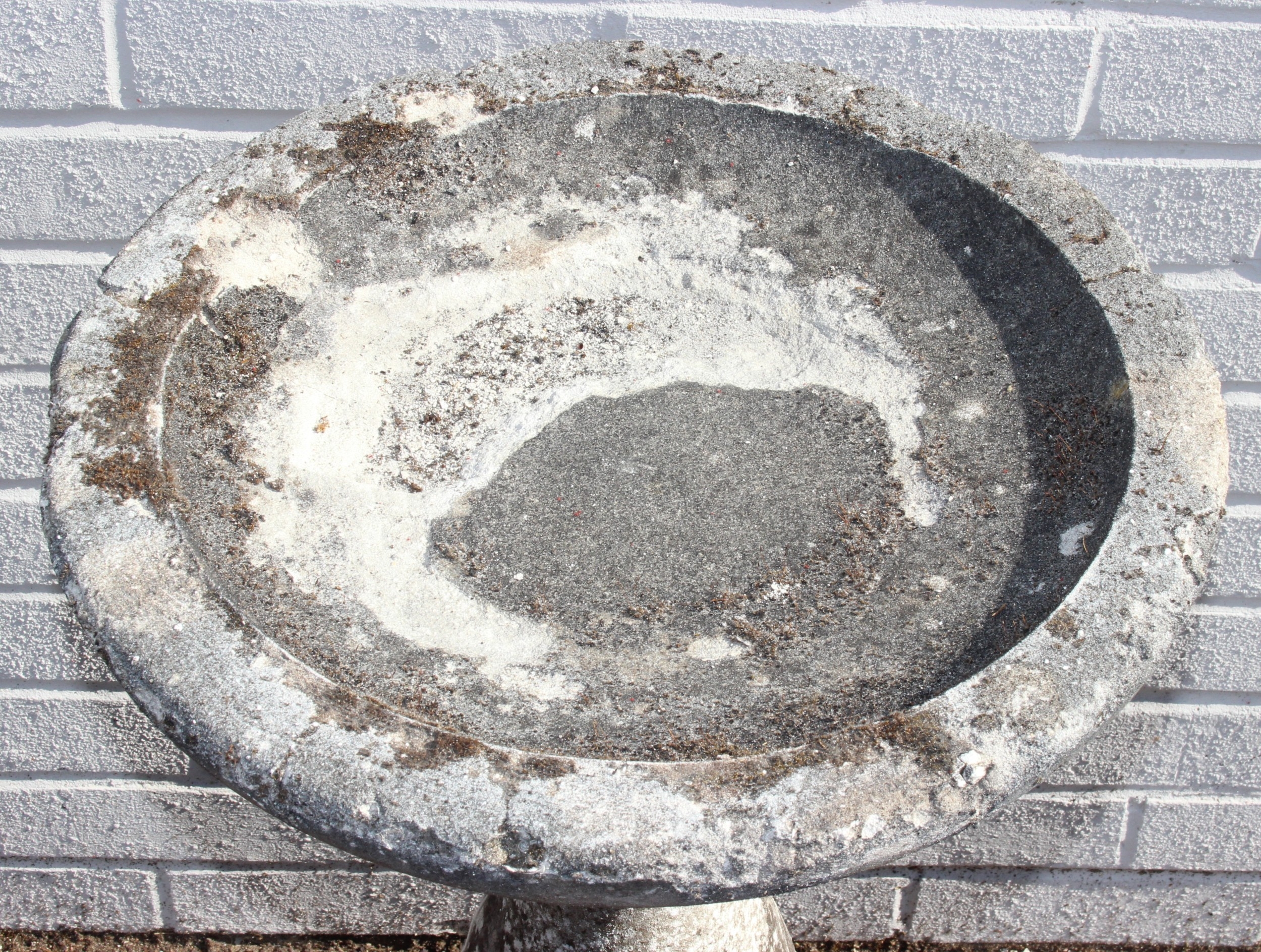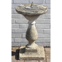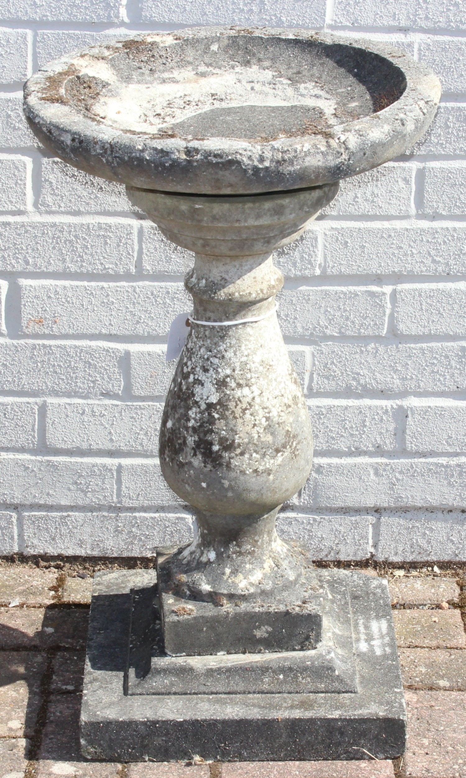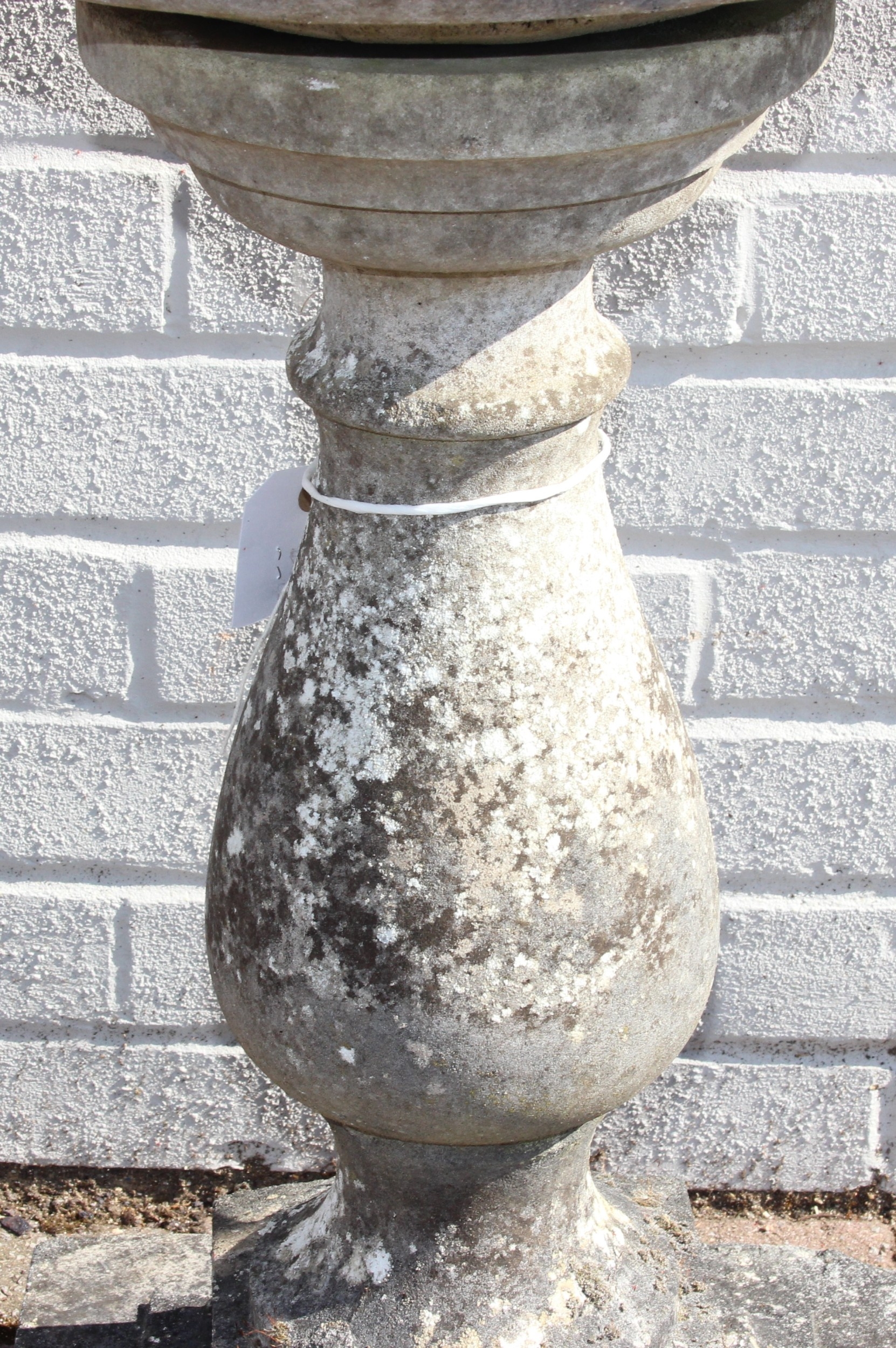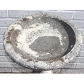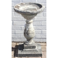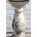 A weathered stone birdbath with baluster column, 44cm in diameter x 72cm tall