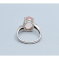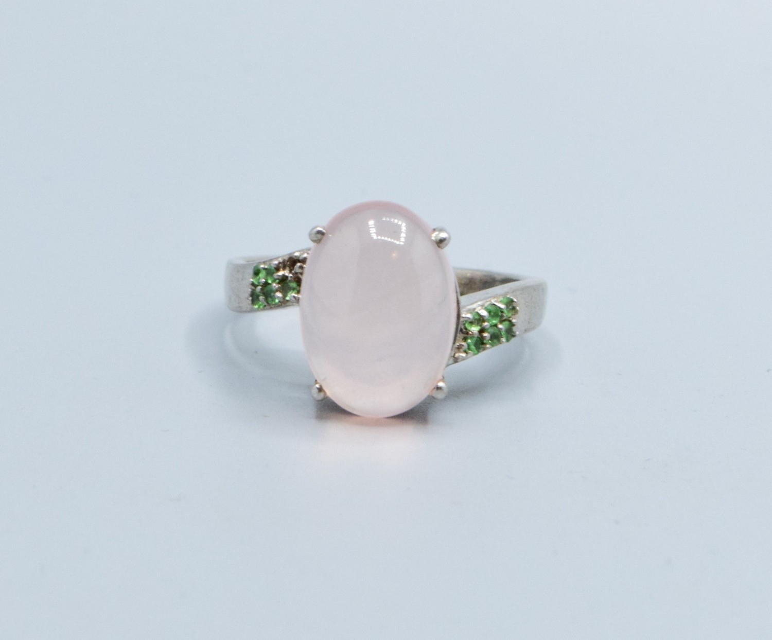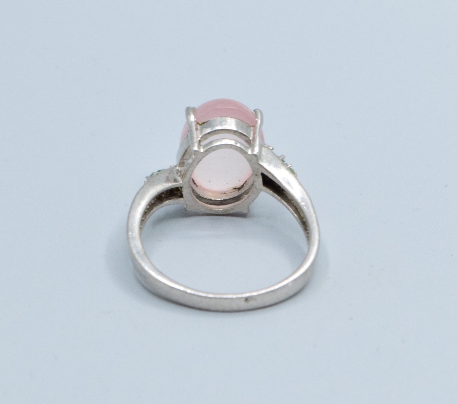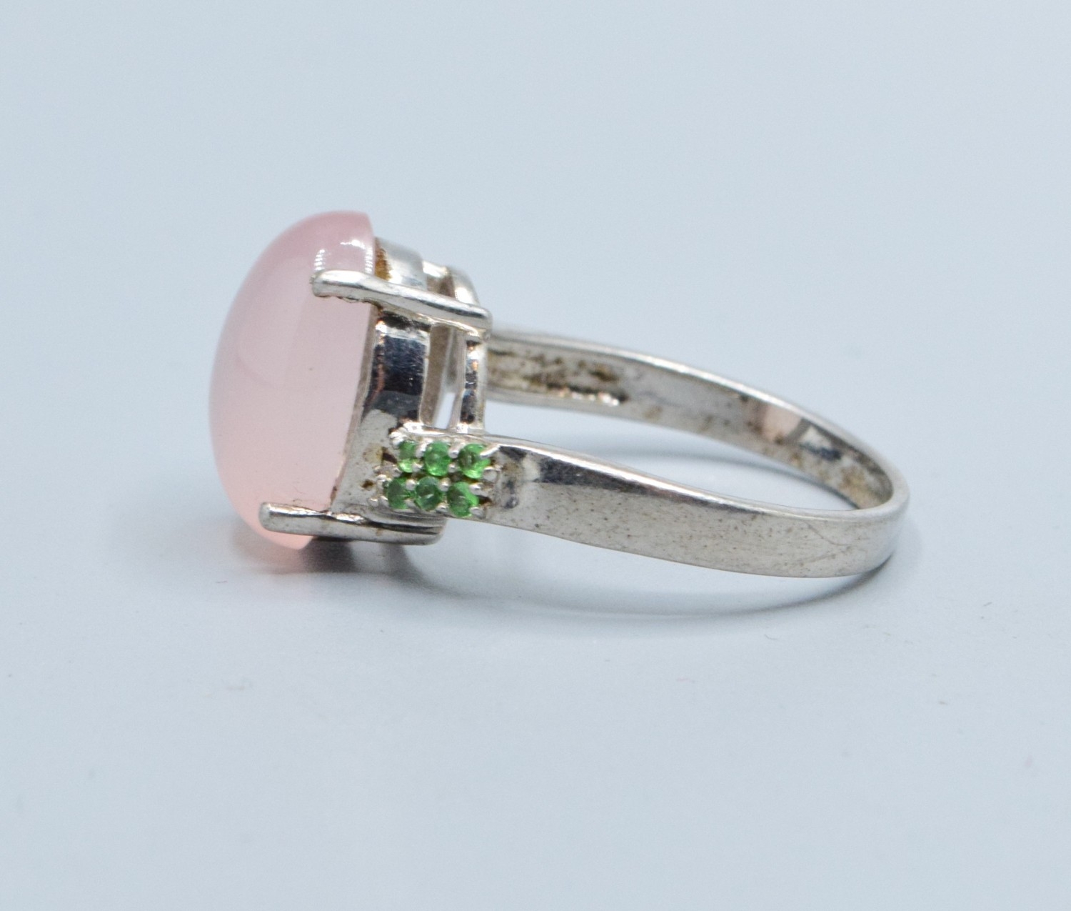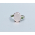 925 silver ladies cabochon Rose Quarts dress ring with green gem stone decoration (note 1 small stone missing) size S