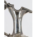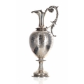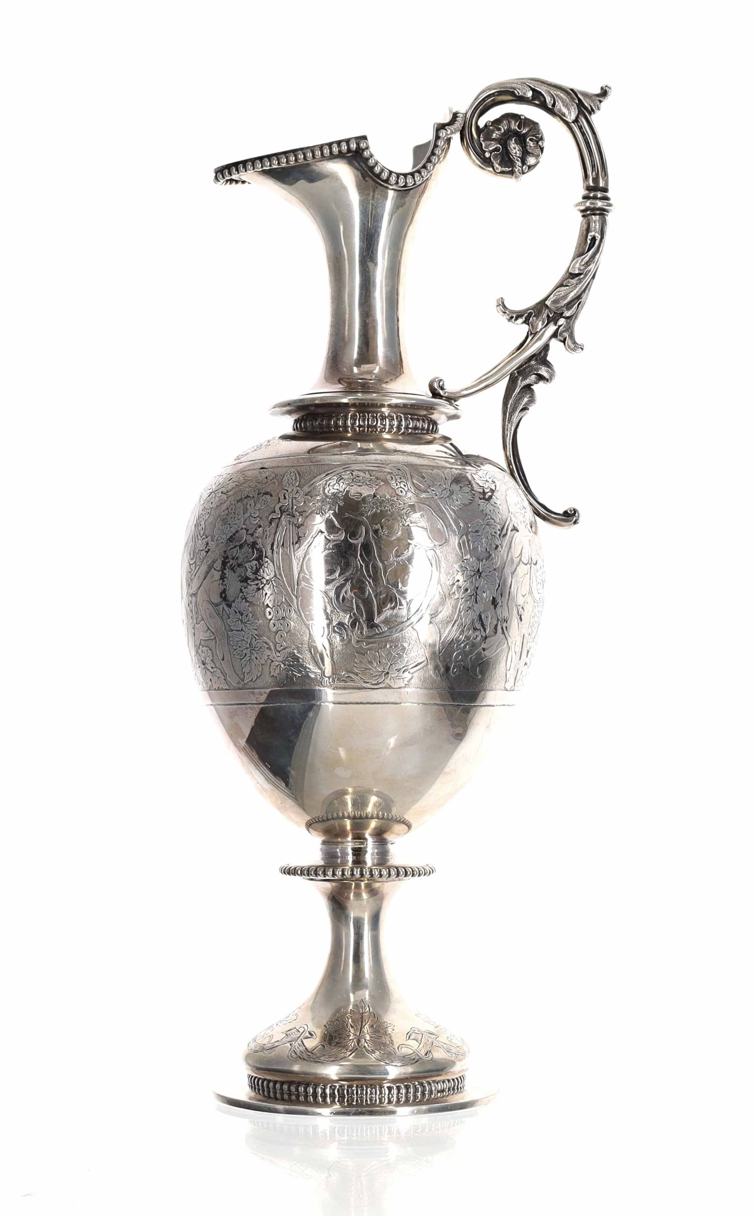 Victorian silver claret jug, the cast leaf capped handle and hinged cover over an engraved decorated body with putti among vines raised on a beaded knopped stem and engraved foot, makers mark rubbed indistinct, marks for London 1874, 14.5" high, 31.8oz t