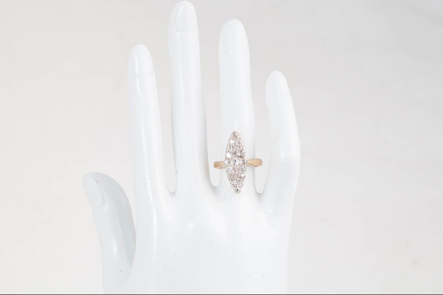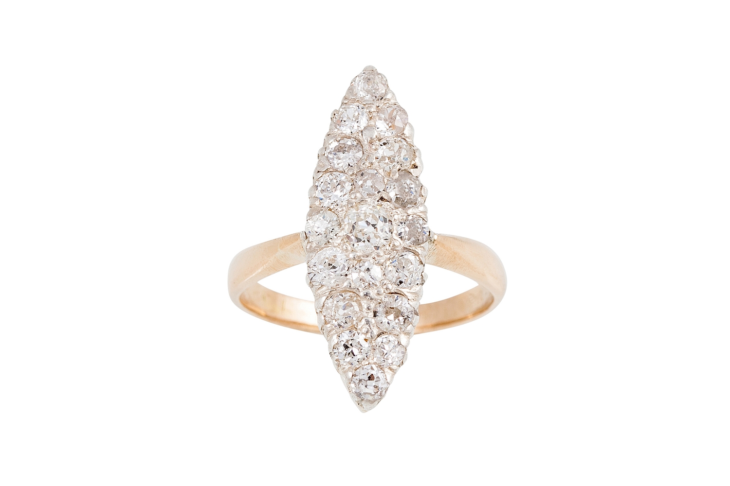 A DIAMOND CLUSTER RING, of navette form, the brilliant cut diamonds mounted in 14ct gold and silver. Estimated: weight of diamonds; 1.54 ct, colour and clarity; H - J, SI - P, size L - M