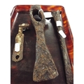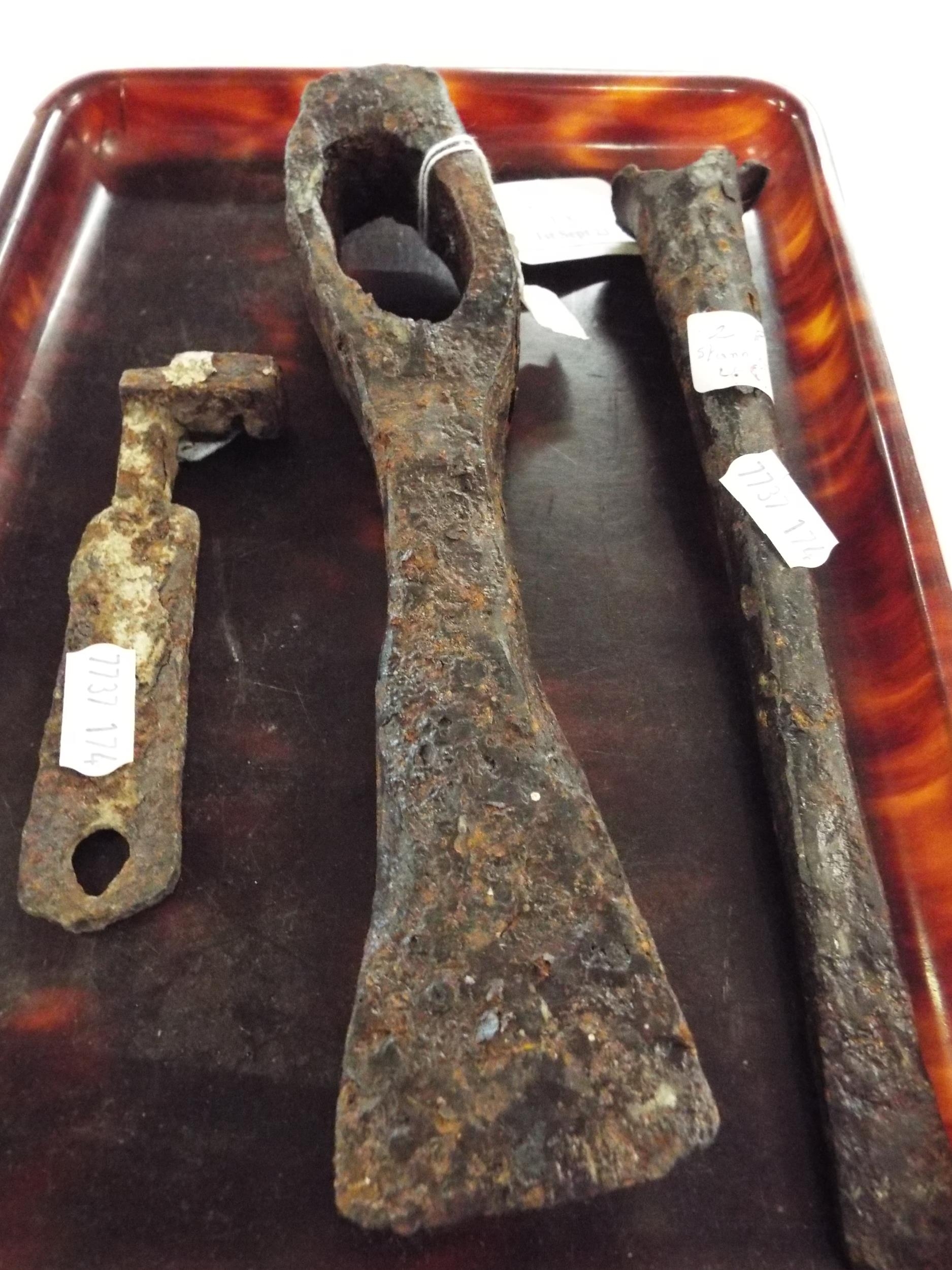 A metal detector find medieval iron casket key, chisel and later pick head