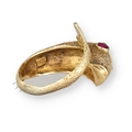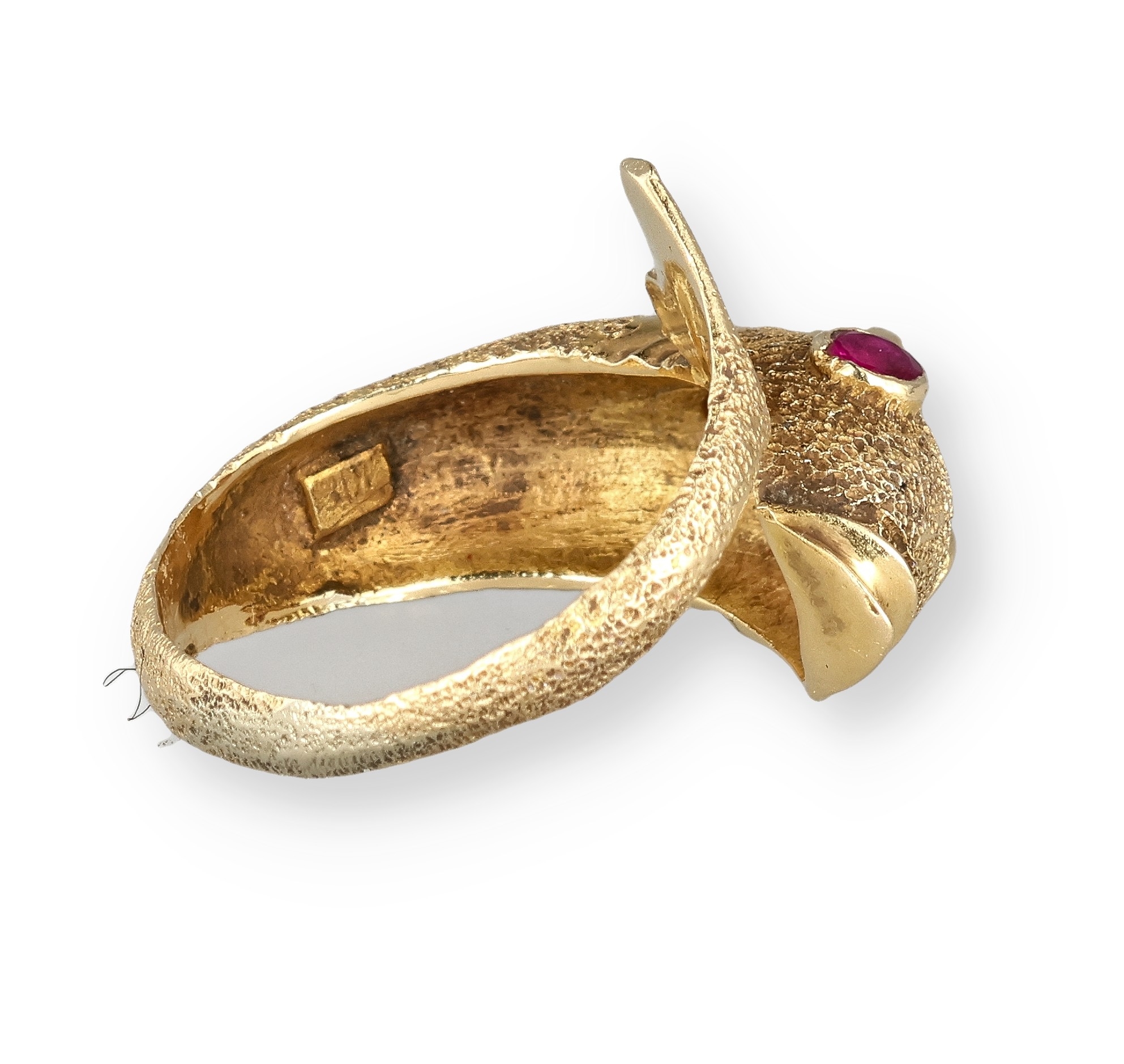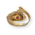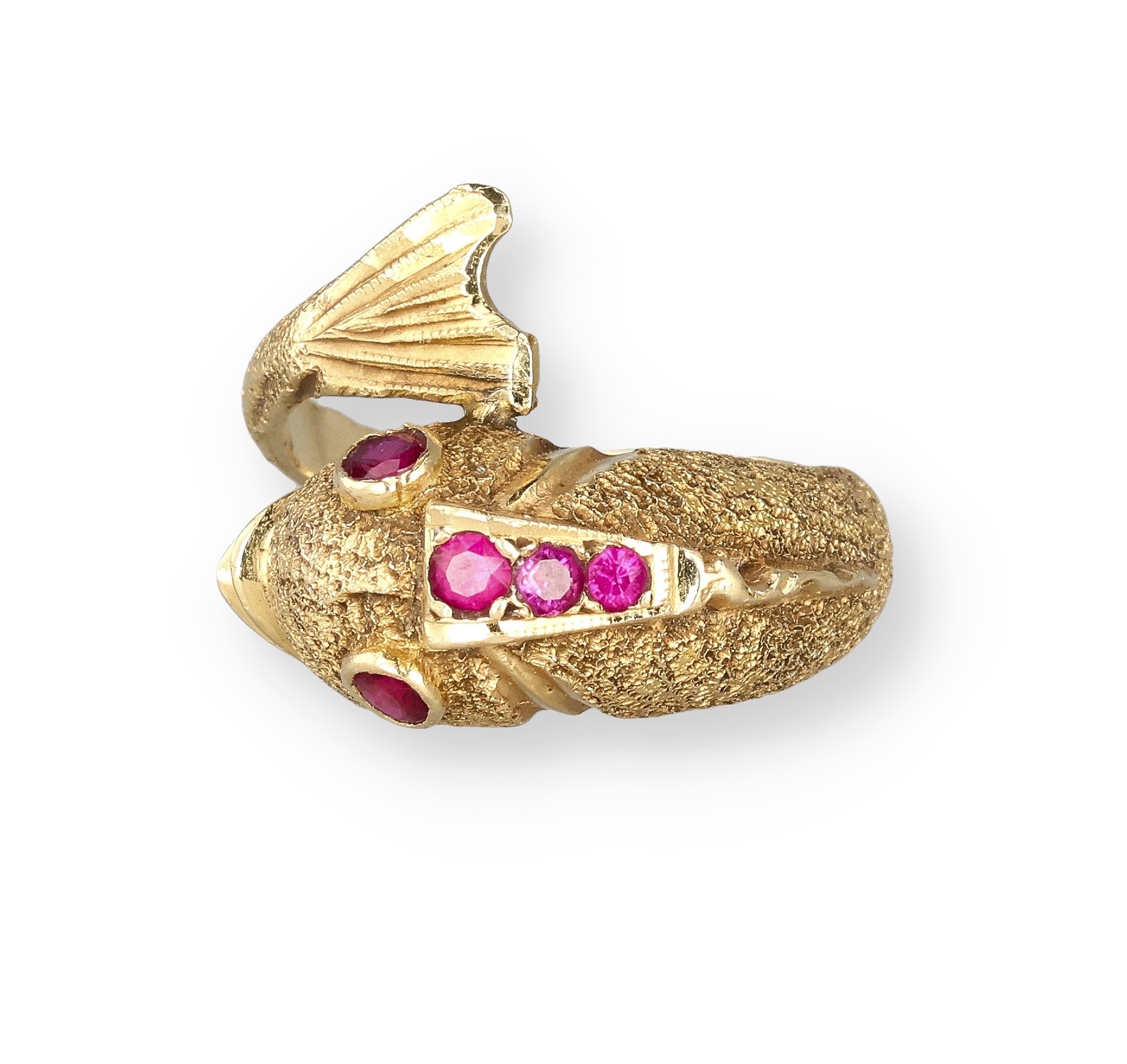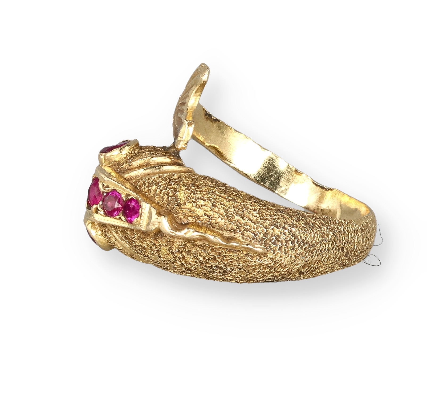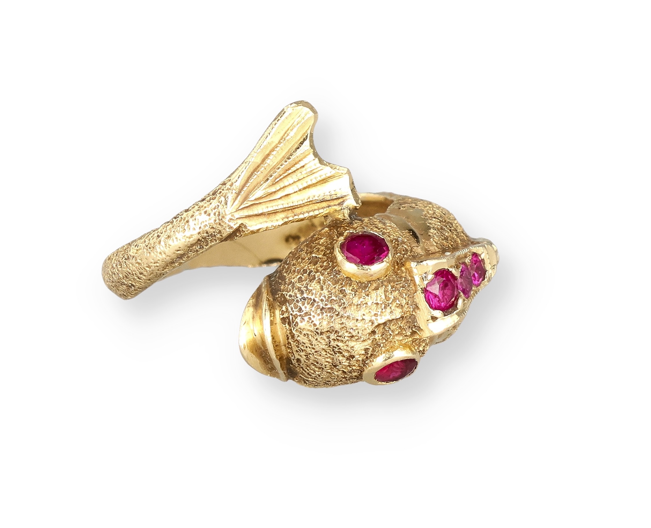 AN 18 CARAT GOLD DRESS RING, CAST AS A DOLPHIN, WITH TEXTURED FINISH AND SET WITH FIVE RUBIES