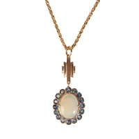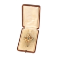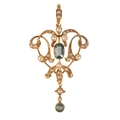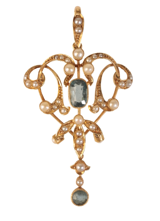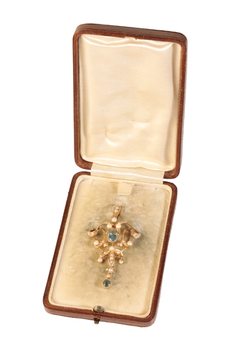 BELLE EPOQUE A 15CT YELLOW GOLD, AQUAMARINE AND SEED PEARL PENDANT, in a fitted presentation case