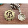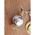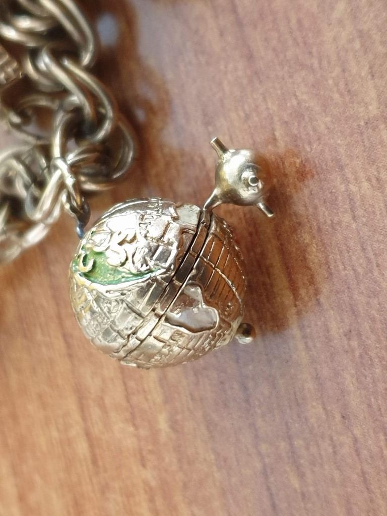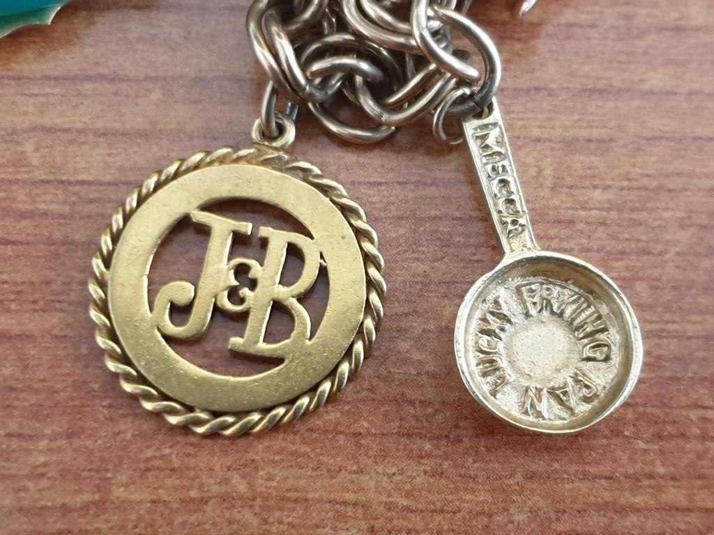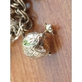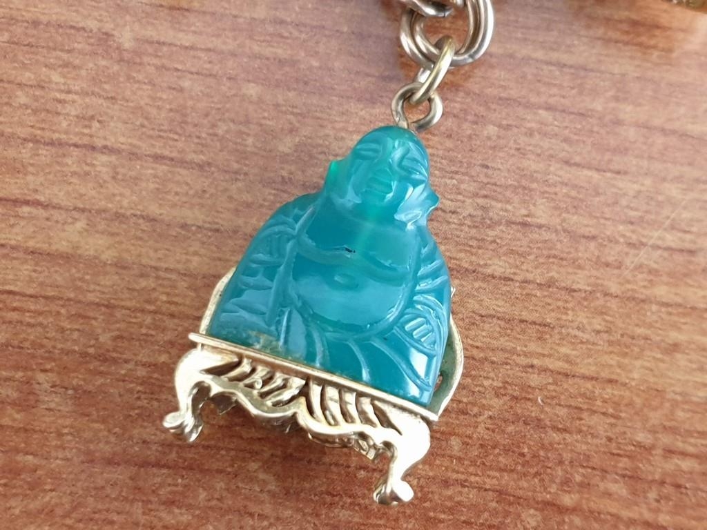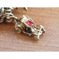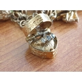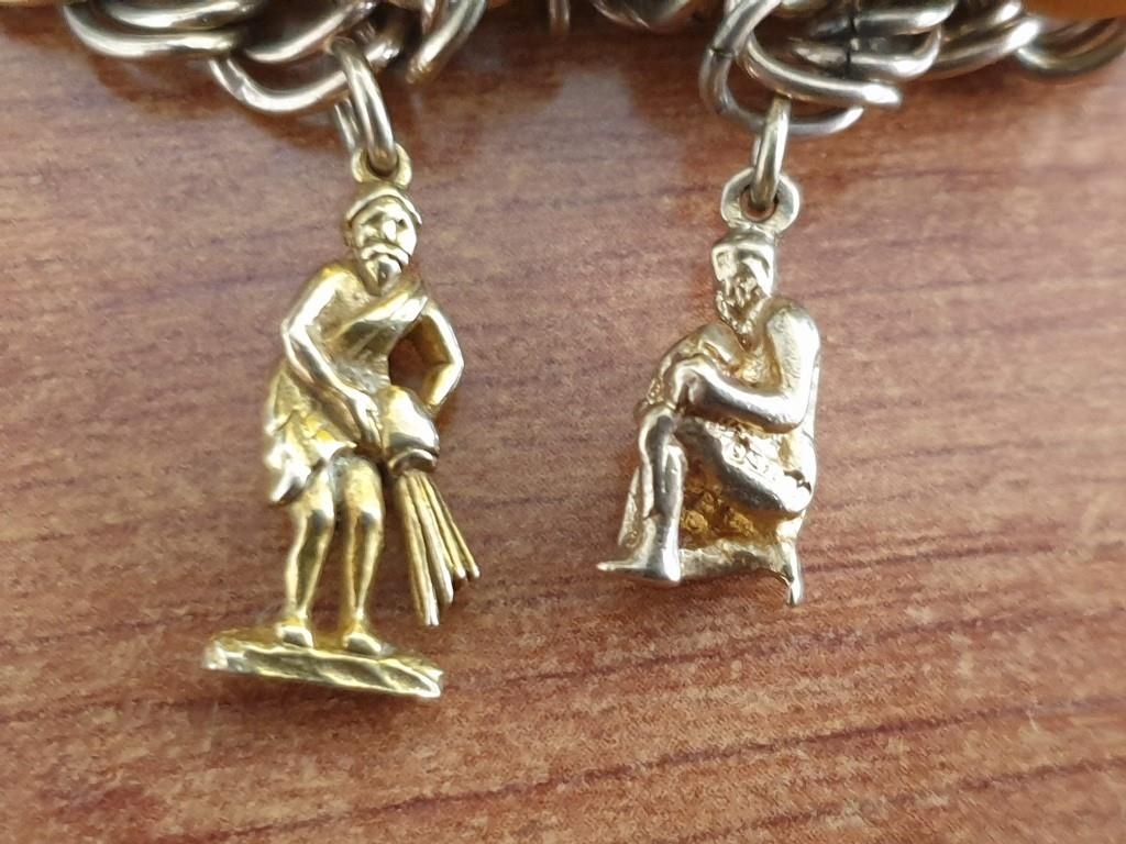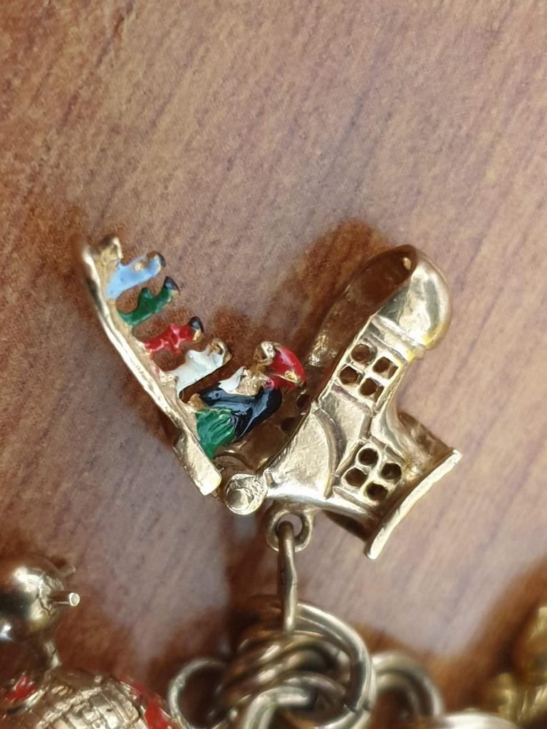 9ct Gold Double Link Charm Bracelet with Safety Chain, Complete with Collection of 9ct Gold (.375) Charms. Including: Heart Shaped Locket with Miniature Set 3-Stone Ring, Boot with Hinged Sole and Painted Figures Inside, Green Stone Buddha on Gold Seat, Globe with Revolving Moon, 1964 "Mecca" Frying Pan, Car, Jug, Boot, etc. Total Weight 63.6g