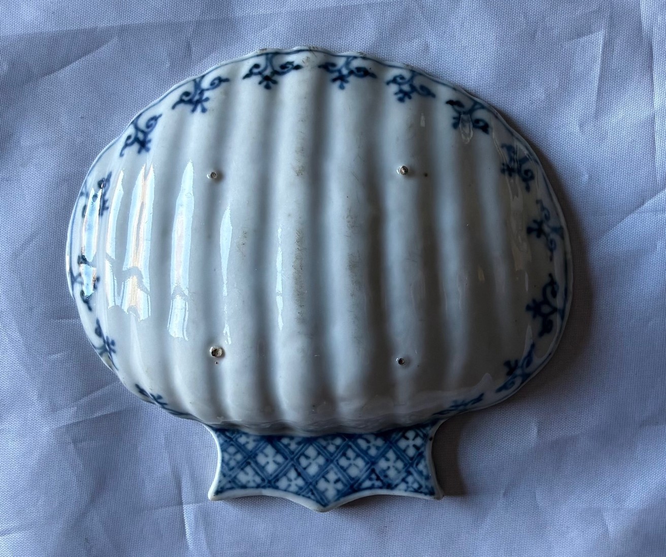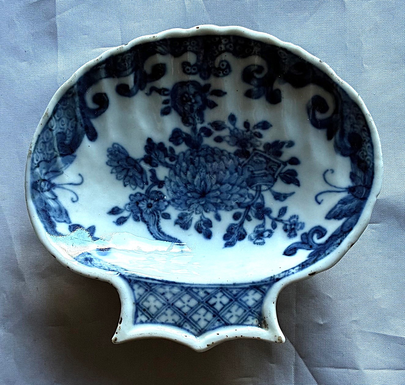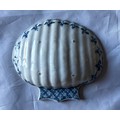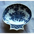 18th century Chinese export scallop shaped dish, with painted blue and white decoration to the front and verso, 9.5 x 9cm.
