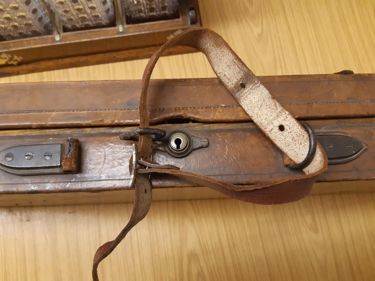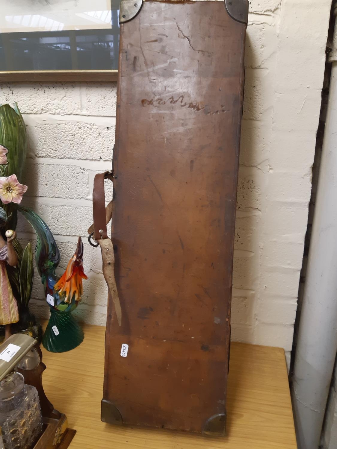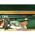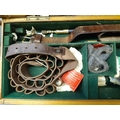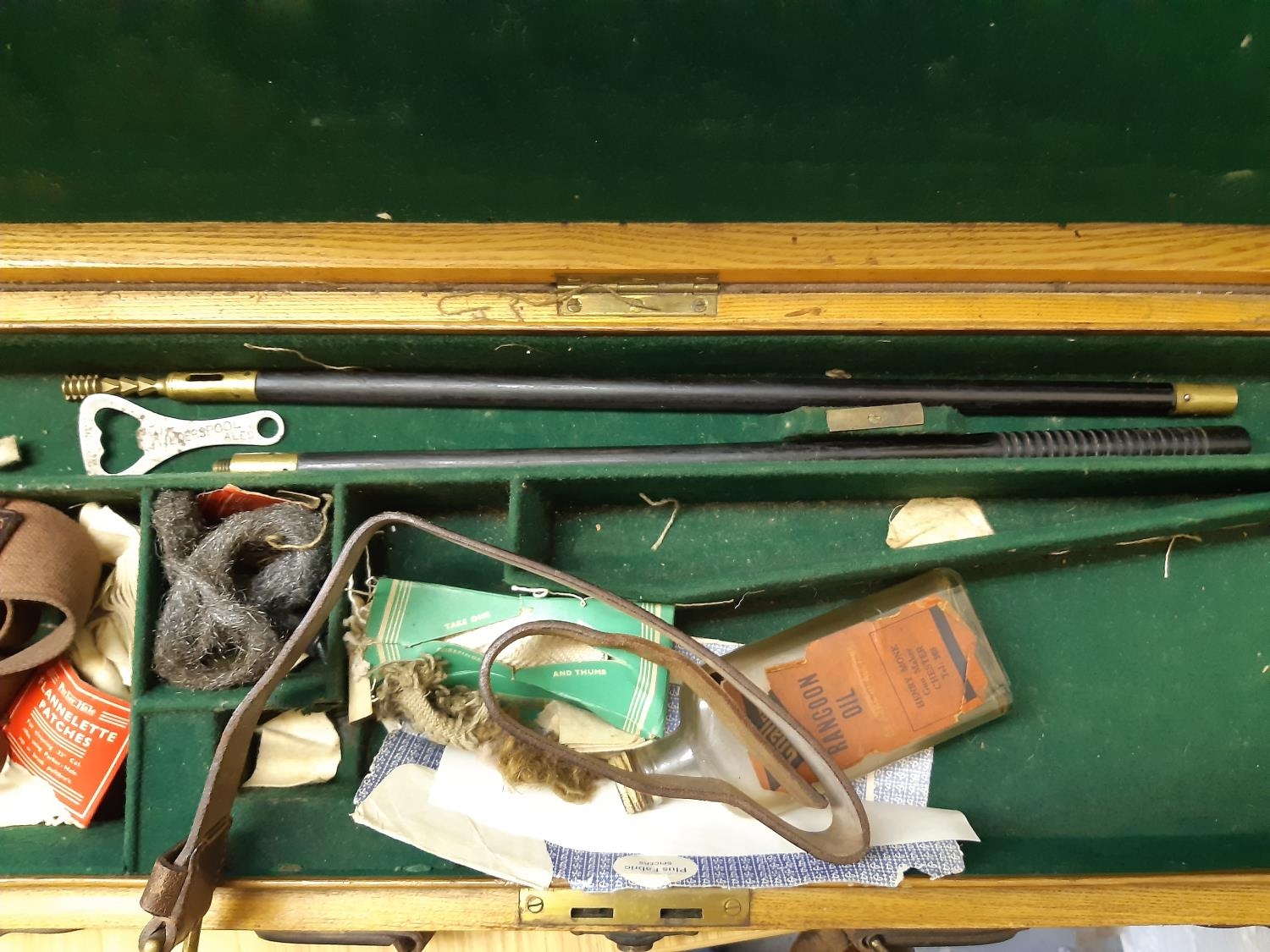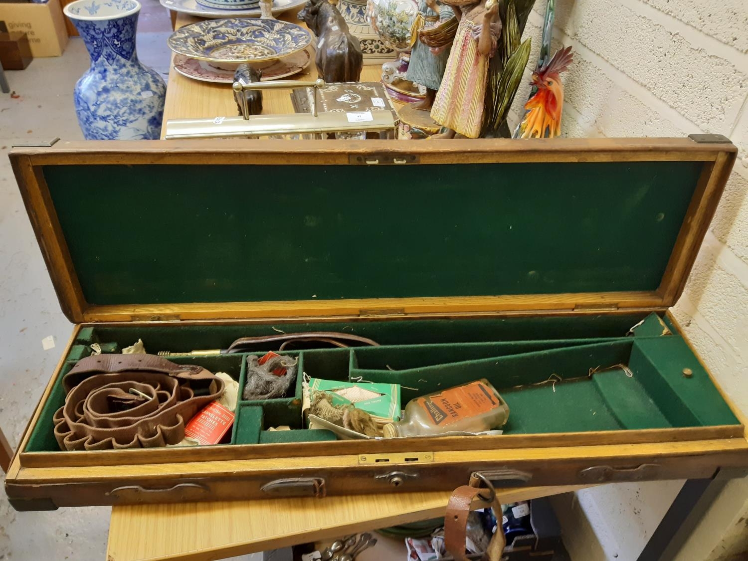 A late 19th/early 20th century brown leather shotgun case, the exterior having heavy duty brass corners with working lock (no key), monogrammed “JBP” to top, green felt interior and various shooting accessories to include belts, cleaning kit etc.
