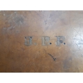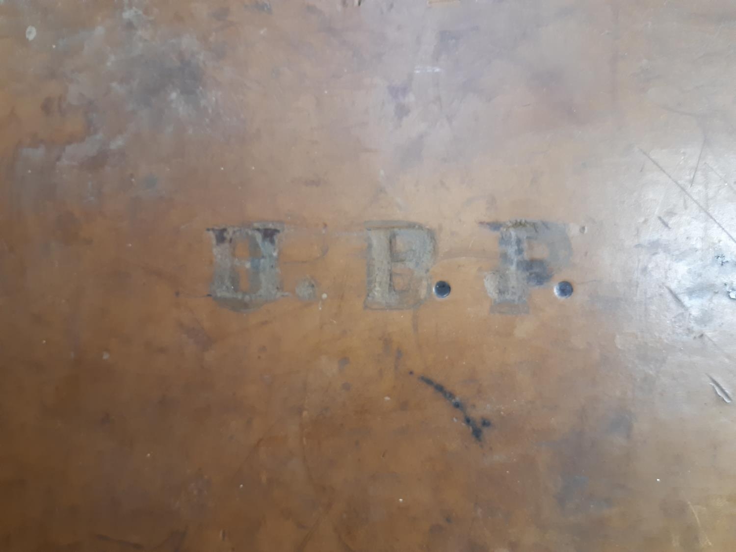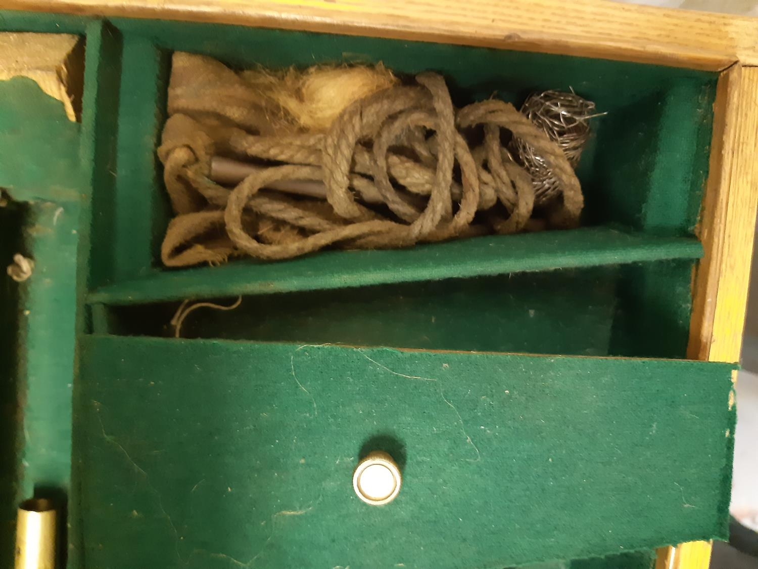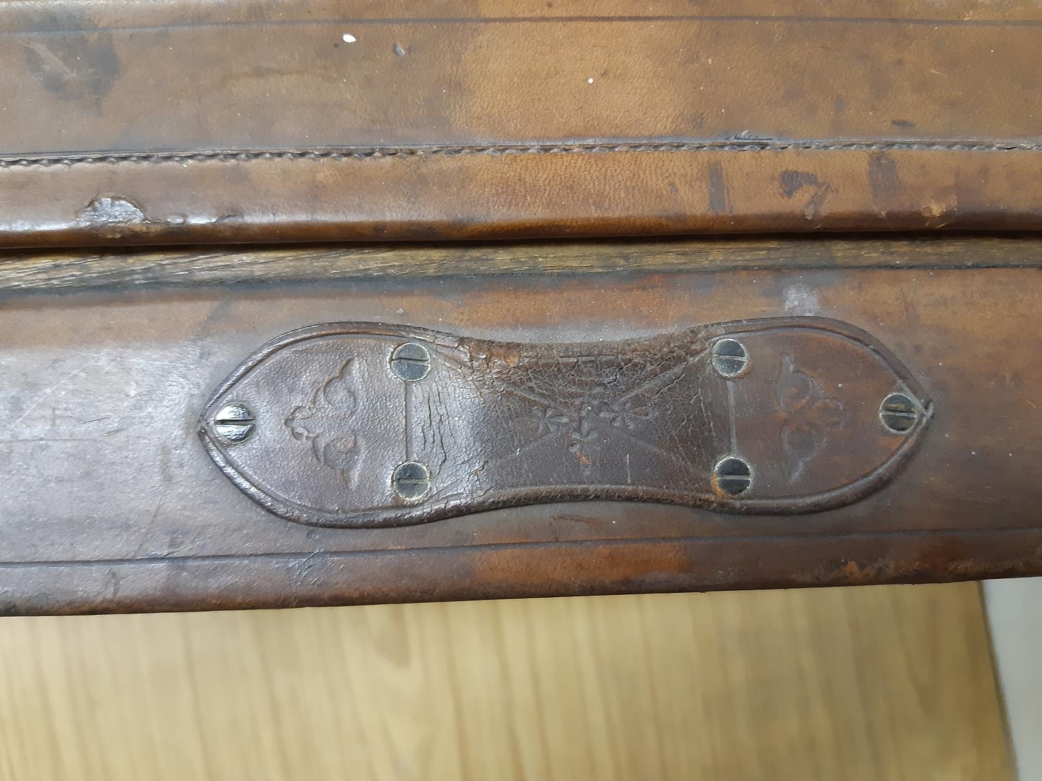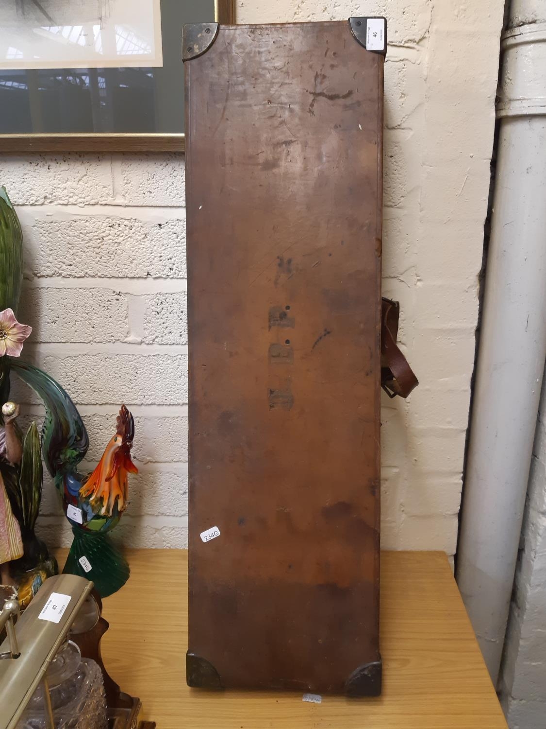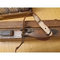 A late 19th/early 20th century brown leather shotgun case, the exterior having heavy duty brass corners with working lock (no key), monogrammed “JBP” to top, green felt interior and various shooting accessories to include belts, cleaning kit etc.