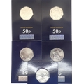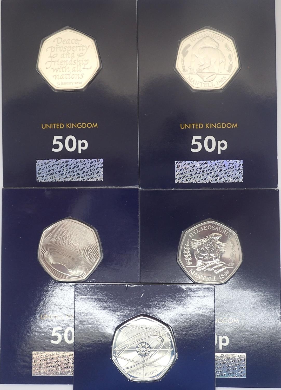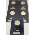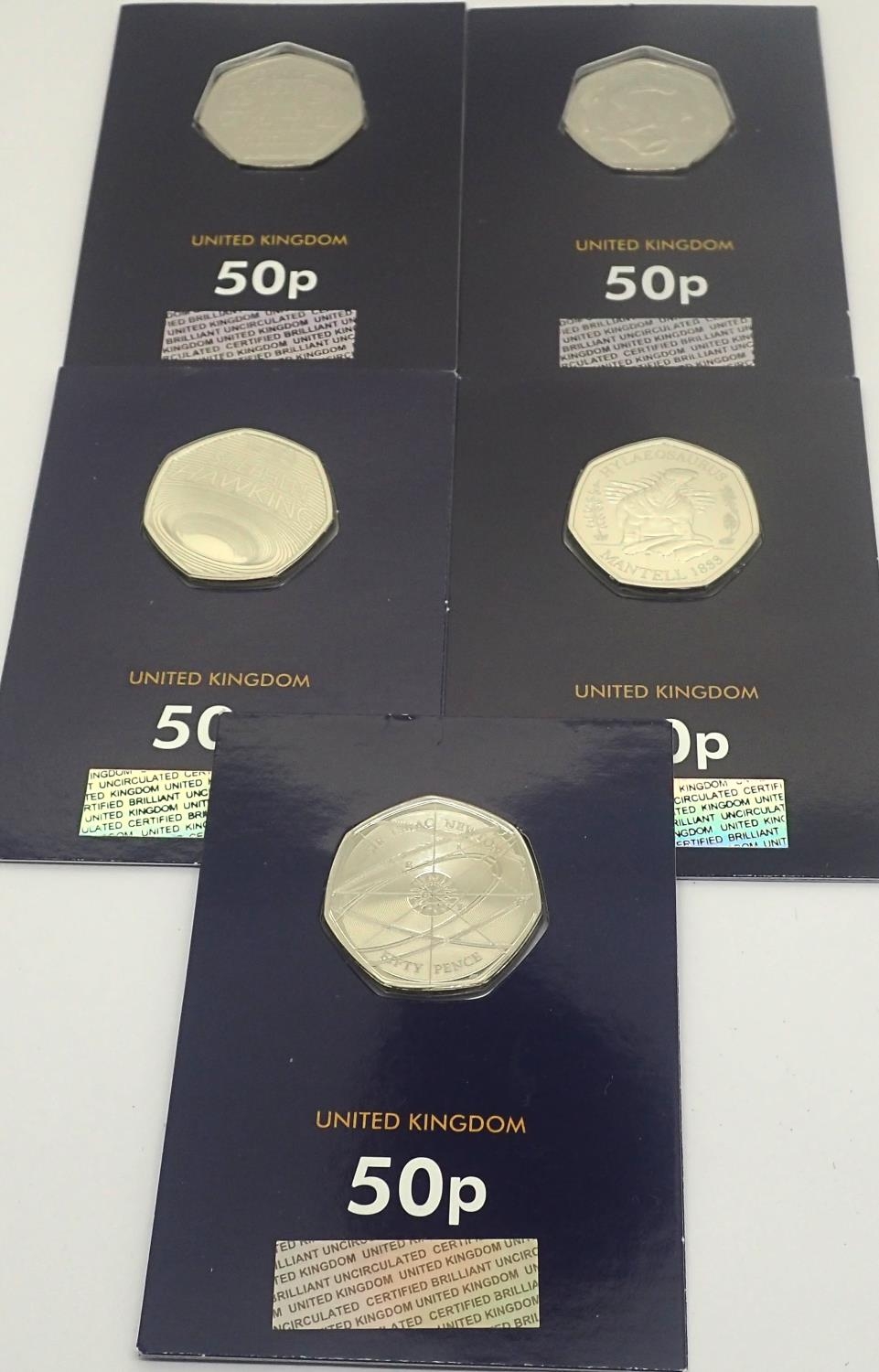 Change Checker: Five uncirculated 50p coins, mixed series, including Stephen Hawking and Isaac Newton. P&P Group 1 (£14+VAT for the first lot and £1+VAT for subsequent lots)
