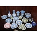 A COLLECTION OF WEDGWOOD JASPERWARE TO INCLUDE A PINK FLAMINGO PATTERN PIN DISH, VASES, TRINKET POTS ETC.