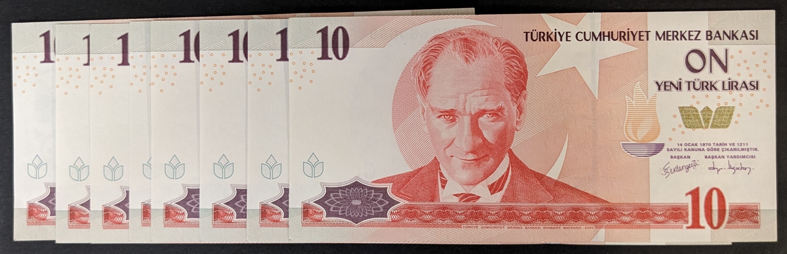 Banknotes; Turkey; 2005 10 New Lira - eight consecutive note...