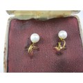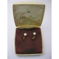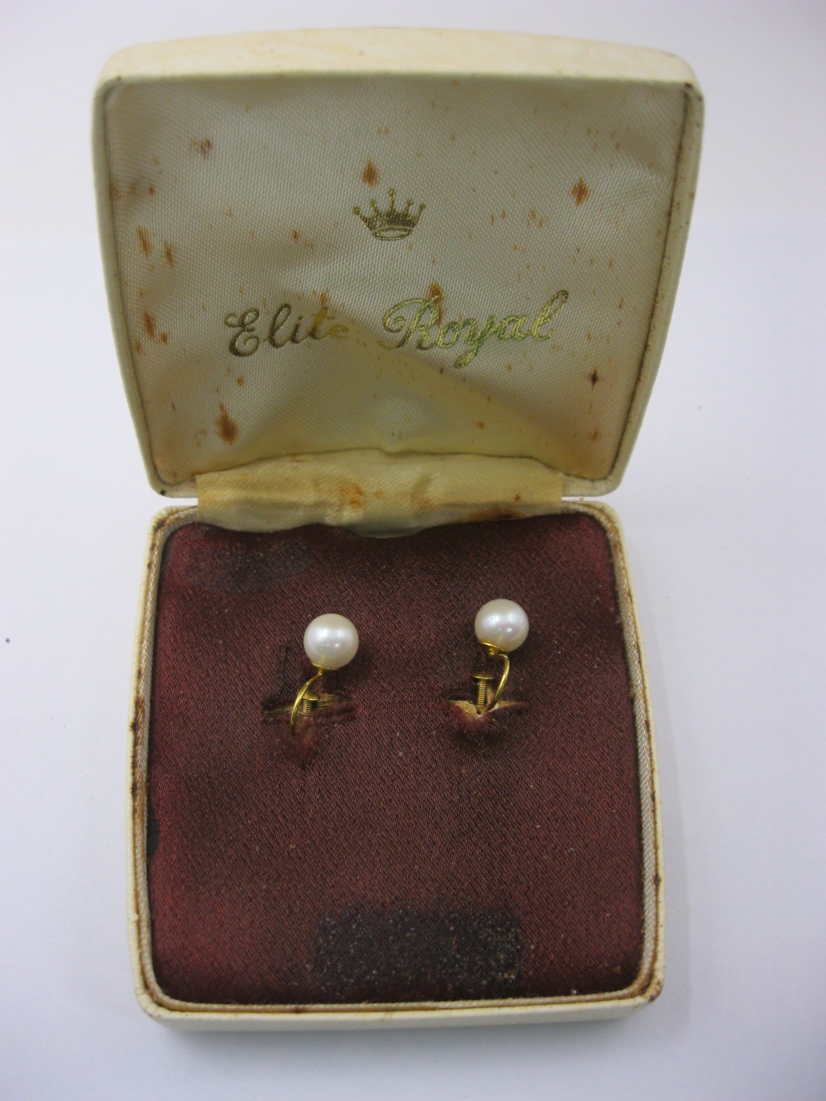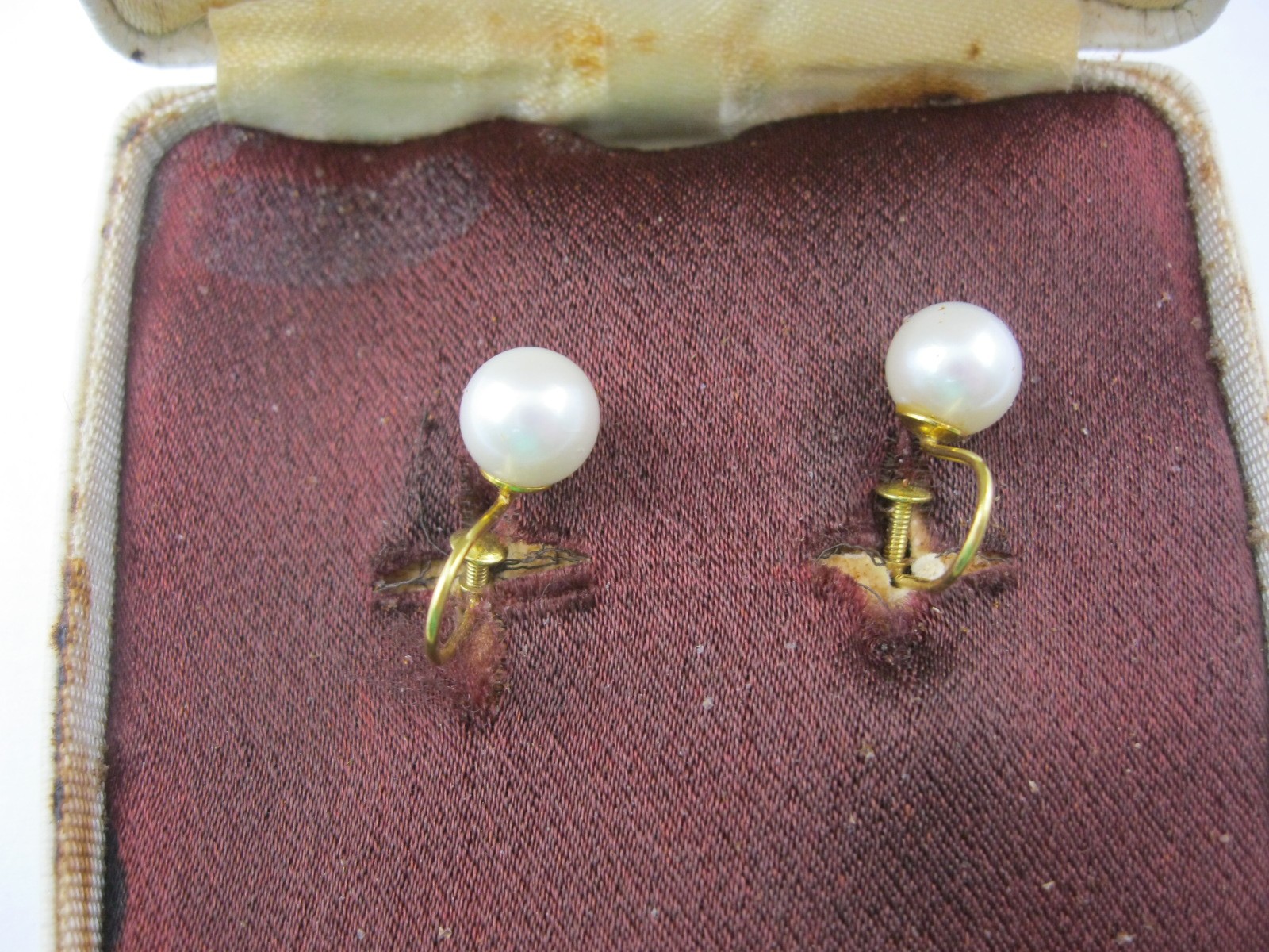 A pair of 9 carat gold solitaire pearl earrings, screw fixing, British hallmarks, combined gross approx. 1.8g. With an a/f presentation box