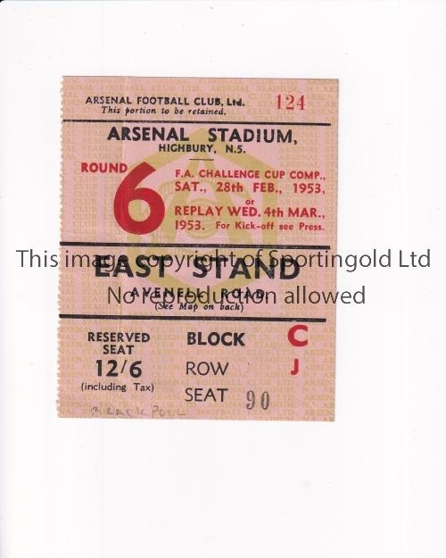 ARSENAL Ticket for the home FA Cup tie v Blackpool 28/2/1953 in Blackpool's successful Cup season, very slightly creased. Generally good