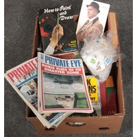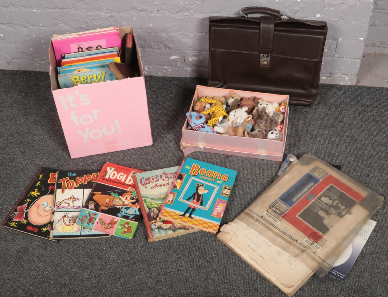 A box of vintage children's annuals, quantity of royal ephemera, box of TY beanie babies and a briefcase.