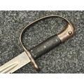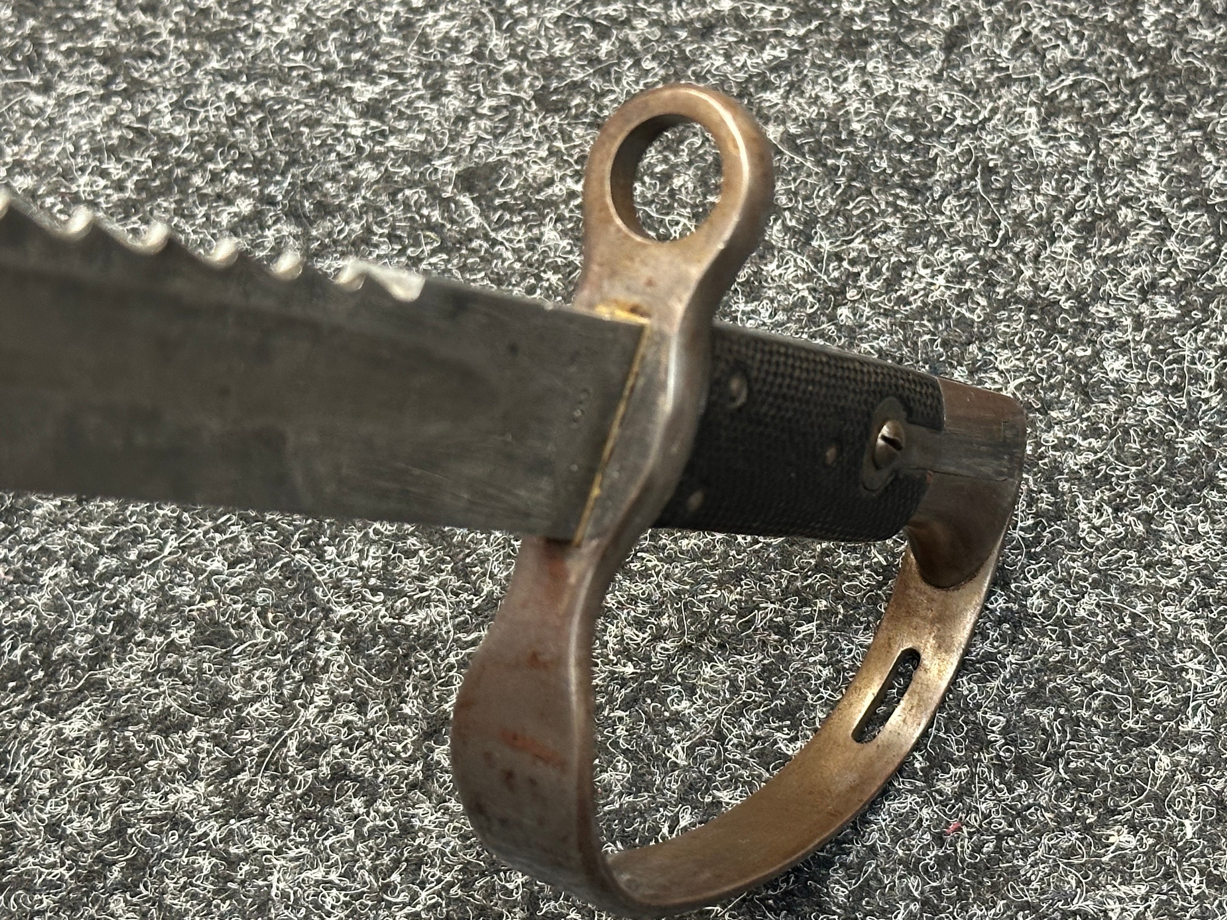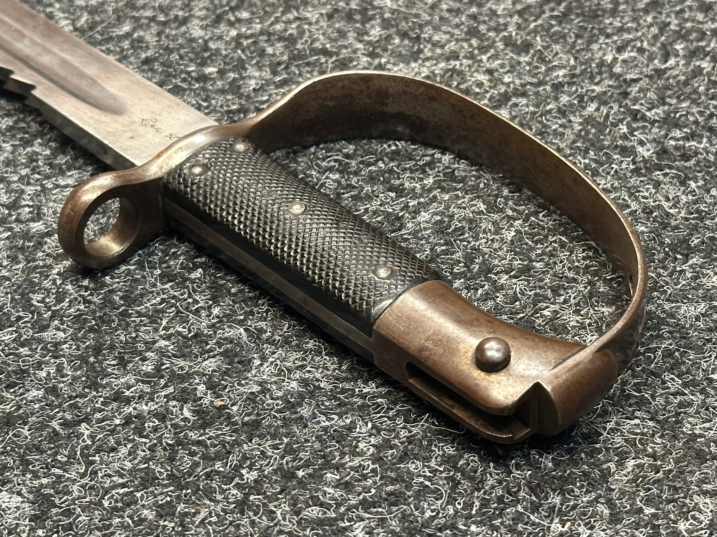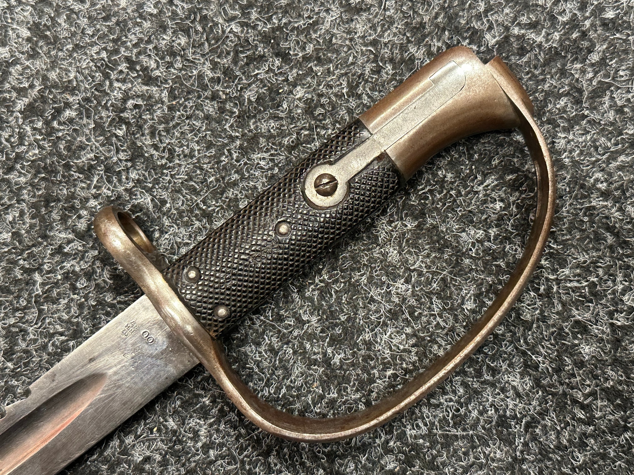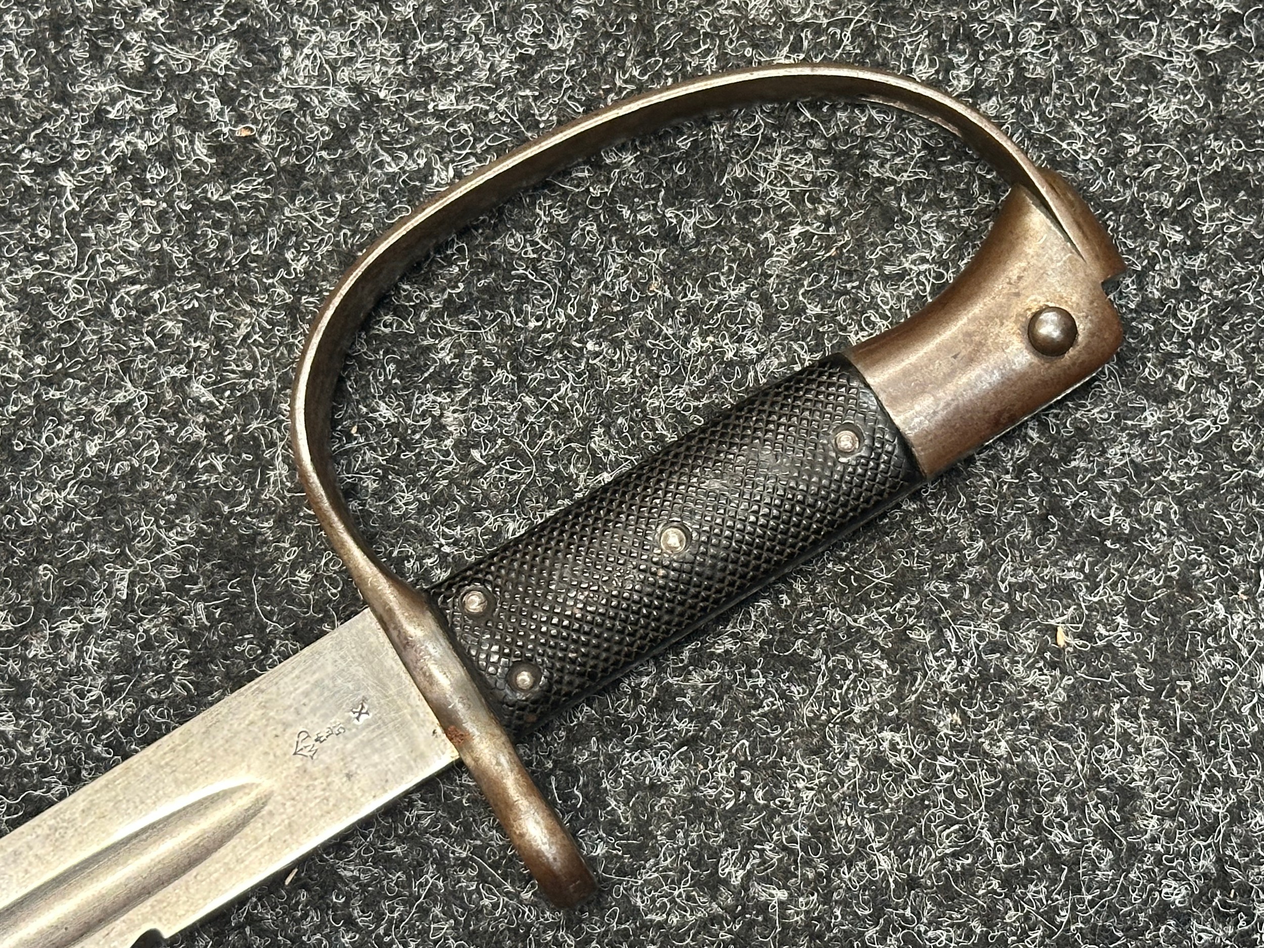 Victorian Martini Henry Artillery Sword Bayonet with fullered 653mm long blade. WD marked and dated 1900. Marked "WR" on spine of blade. Fibre grips with inspection marks. Working release catch. Overall length 795mm. No scabbard.