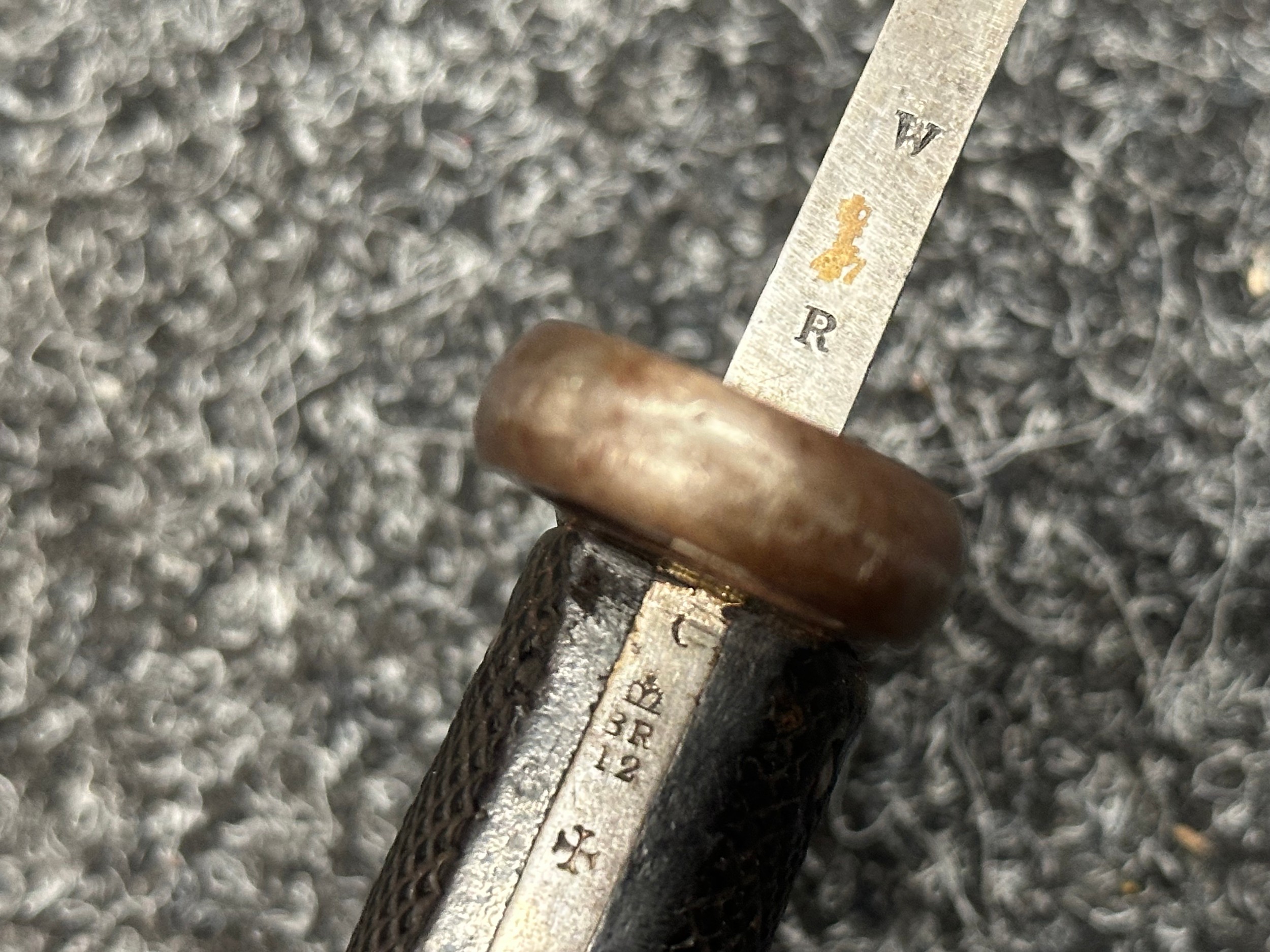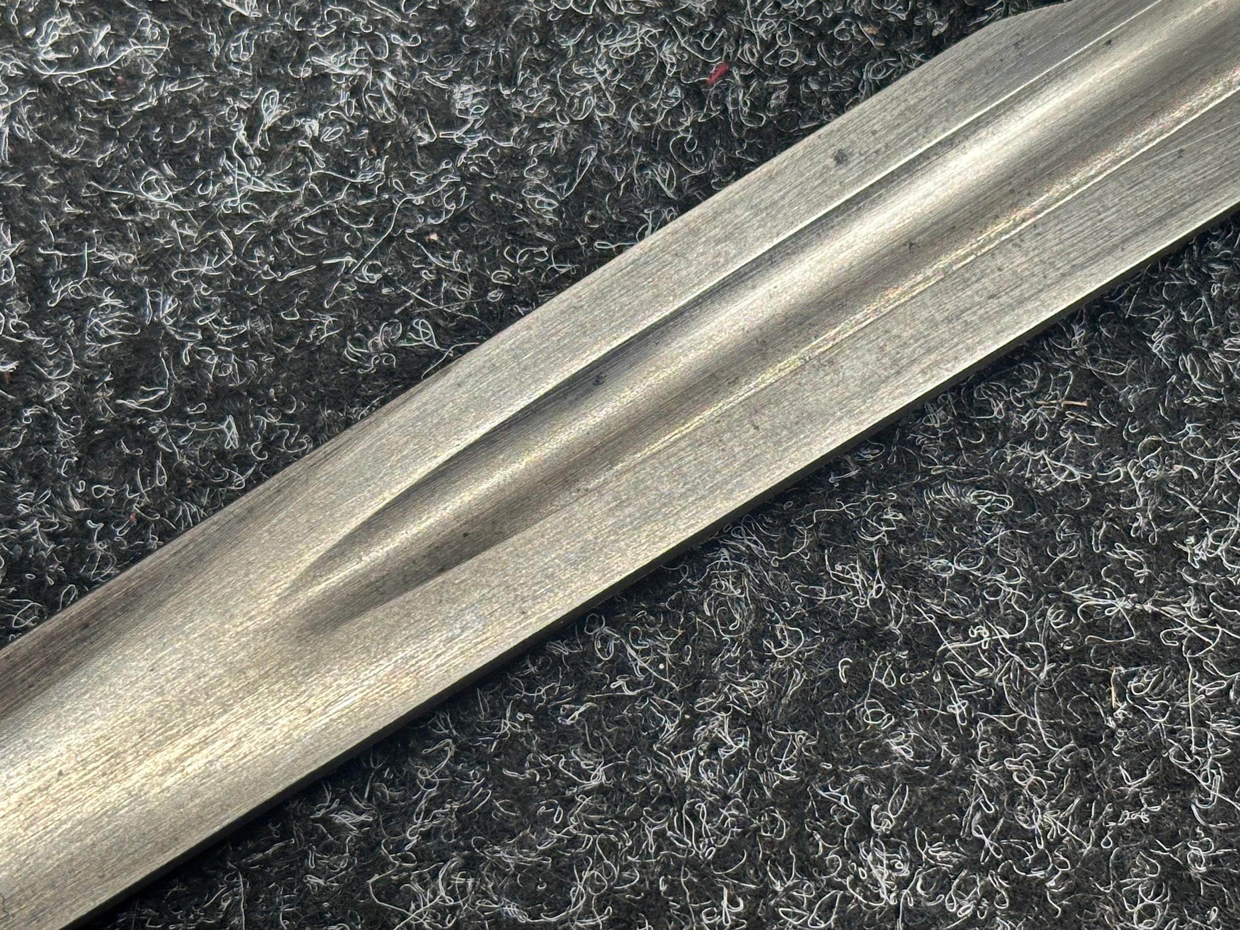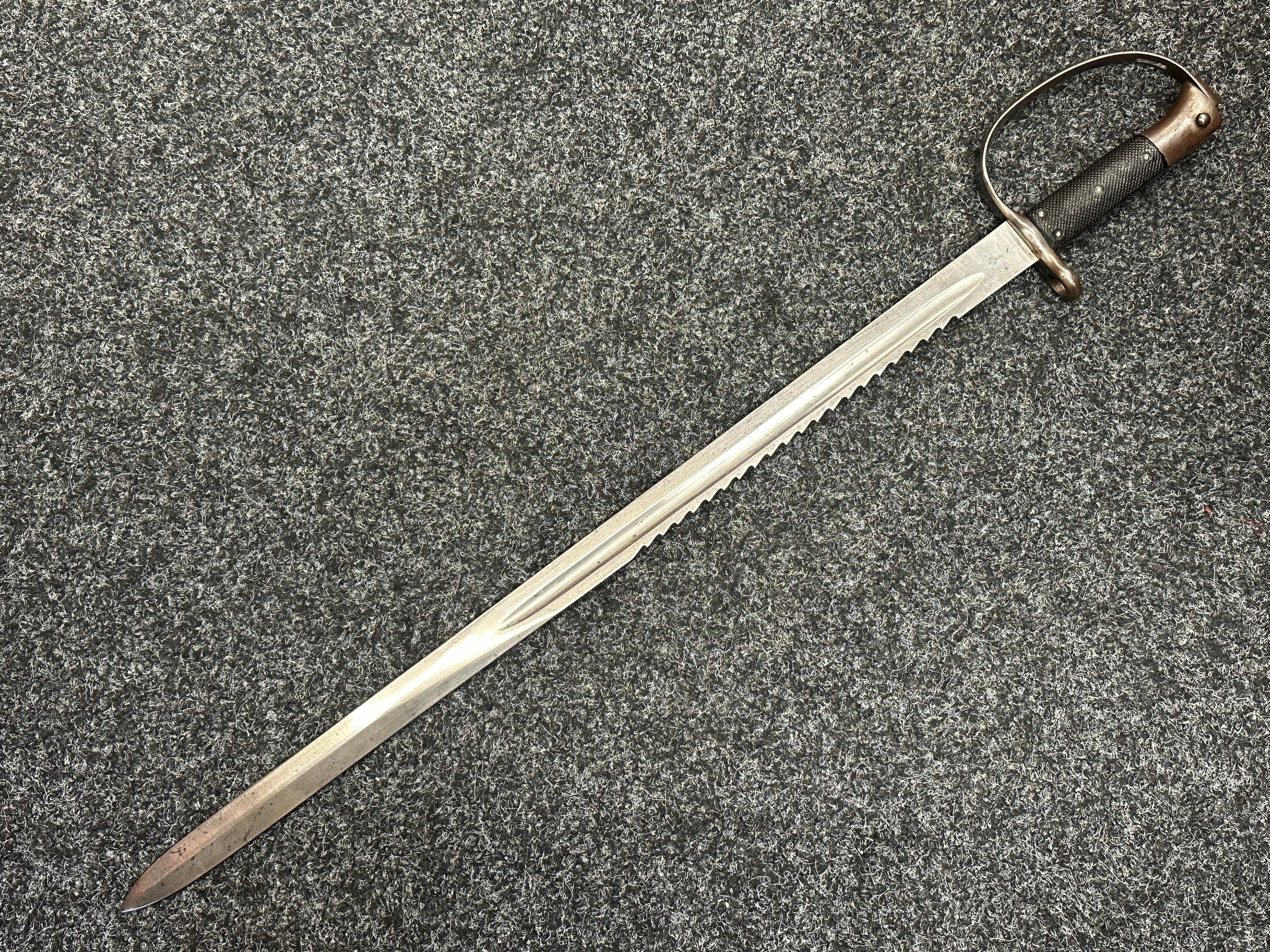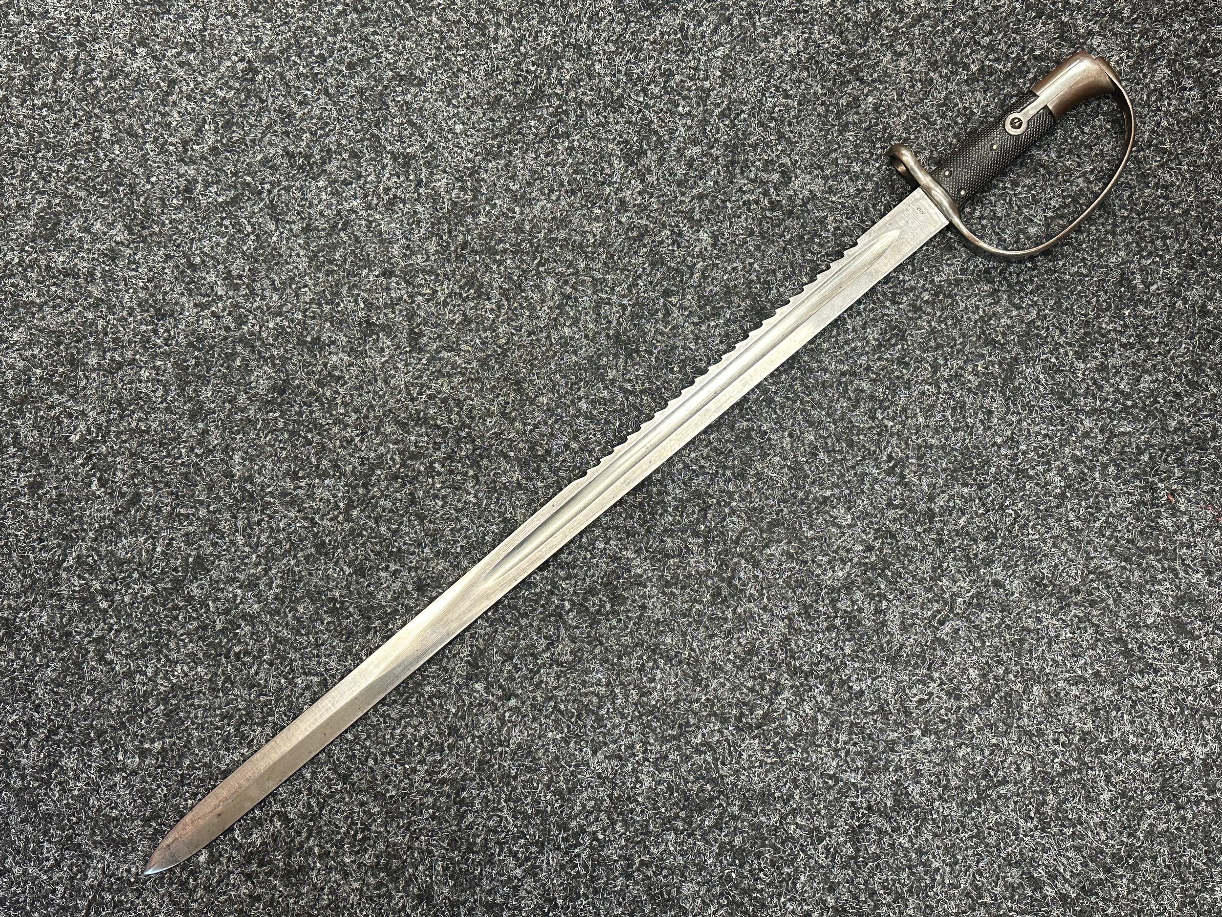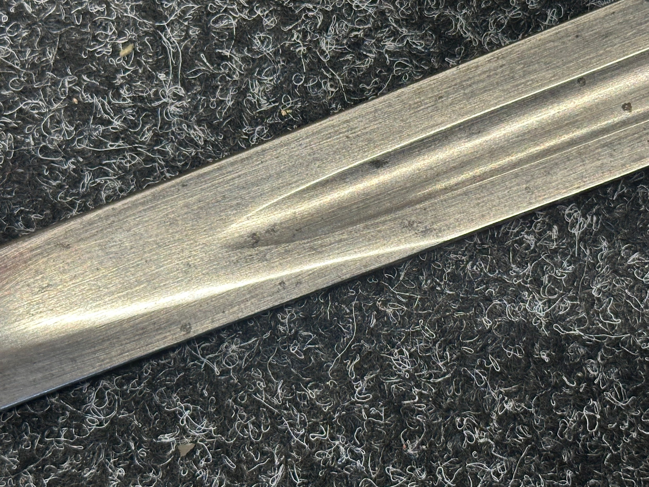 Victorian Martini Henry Artillery Sword Bayonet with fullered 653mm long blade. WD marked and dated 1900. Marked "WR" on spine of blade. Fibre grips with inspection marks. Working release catch. Overall length 795mm. No scabbard.