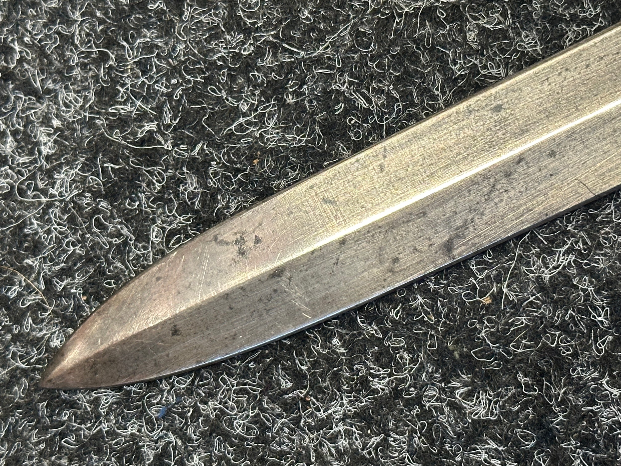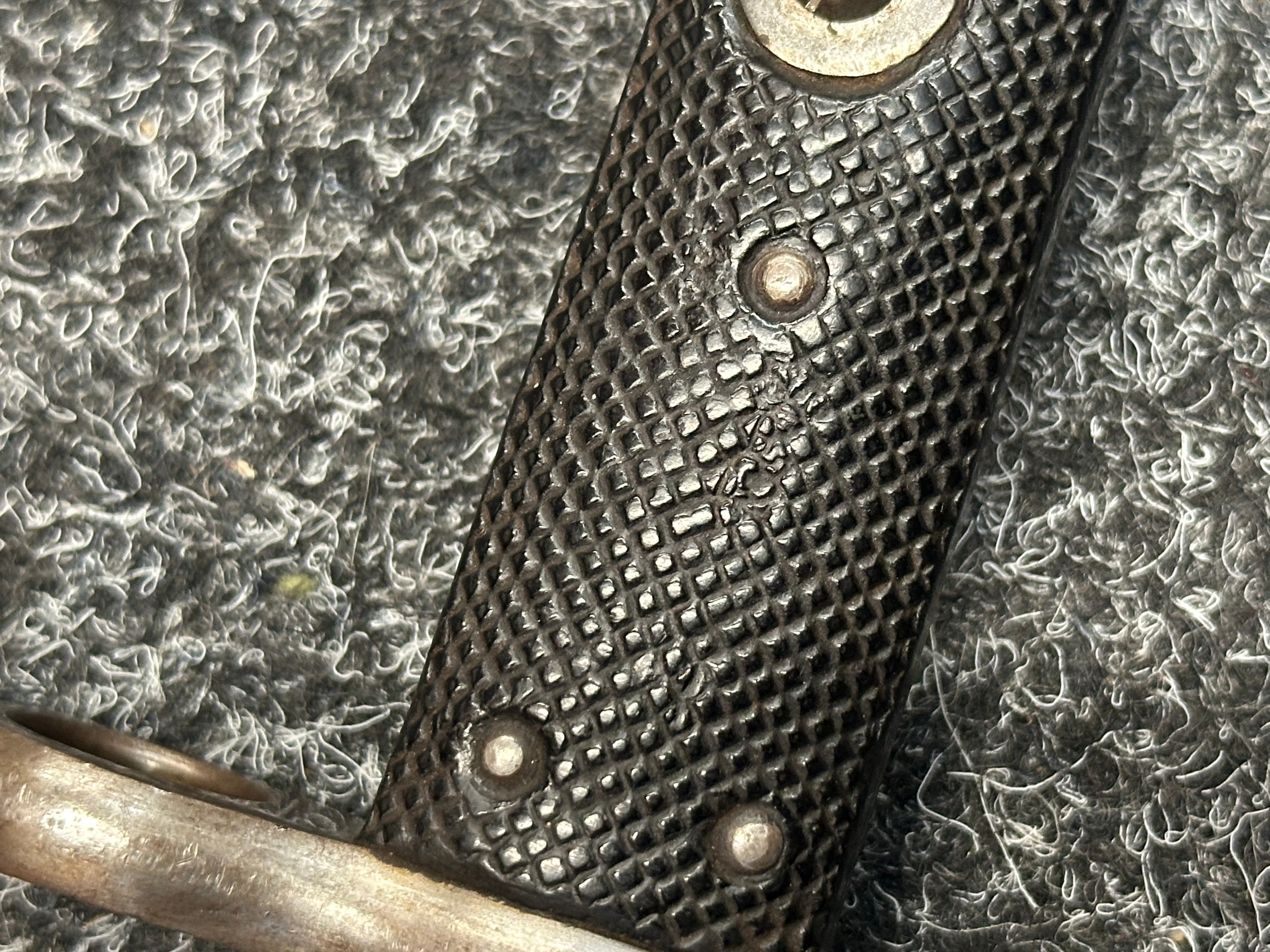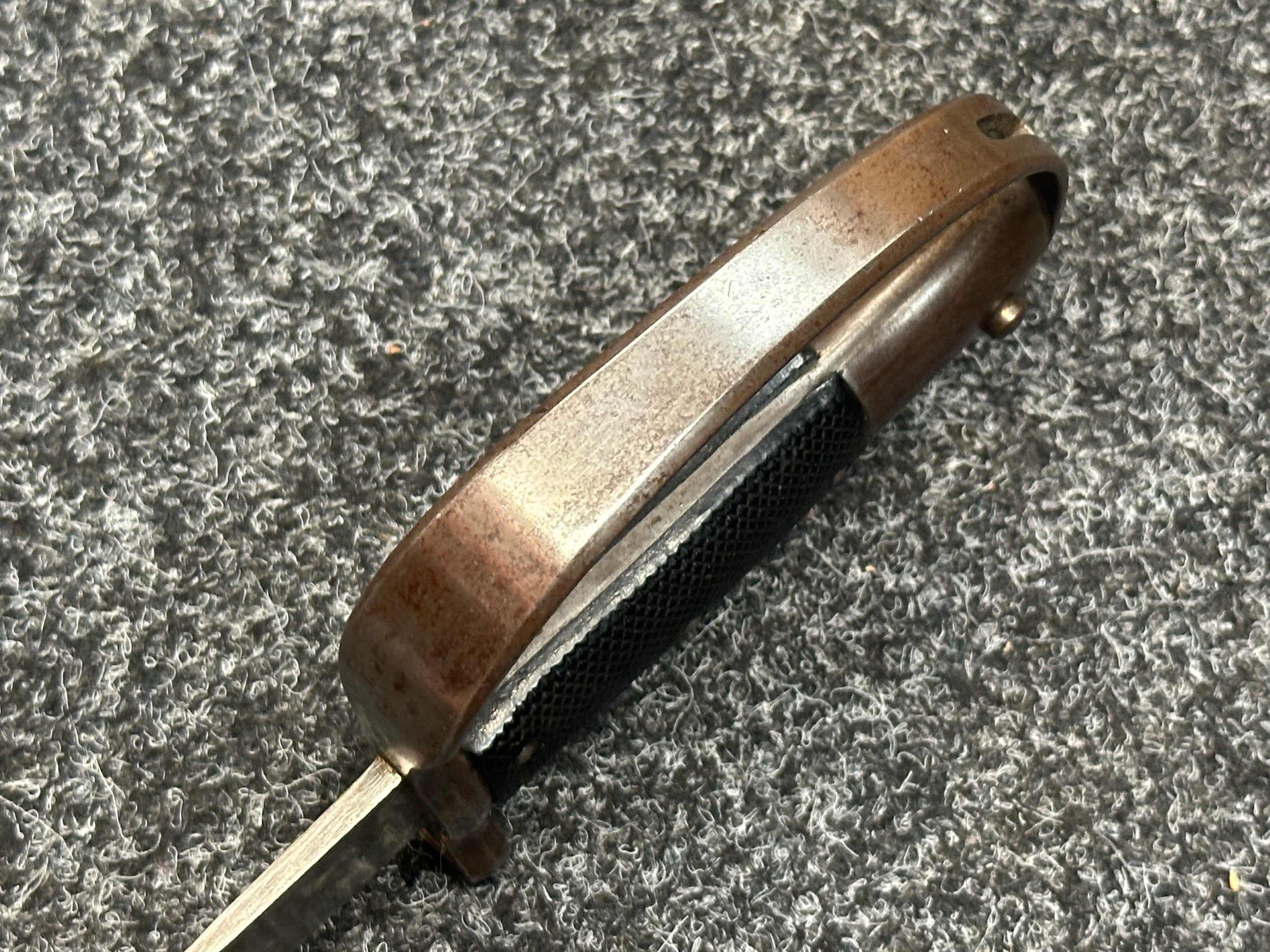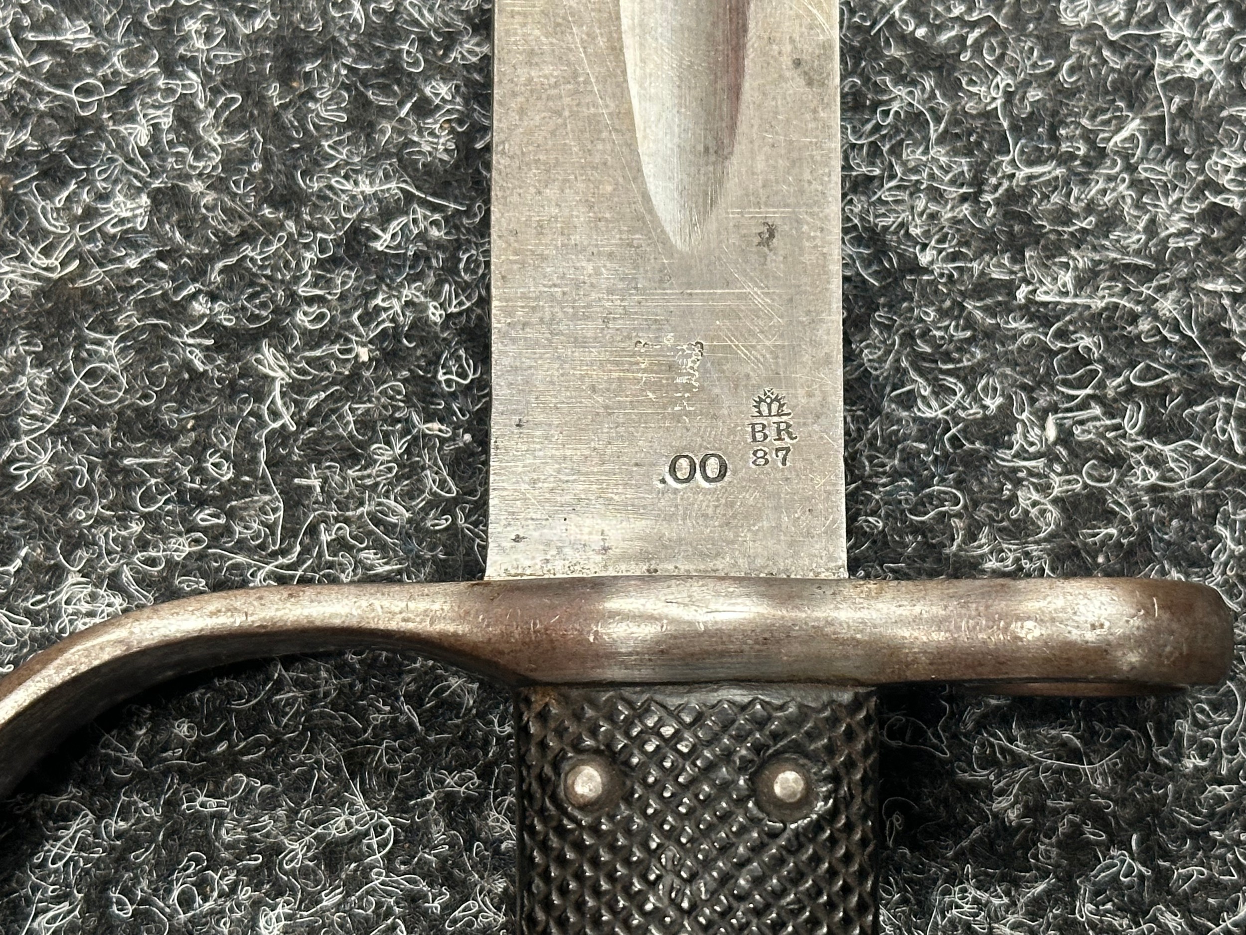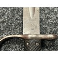 Victorian Martini Henry Artillery Sword Bayonet with fullered 653mm long blade. WD marked and dated 1900. Marked "WR" on spine of blade. Fibre grips with inspection marks. Working release catch. Overall length 795mm. No scabbard.