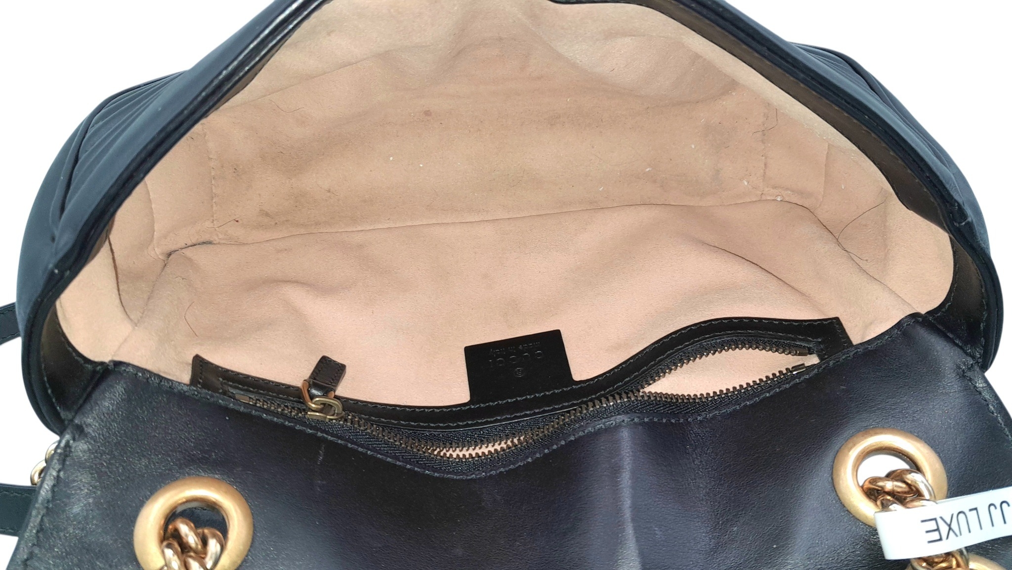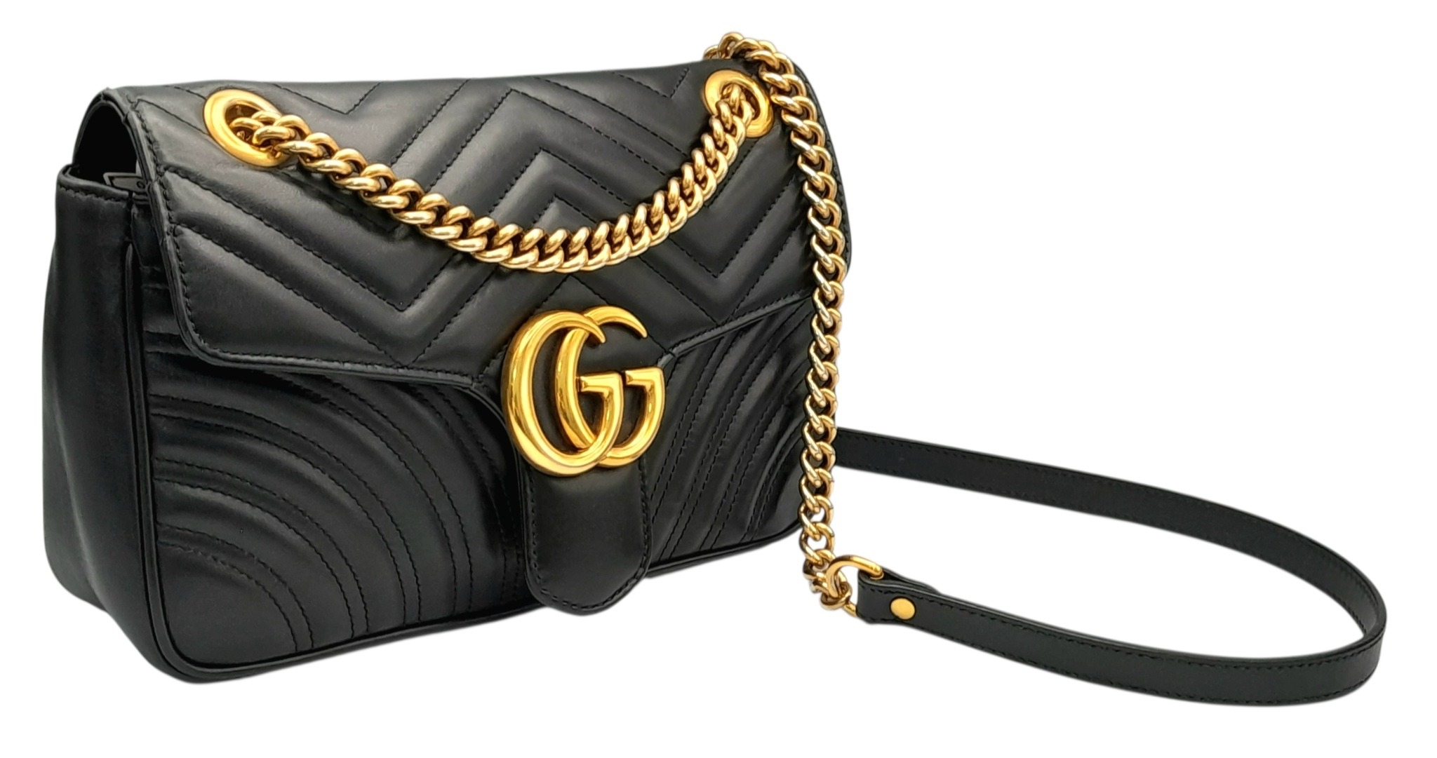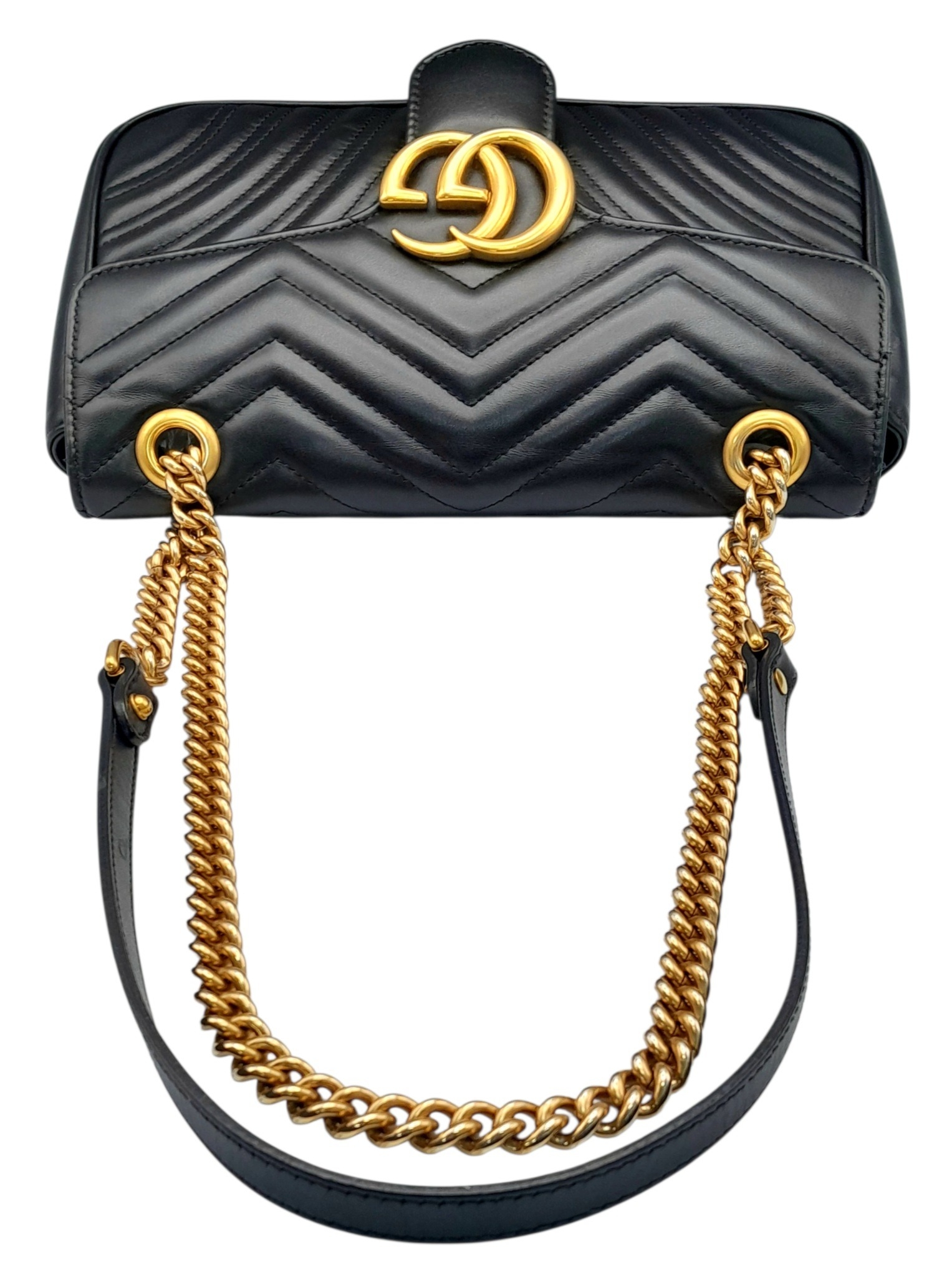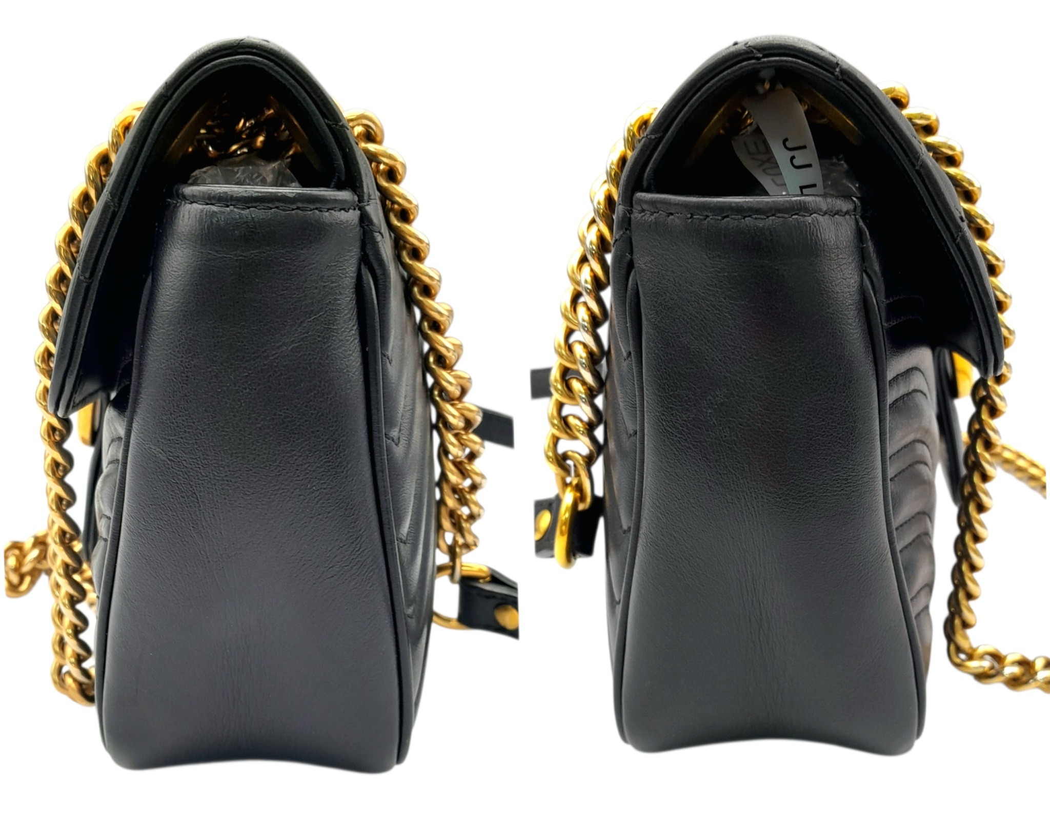 A Black Gucci GG Marmont Matelassé Shoulder Bag. Black leather exterior with gold-toned hardware, chain and leather strap and front flap with push-lock closure. Black leather textile interior with a single main compartment and a zipped side pocket. Some stains, signs of wear and tear to the exterior and interior. Approx 25cm length x 16cm height x 6cm depth. Please see photos or request a condition report. Ref: J1590.