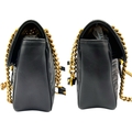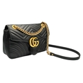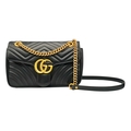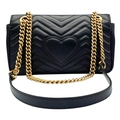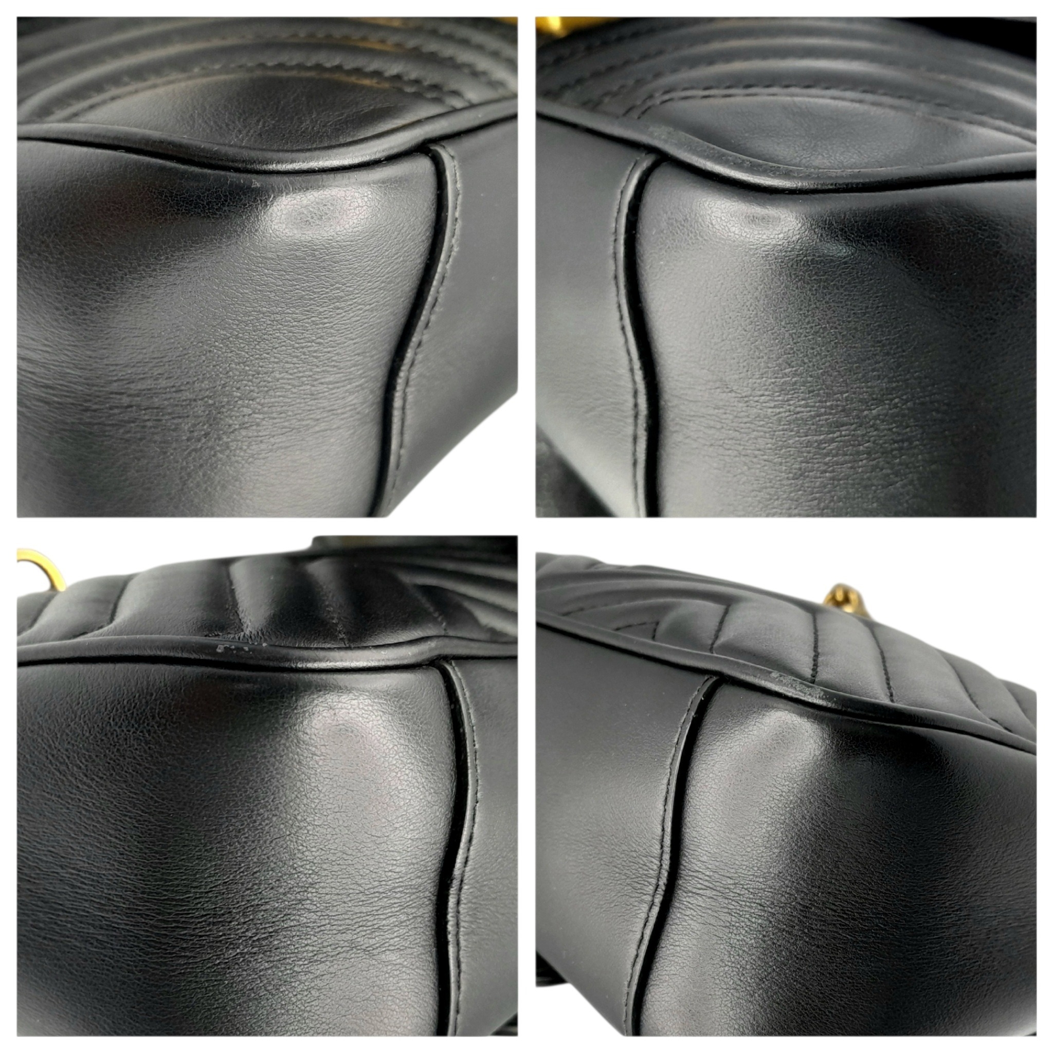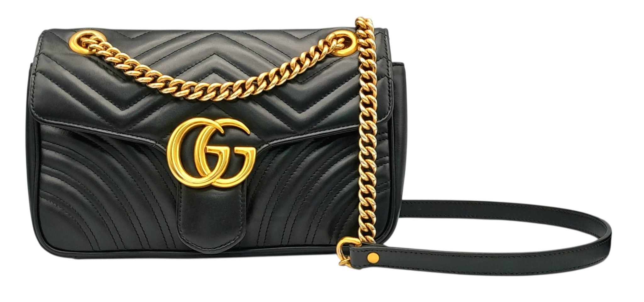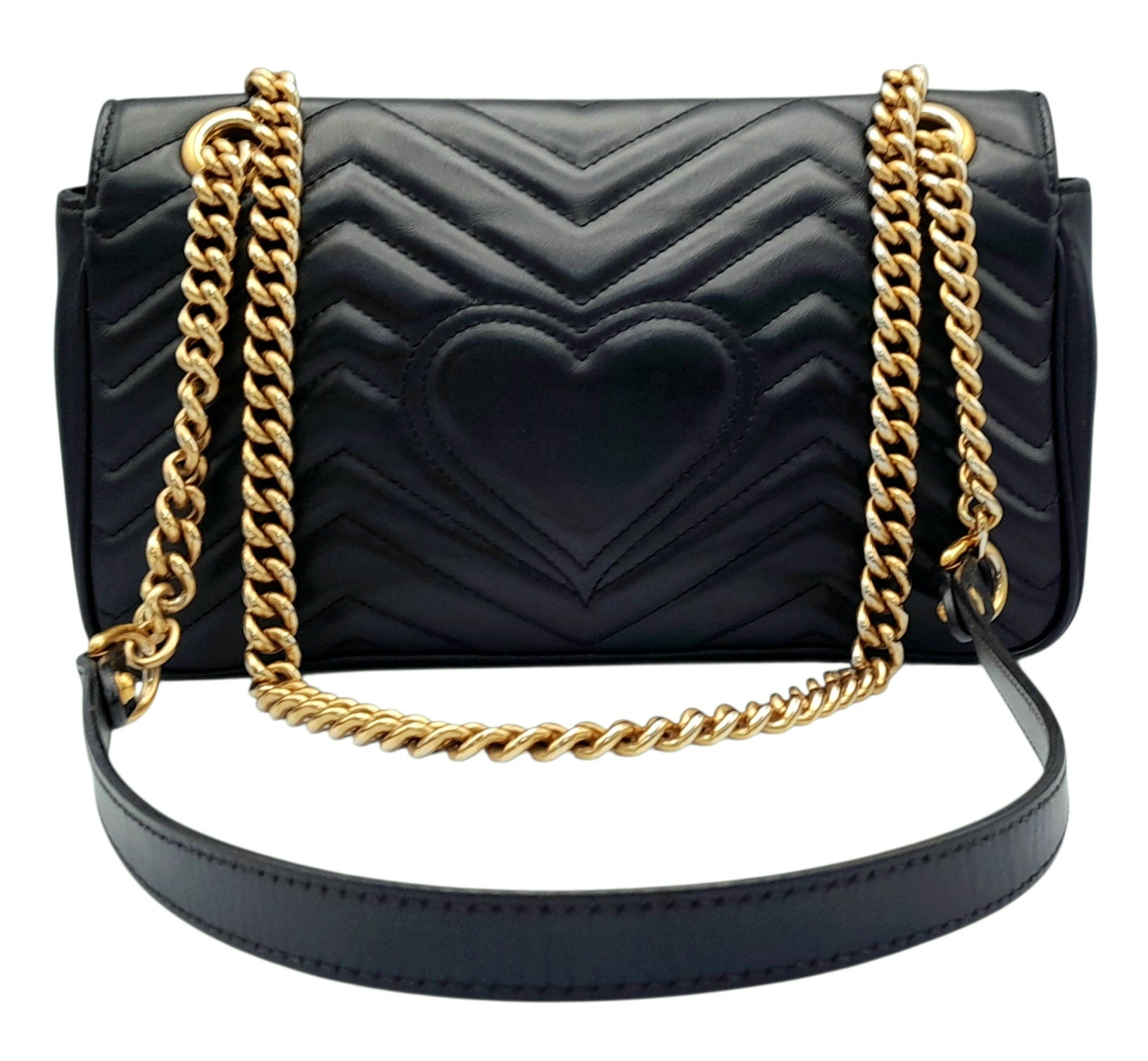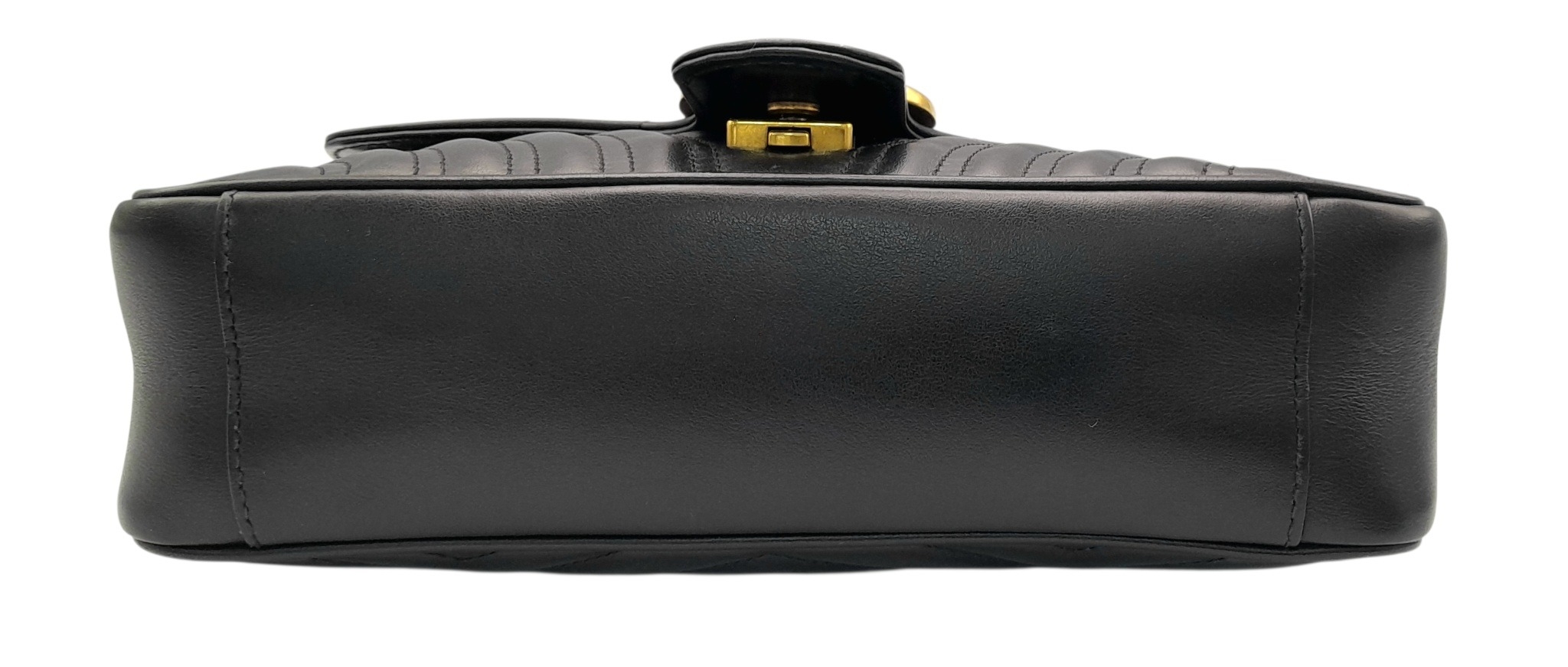 A Black Gucci GG Marmont Matelassé Shoulder Bag. Black leather exterior with gold-toned hardware, chain and leather strap and front flap with push-lock closure. Black leather textile interior with a single main compartment and a zipped side pocket. Some stains, signs of wear and tear to the exterior and interior. Approx 25cm length x 16cm height x 6cm depth. Please see photos or request a condition report. Ref: J1590.