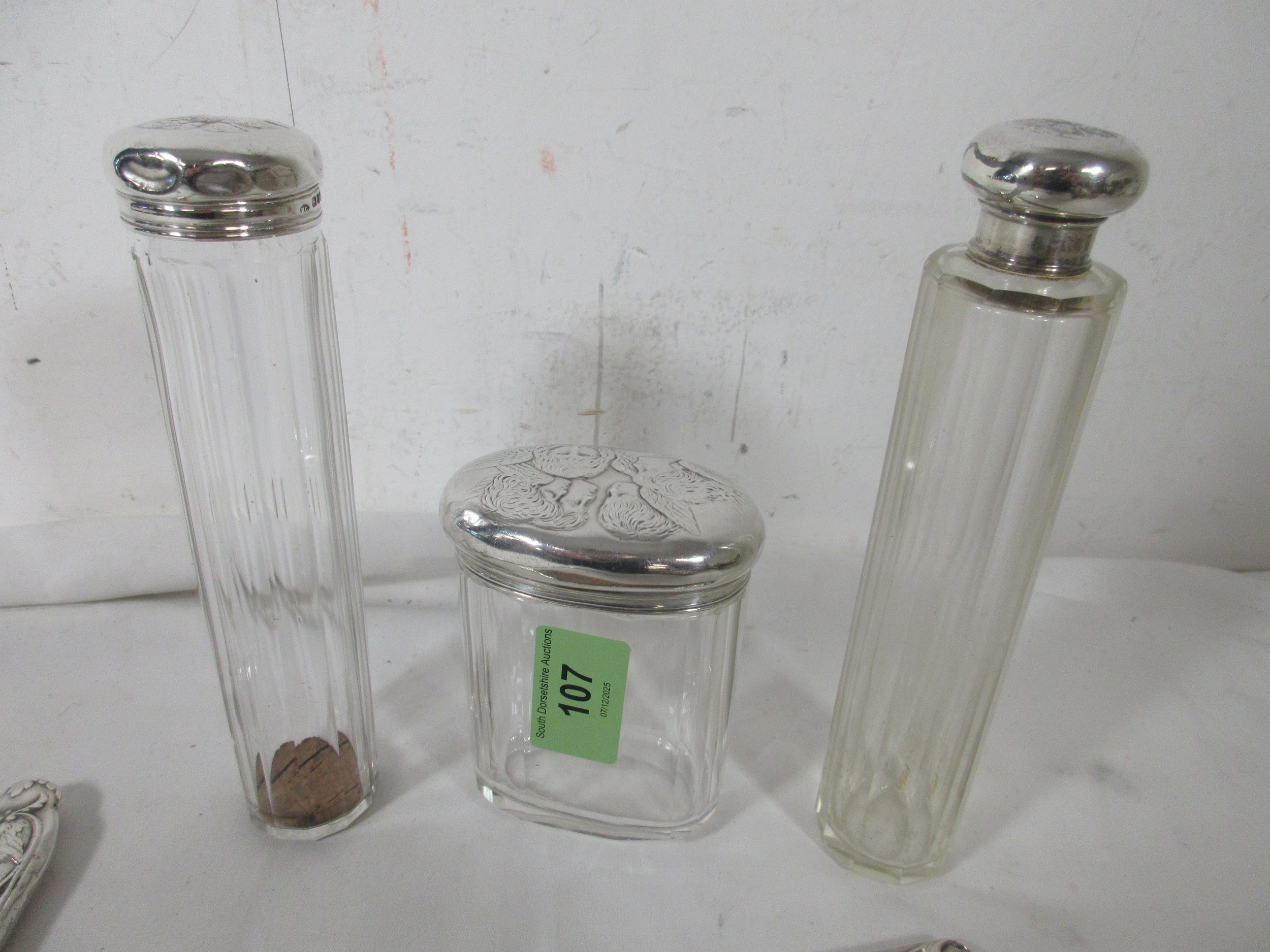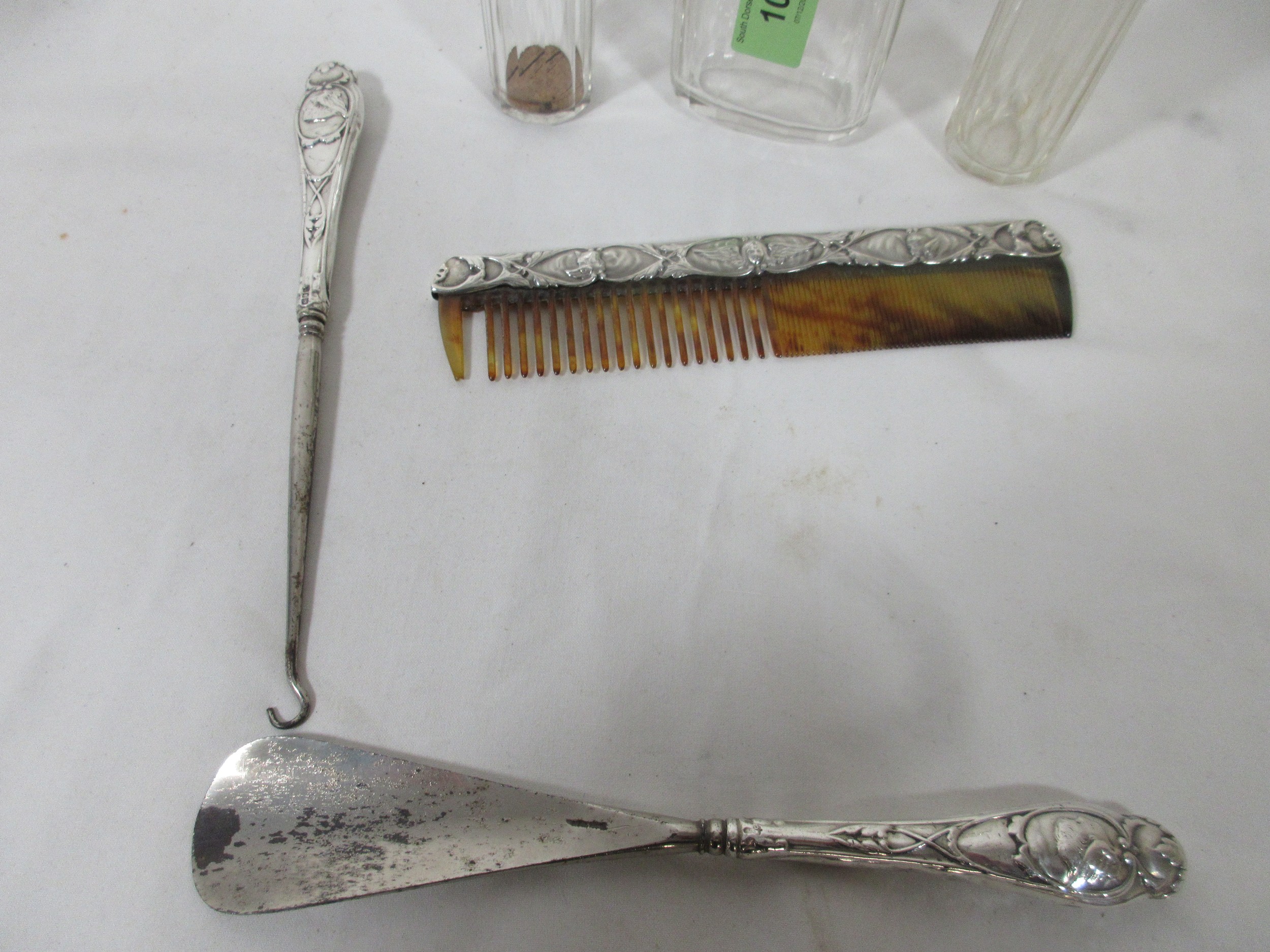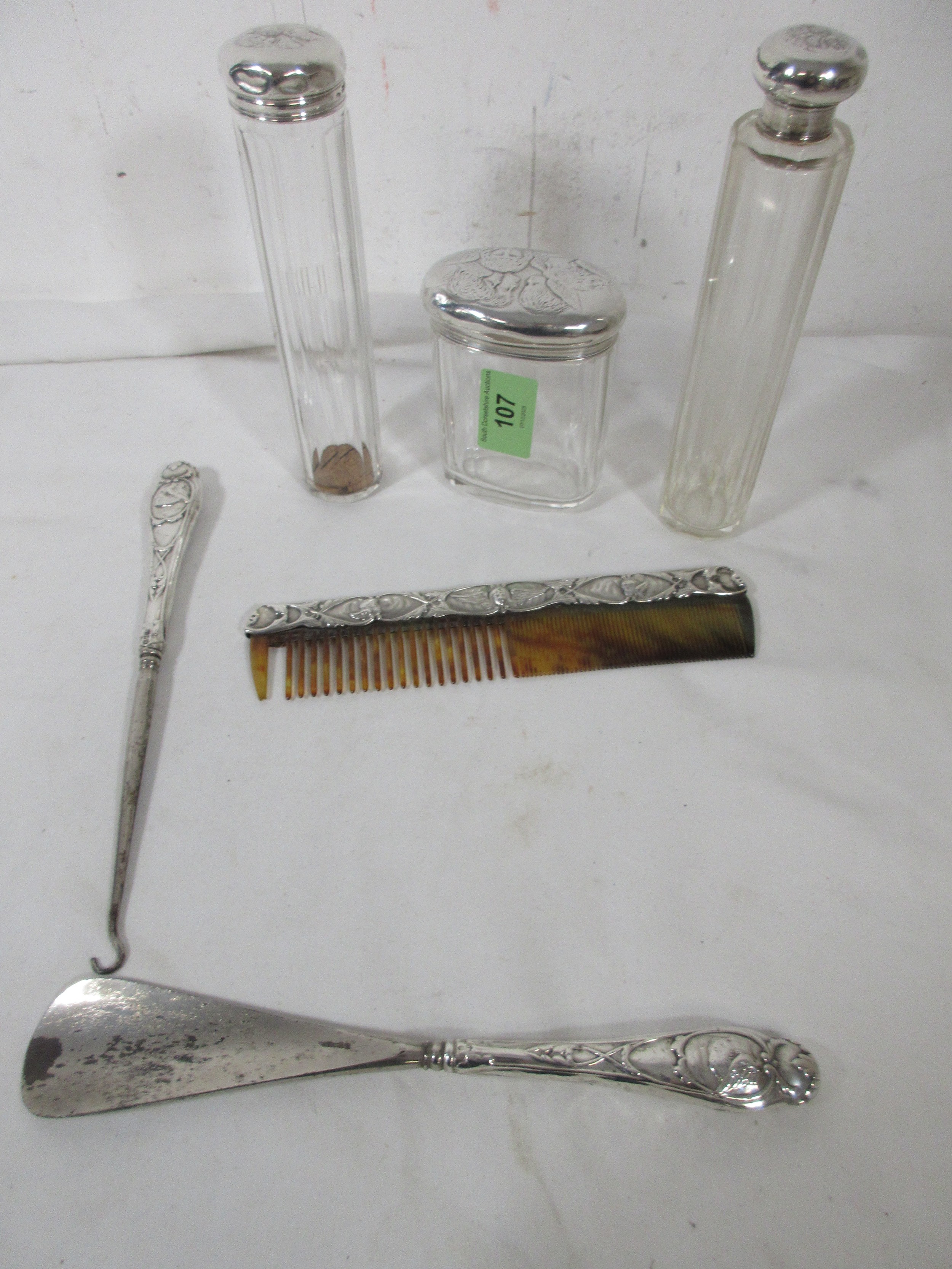 A Selection of Silver Items_ Two Dressing Table Jars a Shoe Horn, Button Hook and Comb.