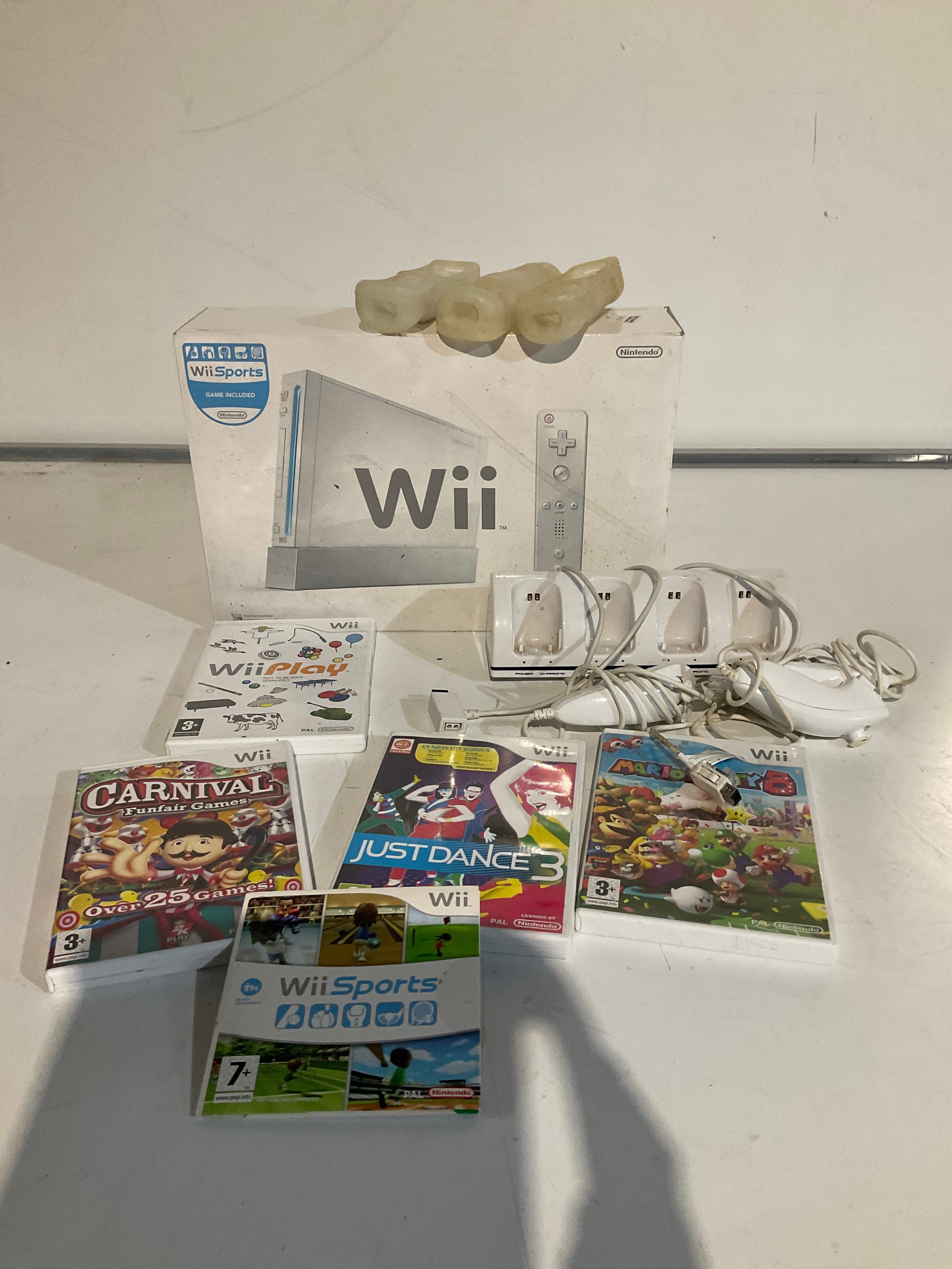 Boxed Wii console with 3 controllers, nunchucks and controller skins barely been used and games to include wii sport, mario party 8, just dance 3 and 2 others