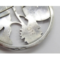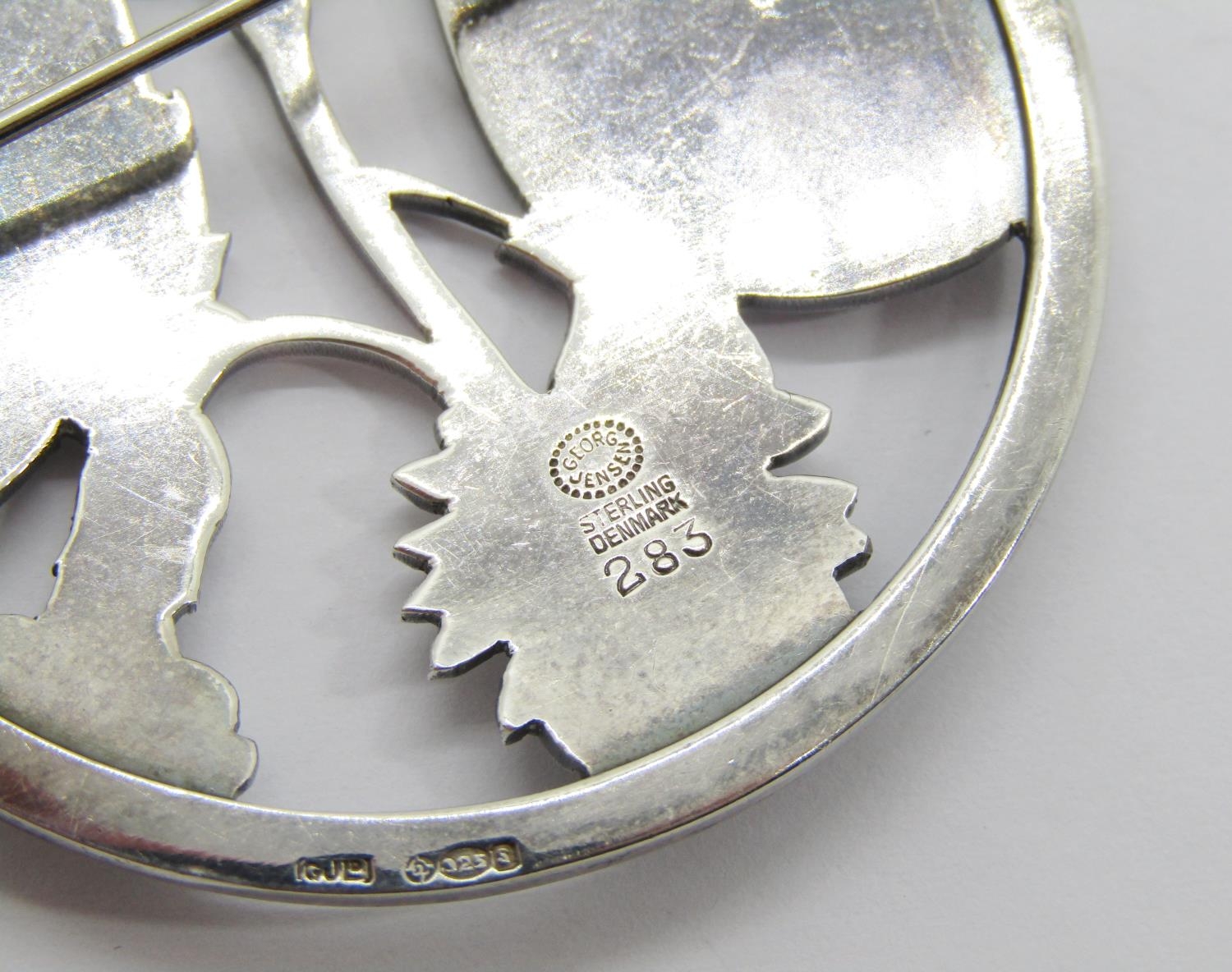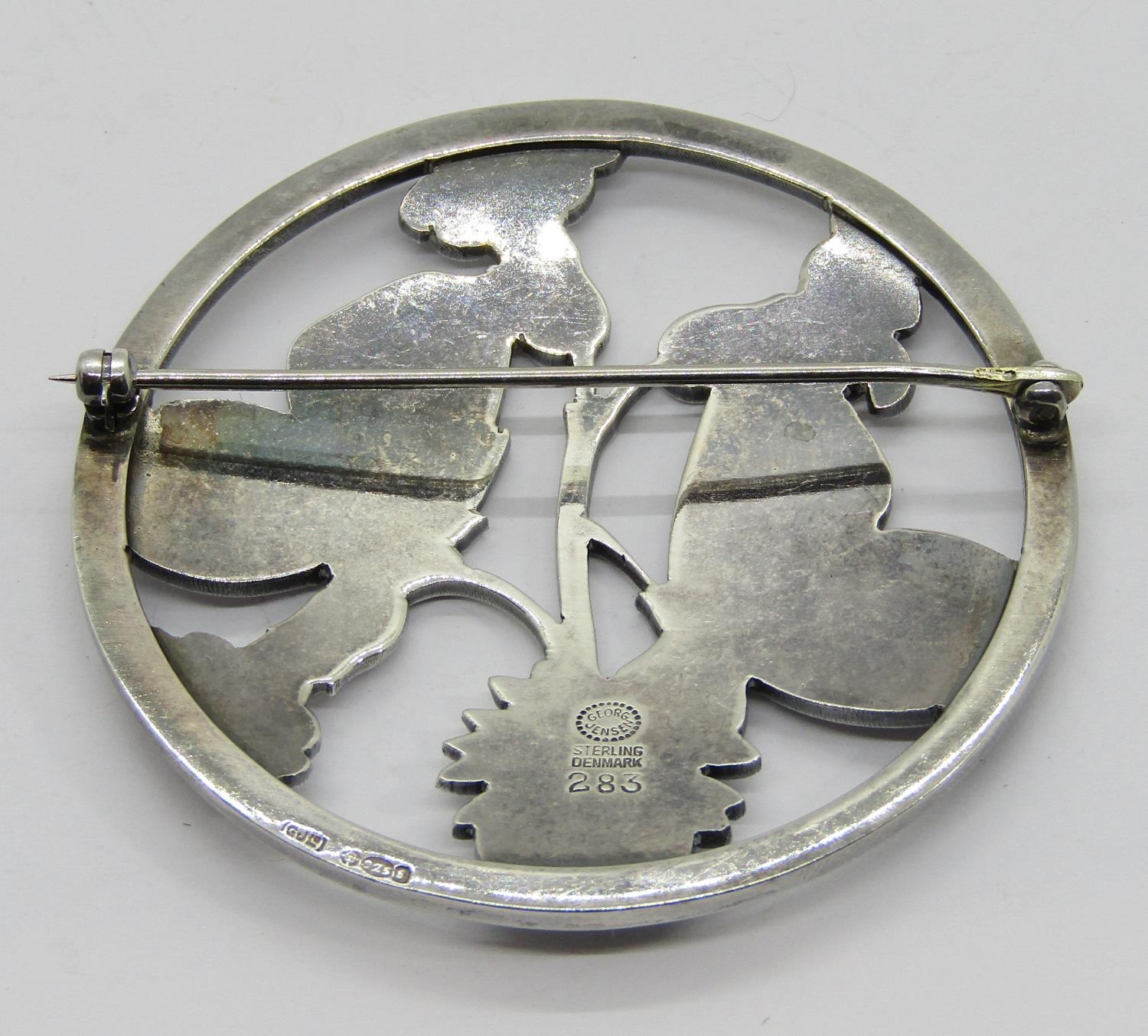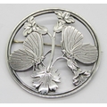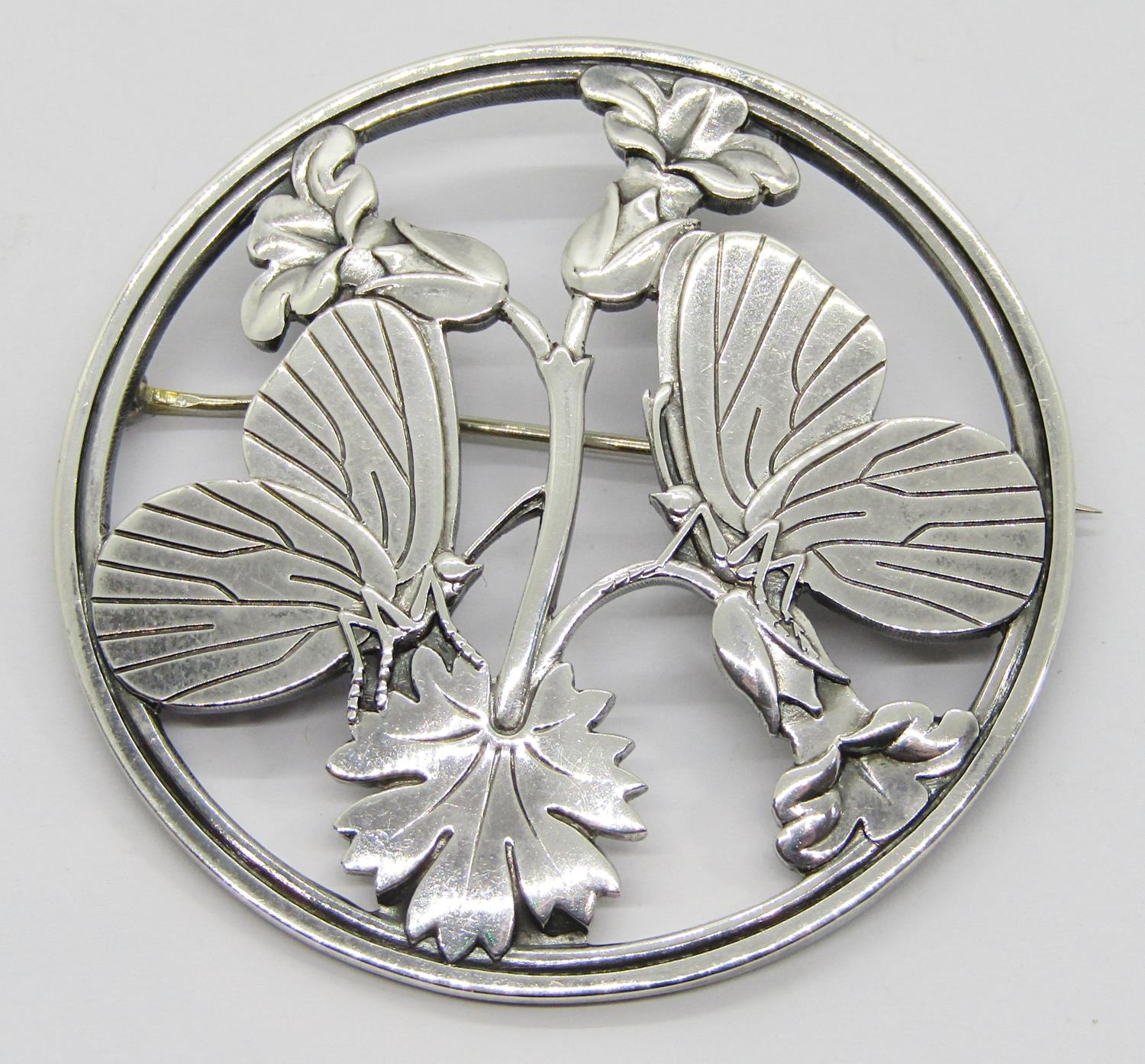 Georg Jensen circular silver brooch designed by Arno Malinowski, depicting a pair of butterflies resting on flowers, no.283, London 1953 import marks, 5.4cm diameter approx