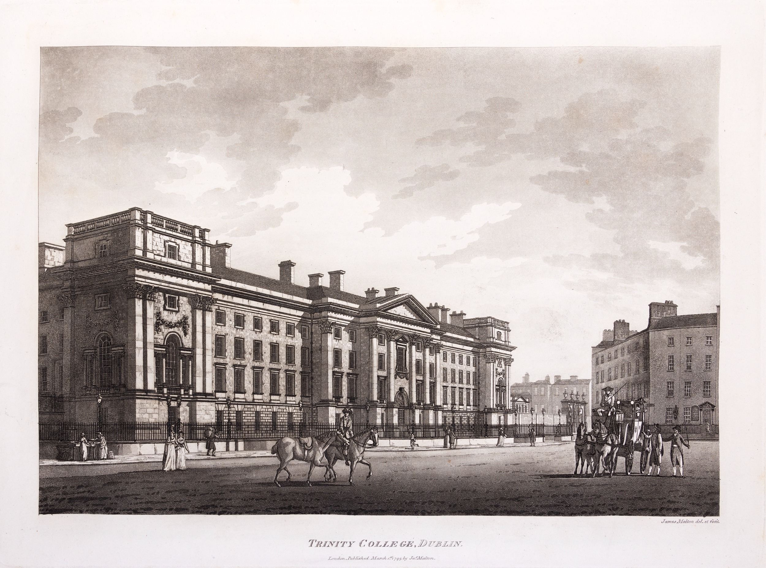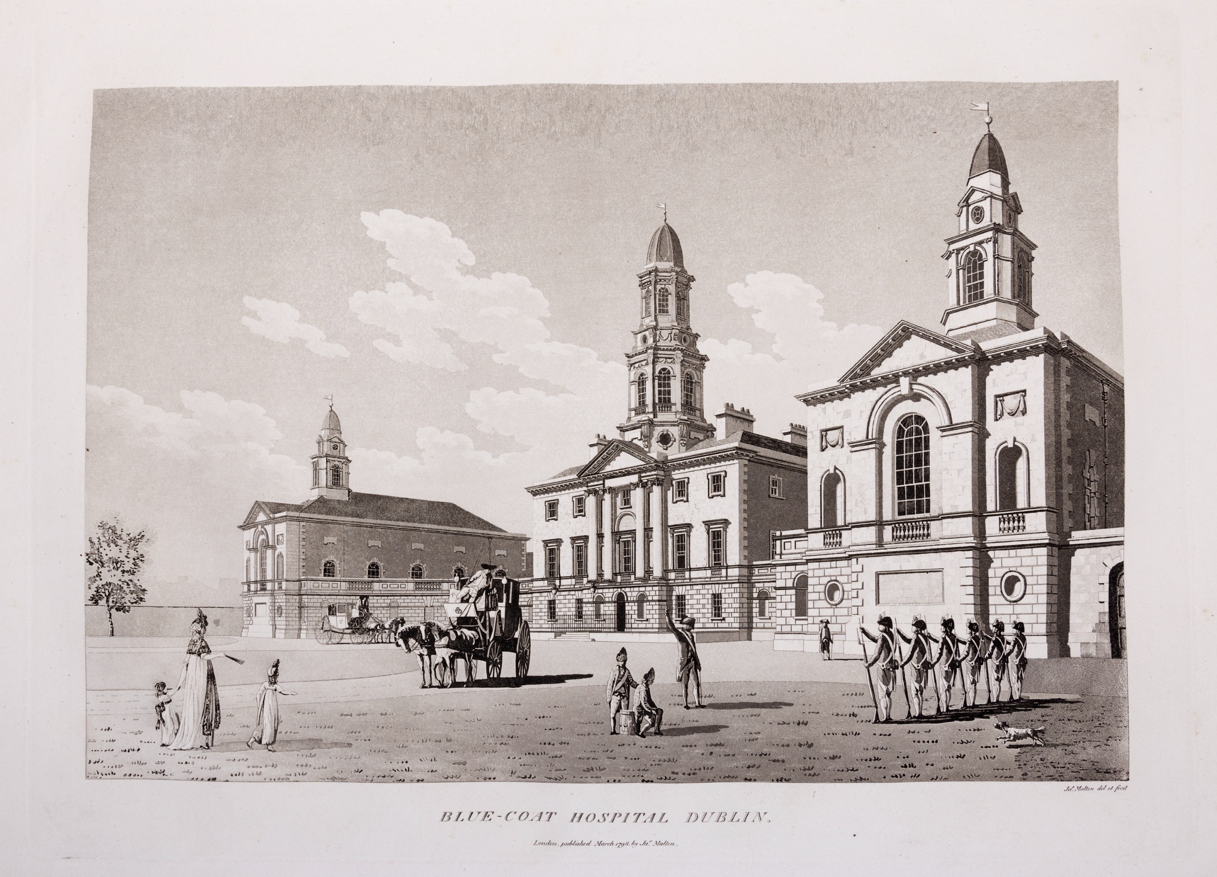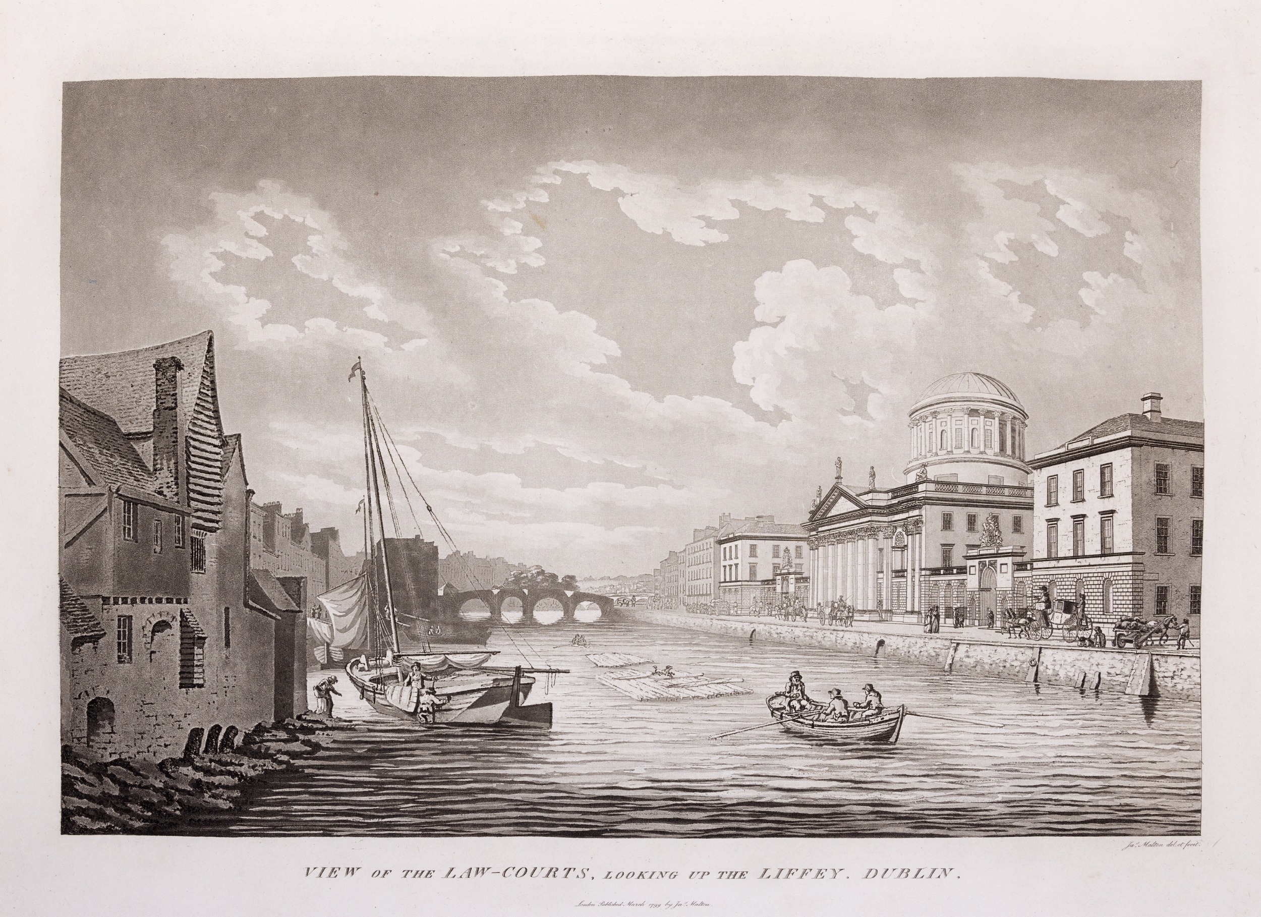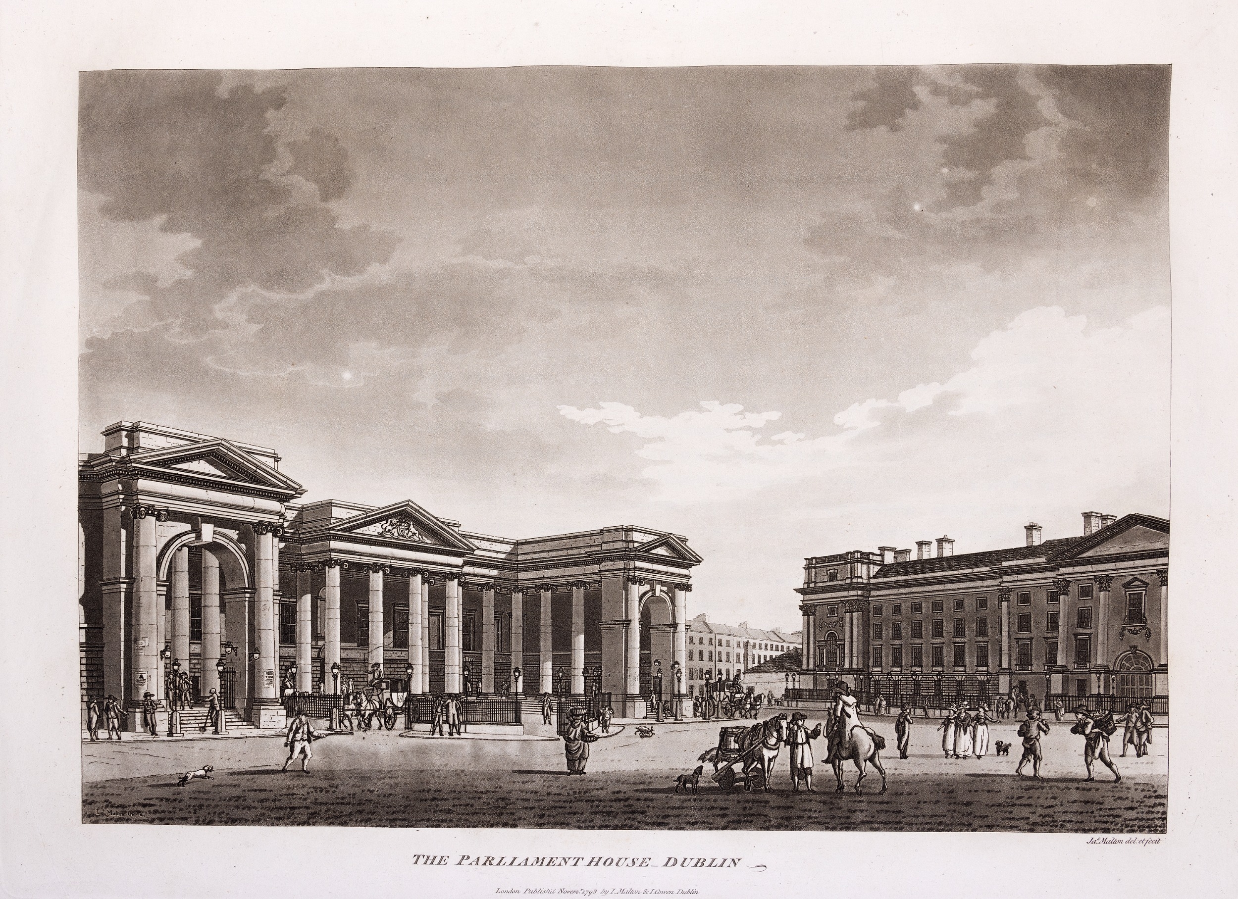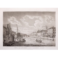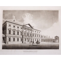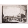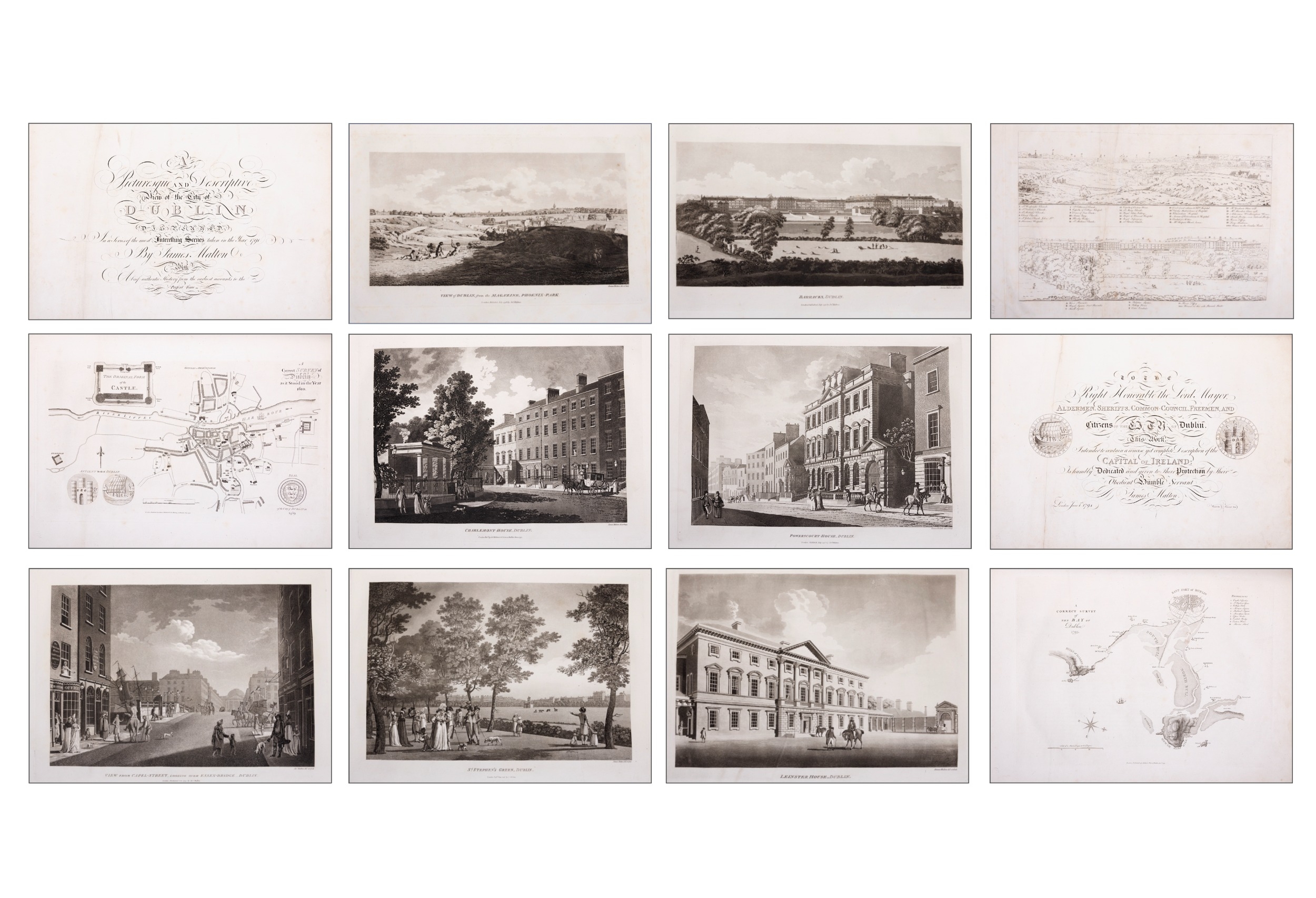 JAMES MALTON (1761-1803) A PICTURESQUE AND DESCRIPTIVE VIEW OF THE CITY OF DUBLIN In a series of the most Interesting Scenes taken in the year 1791. By James Malton. With a brief authentic history from the earliest accounts to the present time. Oblong folio, 1809 edition, engraved titlepage and dedication, Arms of Dublin, A Correct Survey of Dublin as it stood in the year 1610, A Correct Survey of the Bay of Dublin 1795, and twenty-five plates of views. London: 1803. The plates are as follows: Great Courtyard, Dublin Castle; The Parliament House; Trinity College; College Library; Provost's House; St. Patrick's Cathedral; West Front of St. Patrick's Cathedral; Royal Exchange; Custom House; View of the Law Courts, looking up the Liffey; Tholsel; Old Soldiers Hospital, Kilmainham; Royal Infirmary, Phoenix Park; Blue Coat Hospital; Lying-in Hospital; Rotunda New Rooms; St. Catharine's Church; Marine School; Leinster House; Charlemont House; Powerscourt House; View of Capel Street, looking over Essex Bridge; St. Stephen's Green; Barracks; View of Dublin from the Magazine, Phoenix Park. Dedicated to the Governors and Directors of the Hospital, including the College Library, dedicated to Edmund Burke. Besides the above twenty-five views the bound volume contains the Arms of Dublin, as frontispiece; Survey of the City of Dublin as it stood in 1610, taken from Speed's Map; Survey of the Bay of Dublin, 1795, and a folding map of Dublin by Faden . At the end of the volume is a plate with two outline Keys - one of the smaller View of Dublin from the Park, the other of the smaller view of the Barracks. All the plates are inscribed James Malton del. et fecit James Malton’s A Picturesque and Descriptive View of the City of Dublin (1799) constitutes a significant artistic and historical document, reflecting the author’s profound admiration for the city’s architectural grandeur. In the preface, Malton expresses his desire to bring Dublin into the cultural spotlight, believing it to be a capital that had been unjustly neglected. His work, however, emerges from a context marked by both professional turmoil and personal ambition. “Few cities can boast more extensive conveniences, more eminent beauties, than Dublin… To convey to the curious inquirer adequate ideas of those objects; to diffuse information of a Capital so long undesertly unnoticed, and to give it that place in estimation with regard to others it merits, this work was undertaken.” Preface, A Picturesque and Descriptive view of the City of Dublin, James Malton, 1799 Born in England in 1765, Malton was the son of Thomas Malton, a noted architectural draughtsman and instructor in geometry and perspective. The Malton family relocated to Dublin in 1769, where the elder Malton sought to establish himself within the city’s vibrant architectural scene. In 1781, through his father’s connections, James Malton secured a position as a drawing clerk under the esteemed architect James Gandon, who was then overseeing the construction of the Custom House, one of the city’s most important public buildings. Despite initial praise from Gandon, Malton’s tenure was short-lived; he was dismissed due to what Gandon described as breaches of professional trust and misconduct. This dismissal later culminated in an anonymous and caustic critique of Gandon’s architectural designs, published in 1787—a possible act of retaliation by Malton or his father. That same year, Malton failed in his candidacy for the position of Master of the Dublin Society’s School of Architectural Drawing. Undeterred by these setbacks, Malton devoted himself to documenting the architecture of Dublin. By 1791, he had completed a comprehensive series of architectural drawings capturing the city’s most prominent buildings. These drawings vividly depicted Dublin’s Georgian streetscapes with great detail and accuracy. The engravings were issued in six instalments between 1792 and 1799, with the final bound volume published that same year, complete with descriptive text. Malton’s engravings are not merely technical records but are imbued with an artistic vision that animates the architecture of late eighteenth-century Dublin. His Picturesque and Descriptive View situates Dublin within the aesthetic discourses of the time, contributing to the visual and cultural representation of the city.