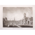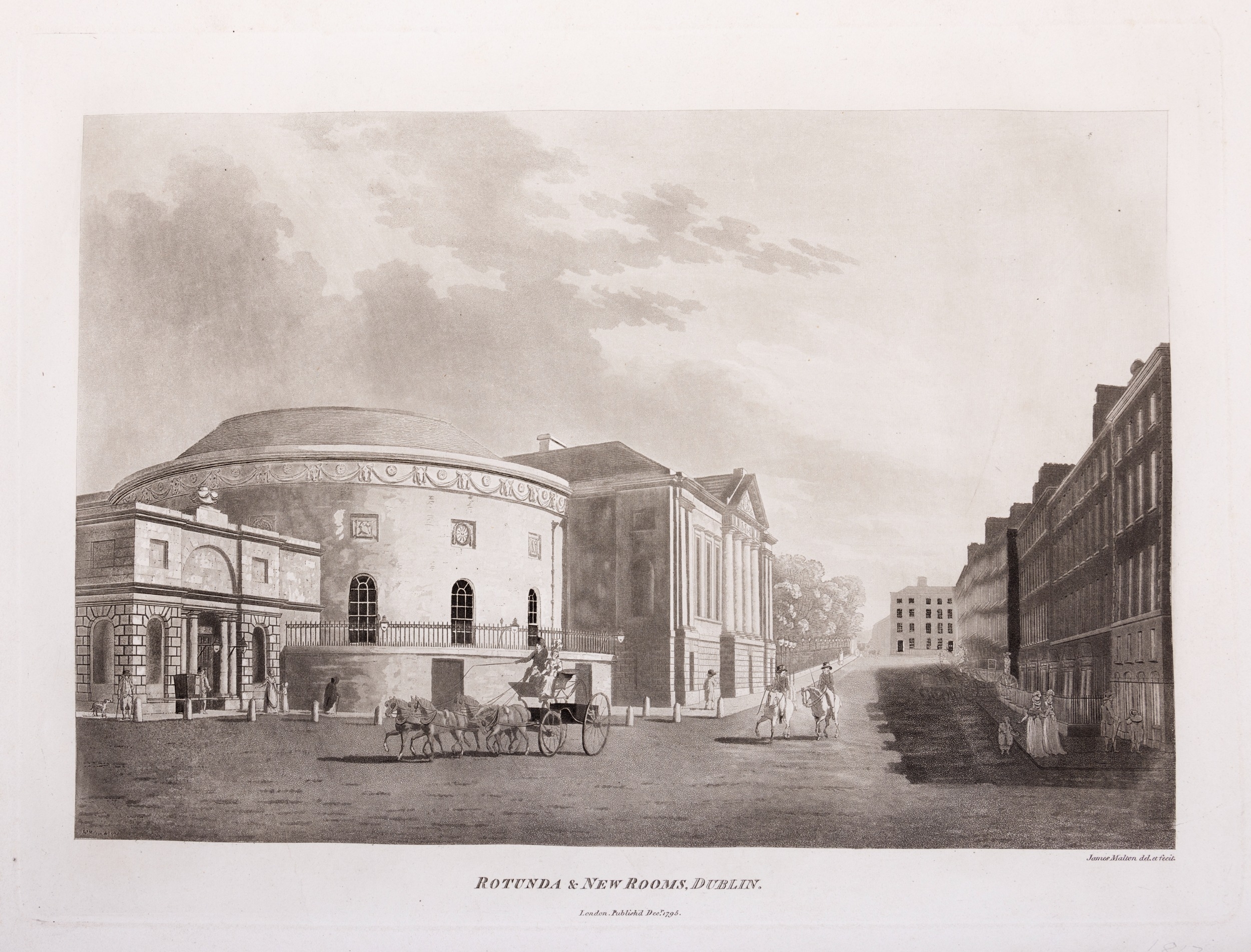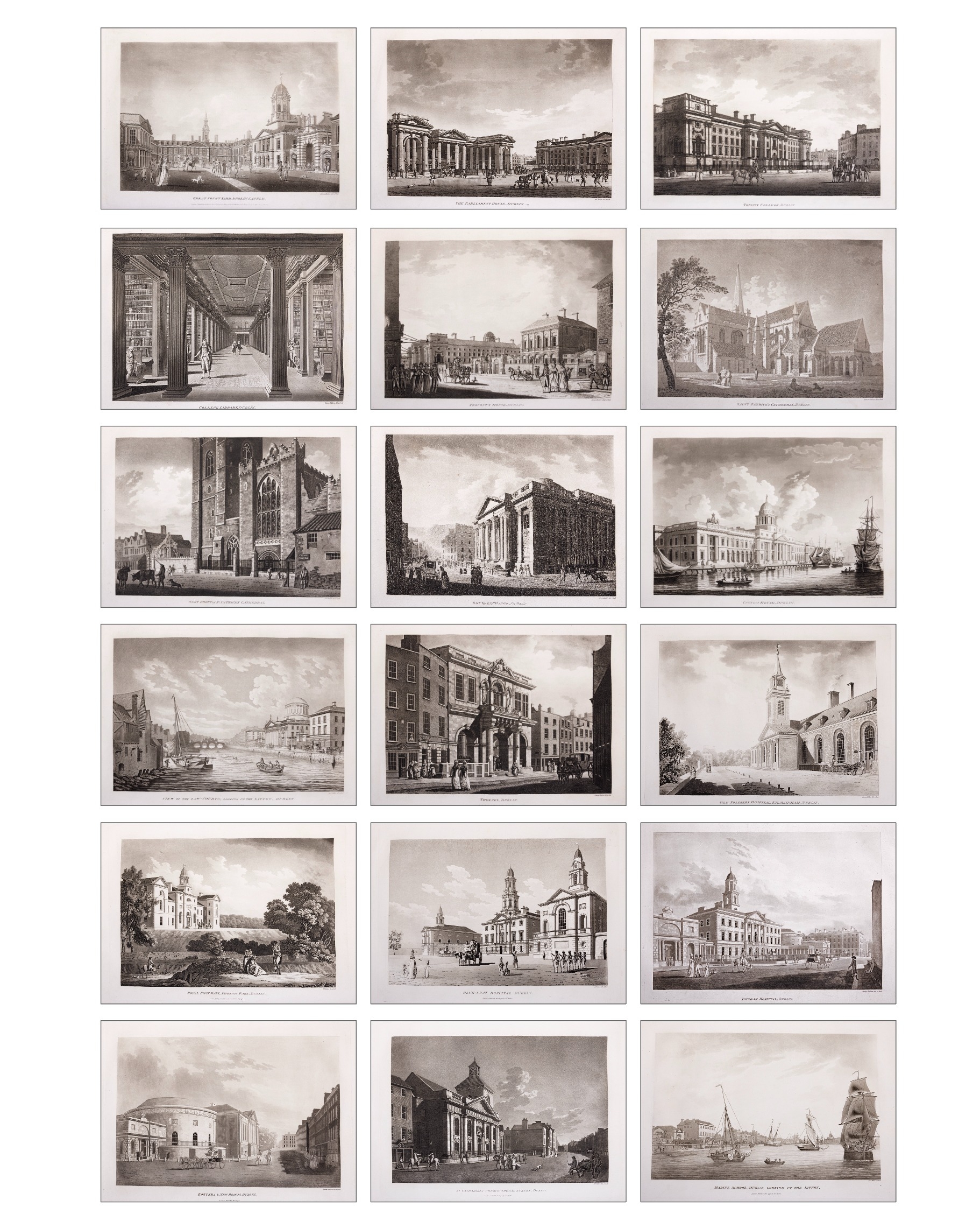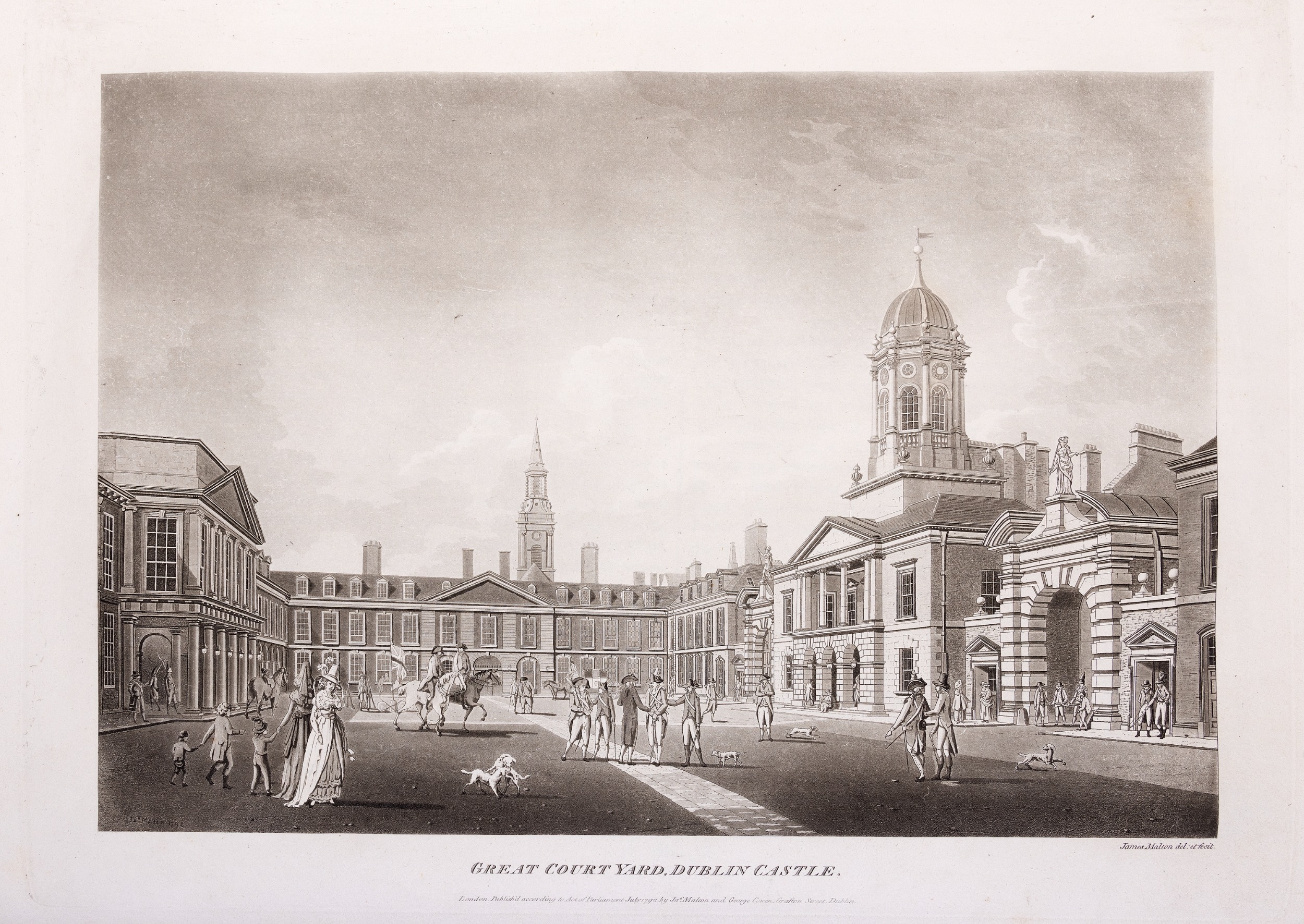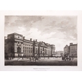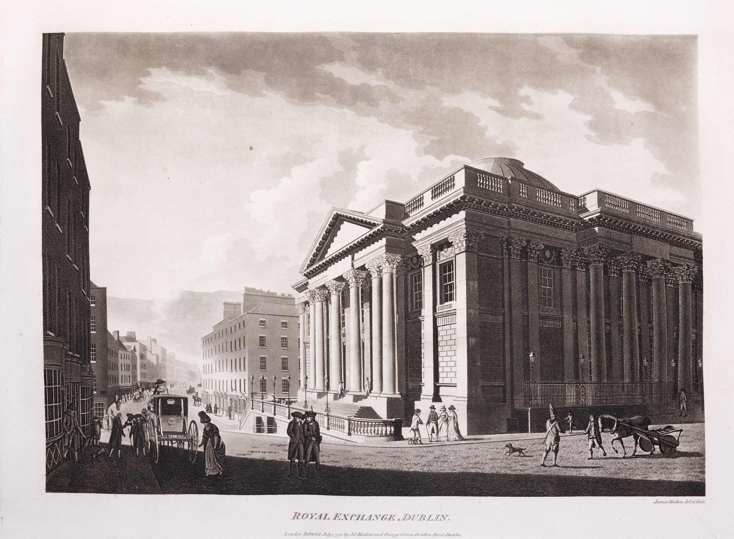 JAMES MALTON (1761-1803) A PICTURESQUE AND DESCRIPTIVE VIEW OF THE CITY OF DUBLIN In a series of the most Interesting Scenes taken in the year 1791. By James Malton. With a brief authentic history from the earliest accounts to the present time. Oblong folio, 1809 edition, engraved titlepage and dedication, Arms of Dublin, A Correct Survey of Dublin as it stood in the year 1610, A Correct Survey of the Bay of Dublin 1795, and twenty-five plates of views. London: 1803. The plates are as follows: Great Courtyard, Dublin Castle; The Parliament House; Trinity College; College Library; Provost's House; St. Patrick's Cathedral; West Front of St. Patrick's Cathedral; Royal Exchange; Custom House; View of the Law Courts, looking up the Liffey; Tholsel; Old Soldiers Hospital, Kilmainham; Royal Infirmary, Phoenix Park; Blue Coat Hospital; Lying-in Hospital; Rotunda New Rooms; St. Catharine's Church; Marine School; Leinster House; Charlemont House; Powerscourt House; View of Capel Street, looking over Essex Bridge; St. Stephen's Green; Barracks; View of Dublin from the Magazine, Phoenix Park. Dedicated to the Governors and Directors of the Hospital, including the College Library, dedicated to Edmund Burke. Besides the above twenty-five views the bound volume contains the Arms of Dublin, as frontispiece; Survey of the City of Dublin as it stood in 1610, taken from Speed's Map; Survey of the Bay of Dublin, 1795, and a folding map of Dublin by Faden . At the end of the volume is a plate with two outline Keys - one of the smaller View of Dublin from the Park, the other of the smaller view of the Barracks. All the plates are inscribed James Malton del. et fecit James Malton’s A Picturesque and Descriptive View of the City of Dublin (1799) constitutes a significant artistic and historical document, reflecting the author’s profound admiration for the city’s architectural grandeur. In the preface, Malton expresses his desire to bring Dublin into the cultural spotlight, believing it to be a capital that had been unjustly neglected. His work, however, emerges from a context marked by both professional turmoil and personal ambition. “Few cities can boast more extensive conveniences, more eminent beauties, than Dublin… To convey to the curious inquirer adequate ideas of those objects; to diffuse information of a Capital so long undesertly unnoticed, and to give it that place in estimation with regard to others it merits, this work was undertaken.” Preface, A Picturesque and Descriptive view of the City of Dublin, James Malton, 1799 Born in England in 1765, Malton was the son of Thomas Malton, a noted architectural draughtsman and instructor in geometry and perspective. The Malton family relocated to Dublin in 1769, where the elder Malton sought to establish himself within the city’s vibrant architectural scene. In 1781, through his father’s connections, James Malton secured a position as a drawing clerk under the esteemed architect James Gandon, who was then overseeing the construction of the Custom House, one of the city’s most important public buildings. Despite initial praise from Gandon, Malton’s tenure was short-lived; he was dismissed due to what Gandon described as breaches of professional trust and misconduct. This dismissal later culminated in an anonymous and caustic critique of Gandon’s architectural designs, published in 1787—a possible act of retaliation by Malton or his father. That same year, Malton failed in his candidacy for the position of Master of the Dublin Society’s School of Architectural Drawing. Undeterred by these setbacks, Malton devoted himself to documenting the architecture of Dublin. By 1791, he had completed a comprehensive series of architectural drawings capturing the city’s most prominent buildings. These drawings vividly depicted Dublin’s Georgian streetscapes with great detail and accuracy. The engravings were issued in six instalments between 1792 and 1799, with the final bound volume published that same year, complete with descriptive text. Malton’s engravings are not merely technical records but are imbued with an artistic vision that animates the architecture of late eighteenth-century Dublin. His Picturesque and Descriptive View situates Dublin within the aesthetic discourses of the time, contributing to the visual and cultural representation of the city.