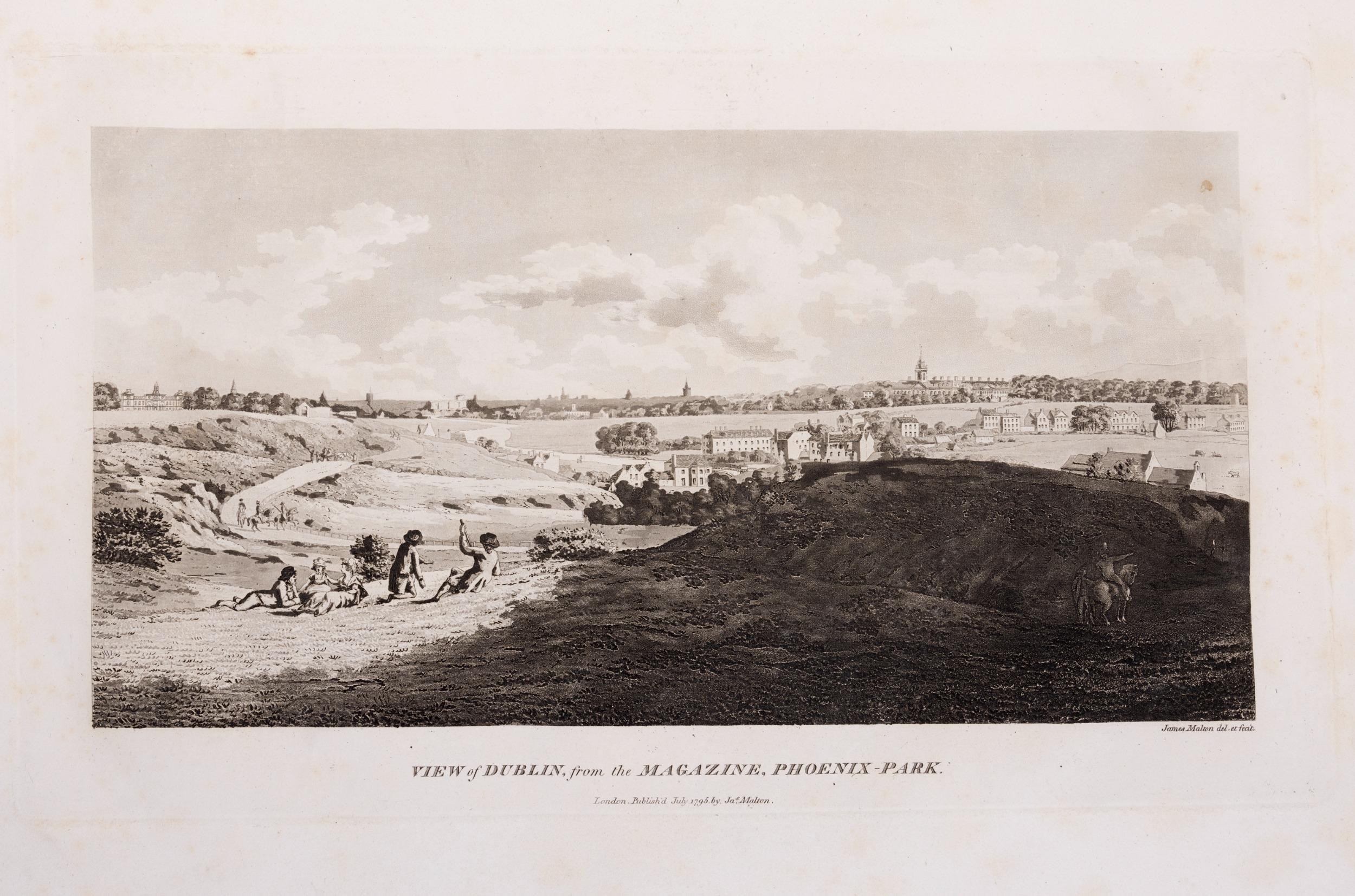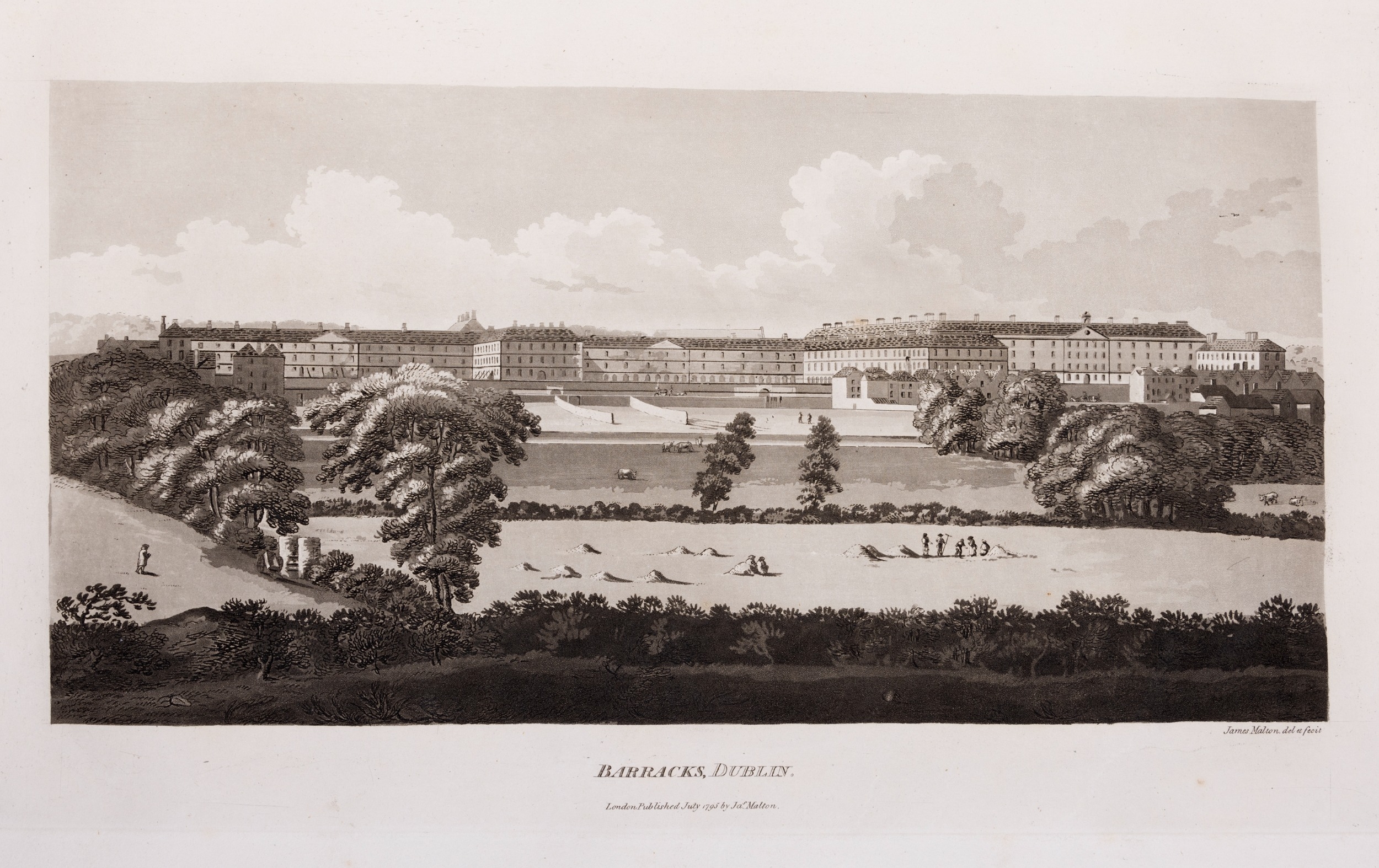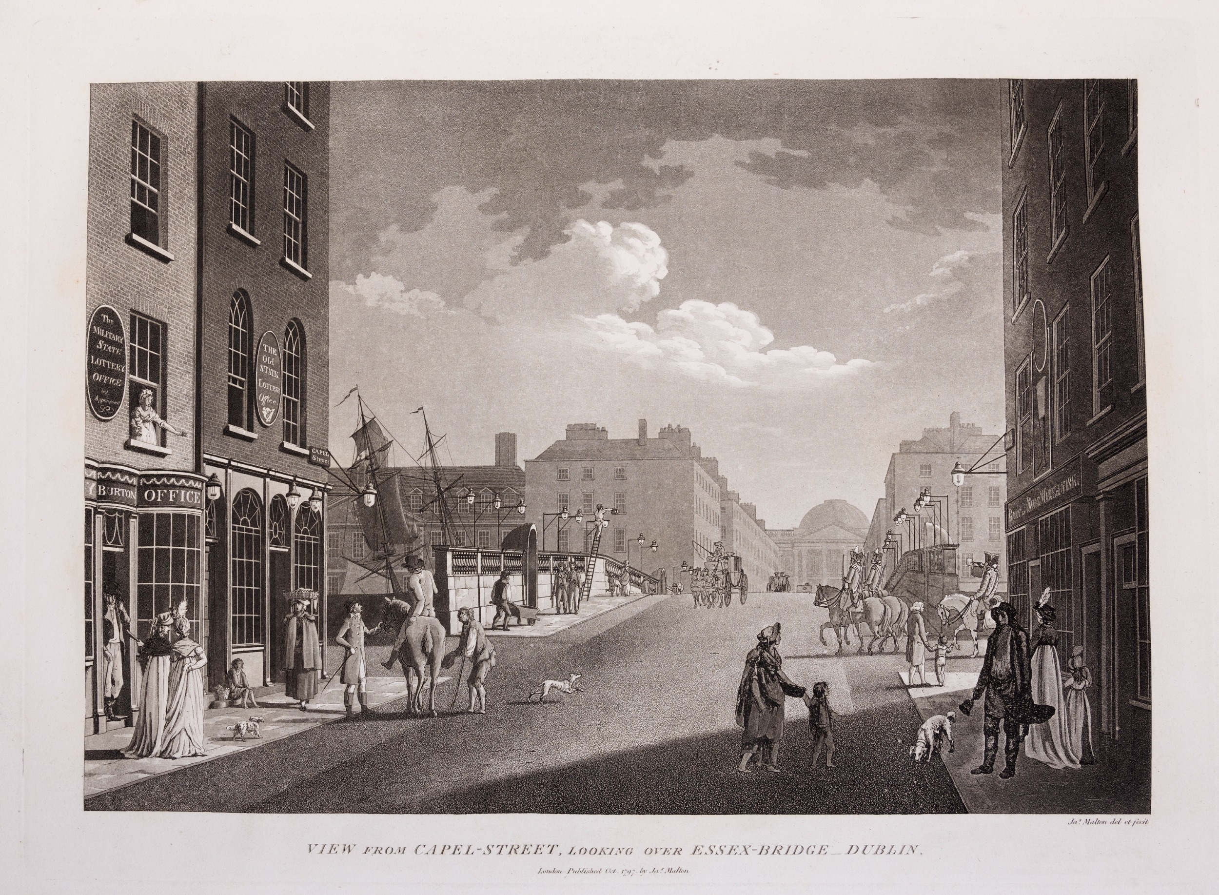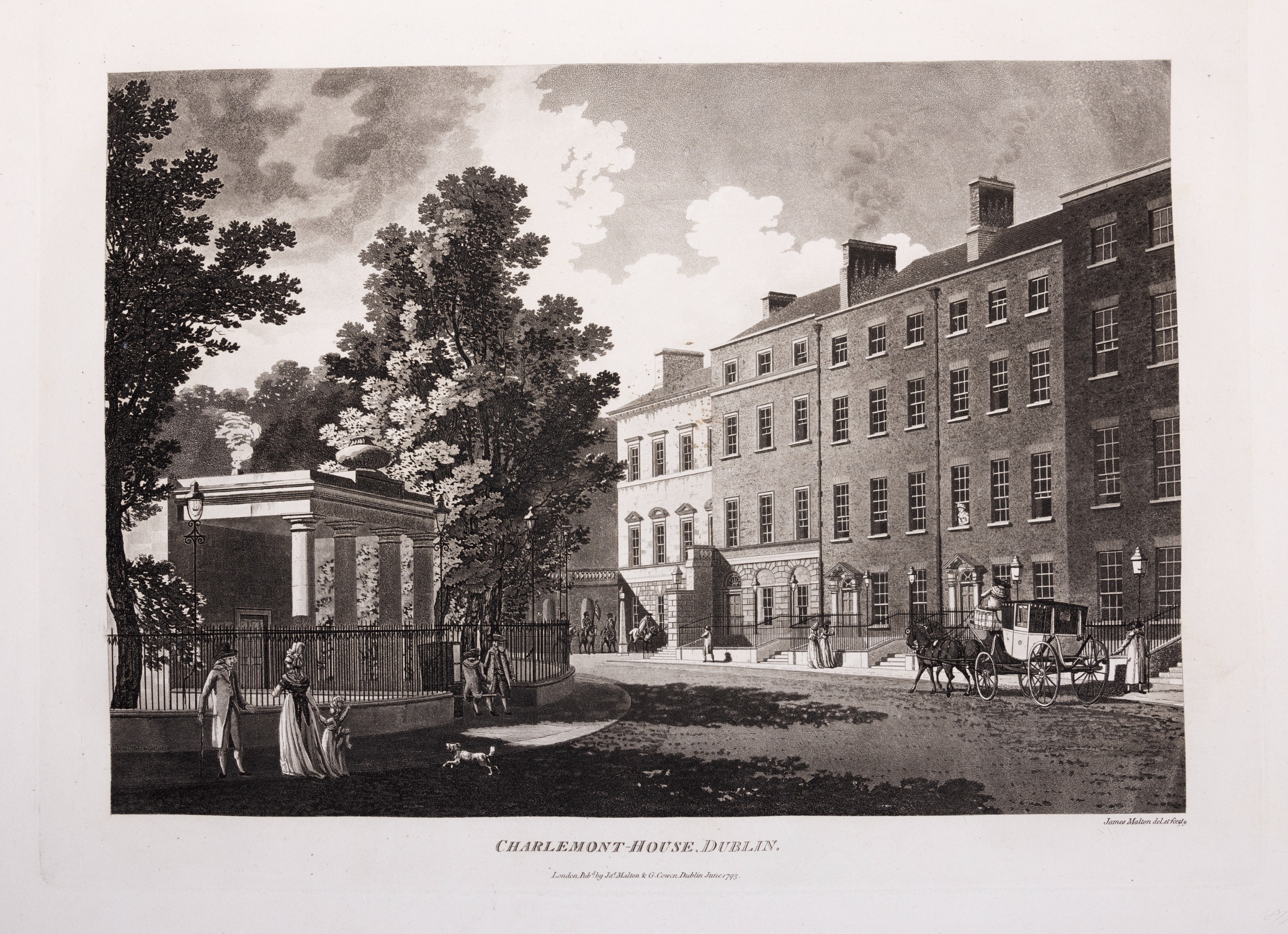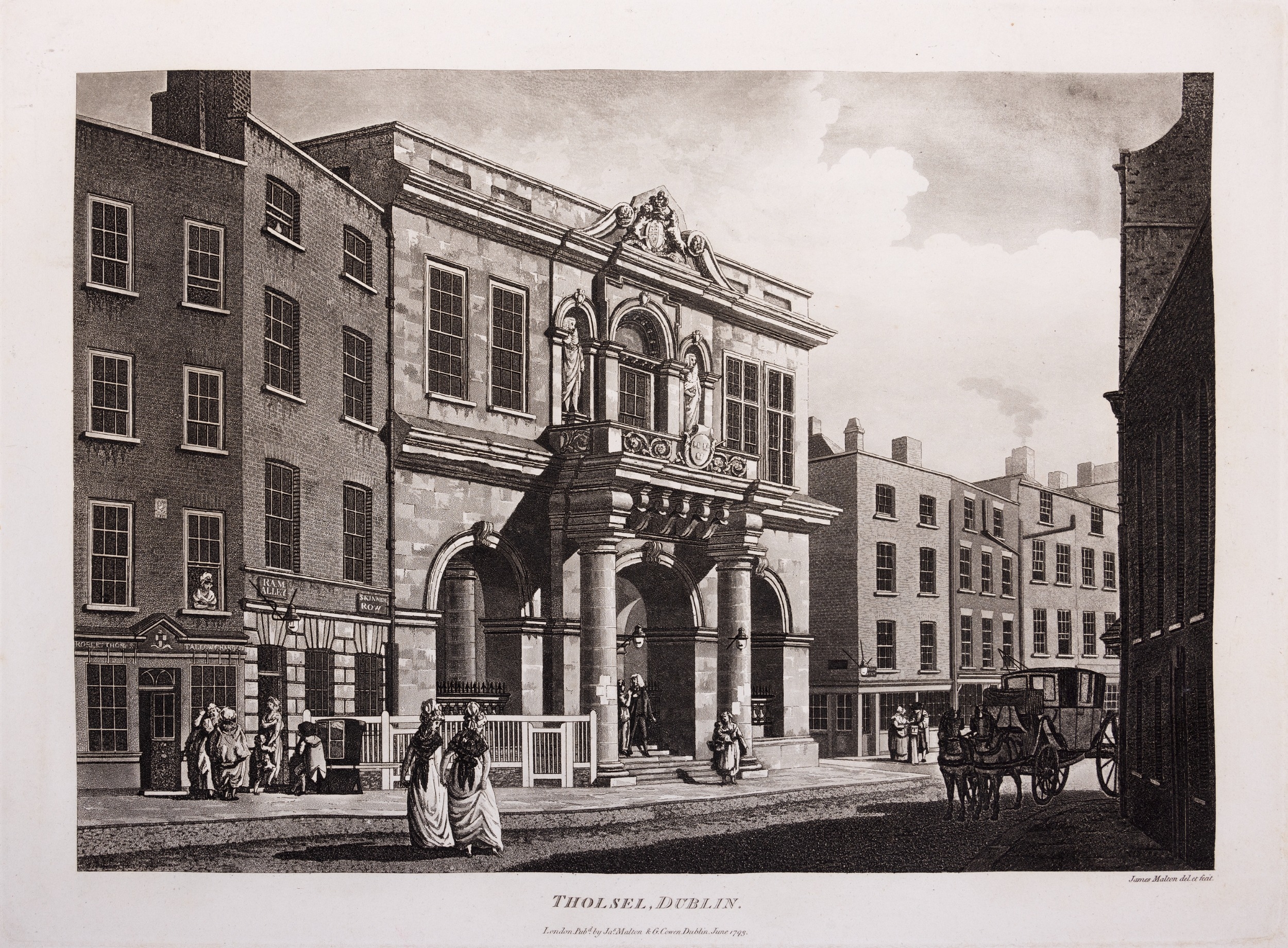 JAMES MALTON (1761-1803) A PICTURESQUE AND DESCRIPTIVE VIEW OF THE CITY OF DUBLIN In a series of the most Interesting Scenes taken in the year 1791. By James Malton. With a brief authentic history from the earliest accounts to the present time. Oblong folio, 1809 edition, engraved titlepage and dedication, Arms of Dublin, A Correct Survey of Dublin as it stood in the year 1610, A Correct Survey of the Bay of Dublin 1795, and twenty-five plates of views. London: 1803. The plates are as follows: Great Courtyard, Dublin Castle; The Parliament House; Trinity College; College Library; Provost's House; St. Patrick's Cathedral; West Front of St. Patrick's Cathedral; Royal Exchange; Custom House; View of the Law Courts, looking up the Liffey; Tholsel; Old Soldiers Hospital, Kilmainham; Royal Infirmary, Phoenix Park; Blue Coat Hospital; Lying-in Hospital; Rotunda New Rooms; St. Catharine's Church; Marine School; Leinster House; Charlemont House; Powerscourt House; View of Capel Street, looking over Essex Bridge; St. Stephen's Green; Barracks; View of Dublin from the Magazine, Phoenix Park. Dedicated to the Governors and Directors of the Hospital, including the College Library, dedicated to Edmund Burke. Besides the above twenty-five views the bound volume contains the Arms of Dublin, as frontispiece; Survey of the City of Dublin as it stood in 1610, taken from Speed's Map; Survey of the Bay of Dublin, 1795, and a folding map of Dublin by Faden . At the end of the volume is a plate with two outline Keys - one of the smaller View of Dublin from the Park, the other of the smaller view of the Barracks. All the plates are inscribed James Malton del. et fecit James Malton’s A Picturesque and Descriptive View of the City of Dublin (1799) constitutes a significant artistic and historical document, reflecting the author’s profound admiration for the city’s architectural grandeur. In the preface, Malton expresses his desire to bring Dublin into the cultural spotlight, believing it to be a capital that had been unjustly neglected. His work, however, emerges from a context marked by both professional turmoil and personal ambition. “Few cities can boast more extensive conveniences, more eminent beauties, than Dublin… To convey to the curious inquirer adequate ideas of those objects; to diffuse information of a Capital so long undesertly unnoticed, and to give it that place in estimation with regard to others it merits, this work was undertaken.” Preface, A Picturesque and Descriptive view of the City of Dublin, James Malton, 1799 Born in England in 1765, Malton was the son of Thomas Malton, a noted architectural draughtsman and instructor in geometry and perspective. The Malton family relocated to Dublin in 1769, where the elder Malton sought to establish himself within the city’s vibrant architectural scene. In 1781, through his father’s connections, James Malton secured a position as a drawing clerk under the esteemed architect James Gandon, who was then overseeing the construction of the Custom House, one of the city’s most important public buildings. Despite initial praise from Gandon, Malton’s tenure was short-lived; he was dismissed due to what Gandon described as breaches of professional trust and misconduct. This dismissal later culminated in an anonymous and caustic critique of Gandon’s architectural designs, published in 1787—a possible act of retaliation by Malton or his father. That same year, Malton failed in his candidacy for the position of Master of the Dublin Society’s School of Architectural Drawing. Undeterred by these setbacks, Malton devoted himself to documenting the architecture of Dublin. By 1791, he had completed a comprehensive series of architectural drawings capturing the city’s most prominent buildings. These drawings vividly depicted Dublin’s Georgian streetscapes with great detail and accuracy. The engravings were issued in six instalments between 1792 and 1799, with the final bound volume published that same year, complete with descriptive text. Malton’s engravings are not merely technical records but are imbued with an artistic vision that animates the architecture of late eighteenth-century Dublin. His Picturesque and Descriptive View situates Dublin within the aesthetic discourses of the time, contributing to the visual and cultural representation of the city.