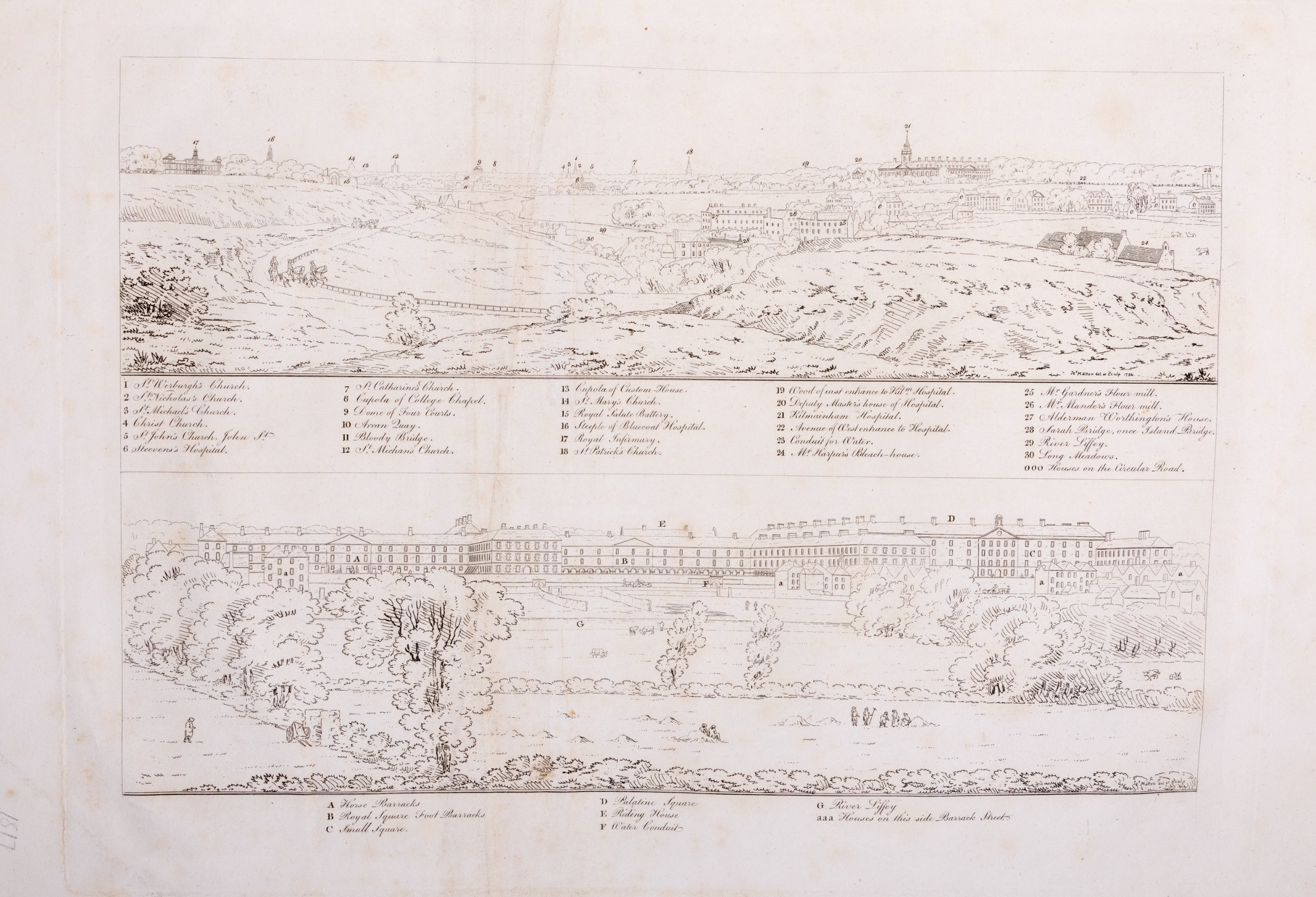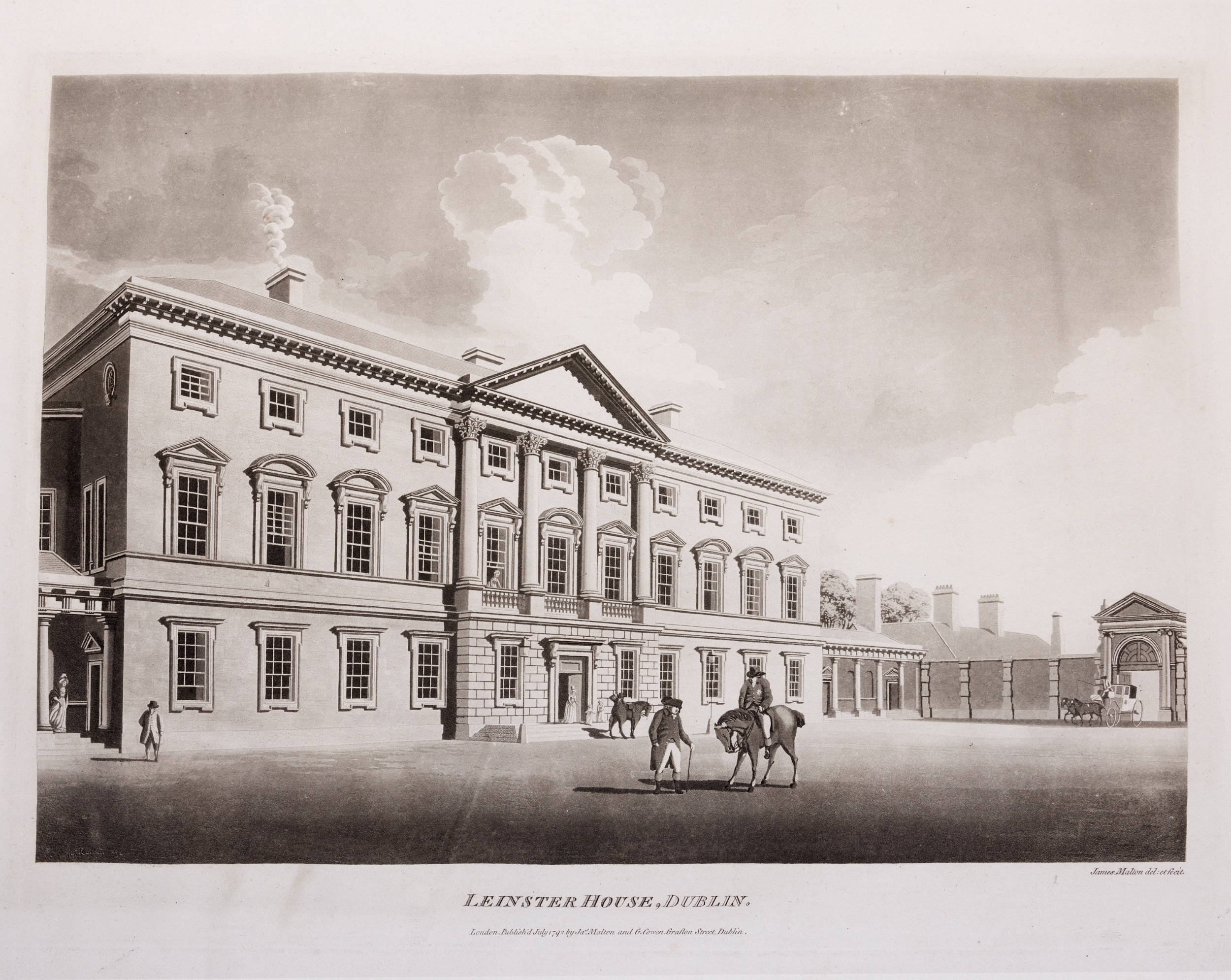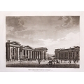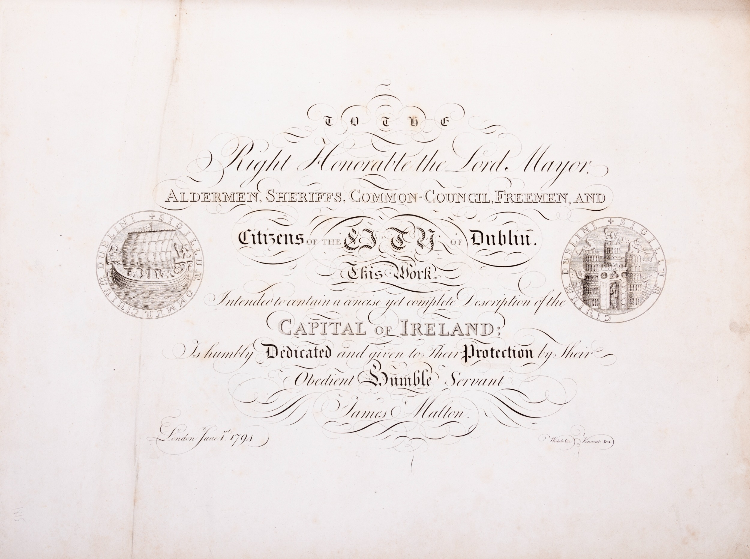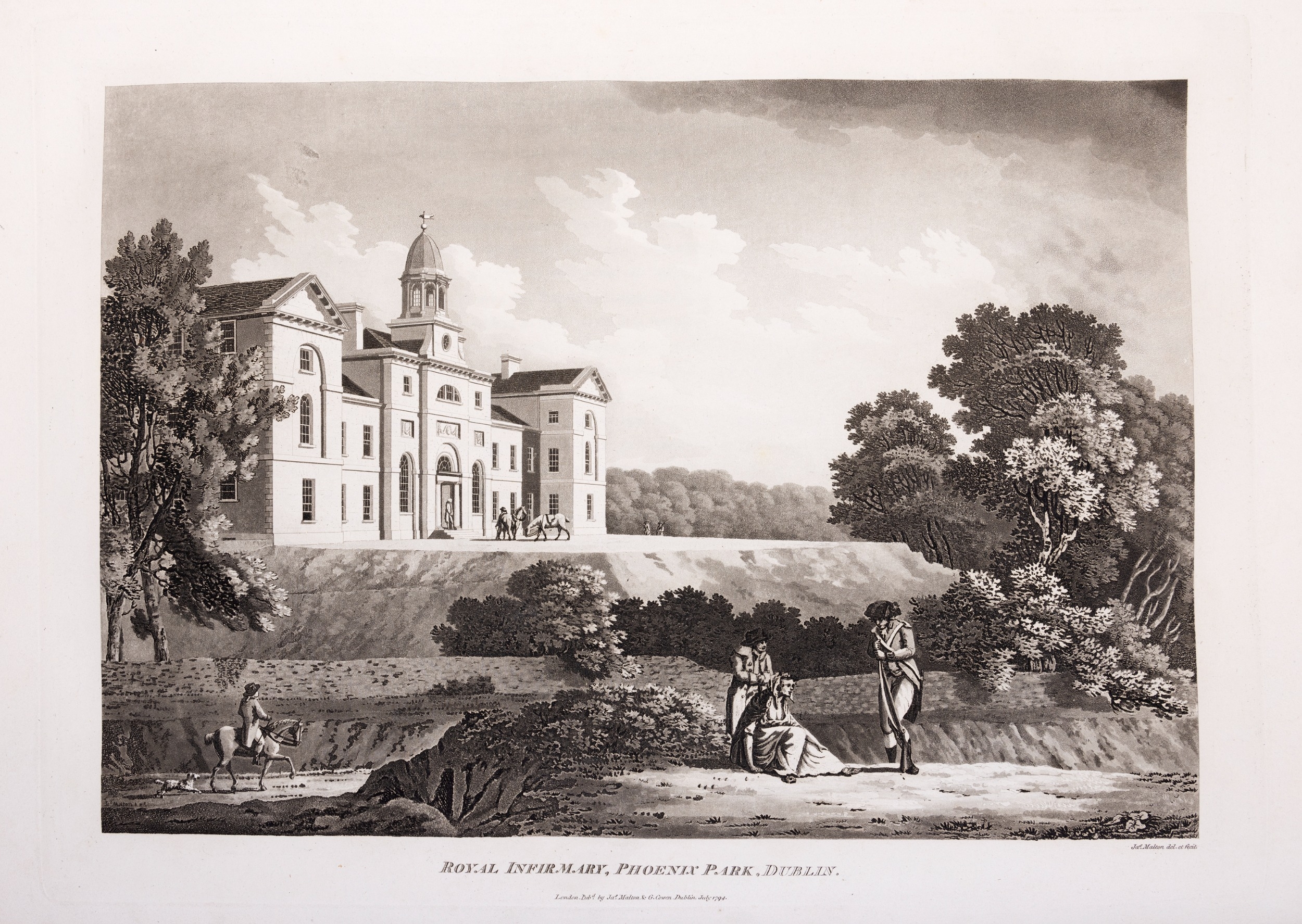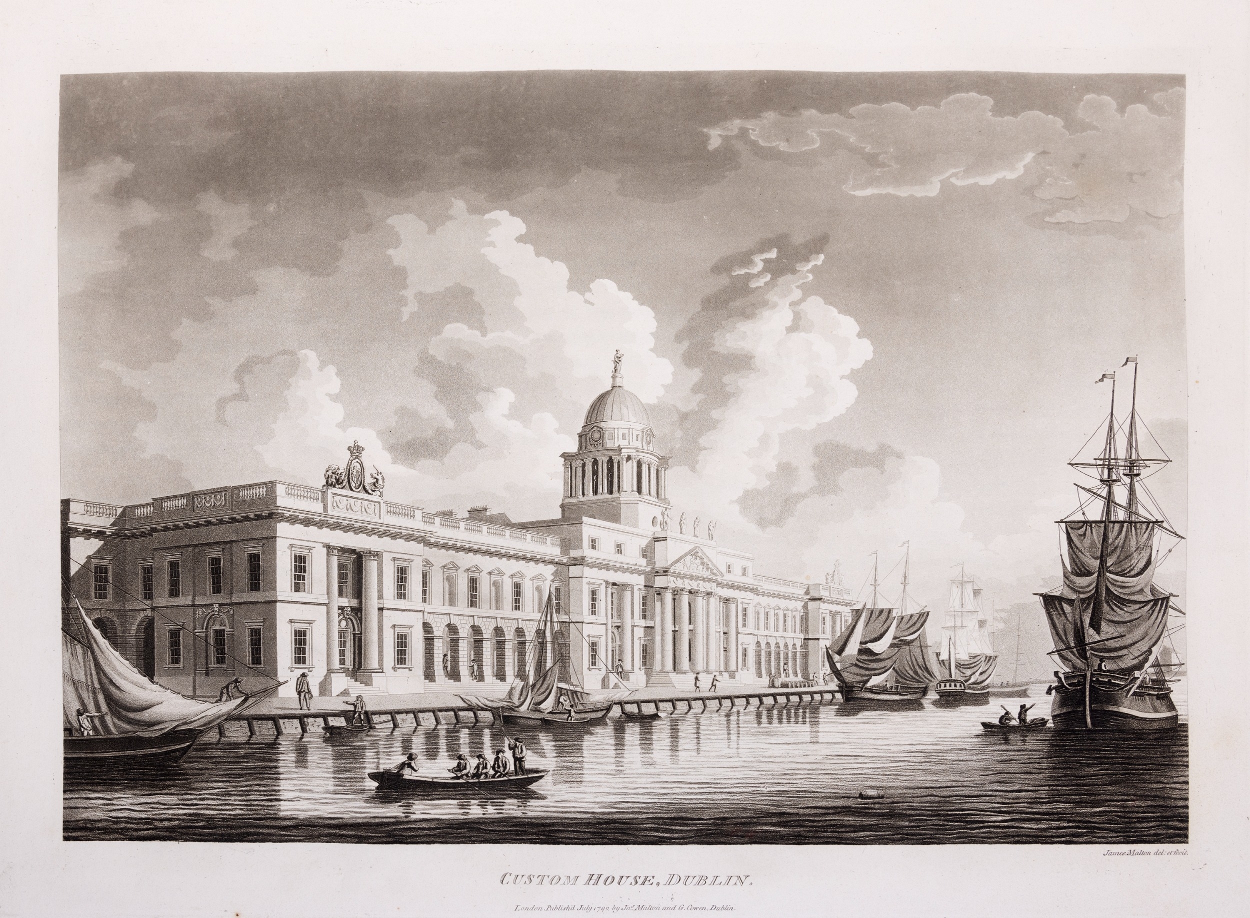 JAMES MALTON (1761-1803) A PICTURESQUE AND DESCRIPTIVE VIEW OF THE CITY OF DUBLIN In a series of the most Interesting Scenes taken in the year 1791. By James Malton. With a brief authentic history from the earliest accounts to the present time. Oblong folio, 1809 edition, engraved titlepage and dedication, Arms of Dublin, A Correct Survey of Dublin as it stood in the year 1610, A Correct Survey of the Bay of Dublin 1795, and twenty-five plates of views. London: 1803. The plates are as follows: Great Courtyard, Dublin Castle; The Parliament House; Trinity College; College Library; Provost's House; St. Patrick's Cathedral; West Front of St. Patrick's Cathedral; Royal Exchange; Custom House; View of the Law Courts, looking up the Liffey; Tholsel; Old Soldiers Hospital, Kilmainham; Royal Infirmary, Phoenix Park; Blue Coat Hospital; Lying-in Hospital; Rotunda New Rooms; St. Catharine's Church; Marine School; Leinster House; Charlemont House; Powerscourt House; View of Capel Street, looking over Essex Bridge; St. Stephen's Green; Barracks; View of Dublin from the Magazine, Phoenix Park. Dedicated to the Governors and Directors of the Hospital, including the College Library, dedicated to Edmund Burke. Besides the above twenty-five views the bound volume contains the Arms of Dublin, as frontispiece; Survey of the City of Dublin as it stood in 1610, taken from Speed's Map; Survey of the Bay of Dublin, 1795, and a folding map of Dublin by Faden . At the end of the volume is a plate with two outline Keys - one of the smaller View of Dublin from the Park, the other of the smaller view of the Barracks. All the plates are inscribed James Malton del. et fecit James Malton’s A Picturesque and Descriptive View of the City of Dublin (1799) constitutes a significant artistic and historical document, reflecting the author’s profound admiration for the city’s architectural grandeur. In the preface, Malton expresses his desire to bring Dublin into the cultural spotlight, believing it to be a capital that had been unjustly neglected. His work, however, emerges from a context marked by both professional turmoil and personal ambition. “Few cities can boast more extensive conveniences, more eminent beauties, than Dublin… To convey to the curious inquirer adequate ideas of those objects; to diffuse information of a Capital so long undesertly unnoticed, and to give it that place in estimation with regard to others it merits, this work was undertaken.” Preface, A Picturesque and Descriptive view of the City of Dublin, James Malton, 1799 Born in England in 1765, Malton was the son of Thomas Malton, a noted architectural draughtsman and instructor in geometry and perspective. The Malton family relocated to Dublin in 1769, where the elder Malton sought to establish himself within the city’s vibrant architectural scene. In 1781, through his father’s connections, James Malton secured a position as a drawing clerk under the esteemed architect James Gandon, who was then overseeing the construction of the Custom House, one of the city’s most important public buildings. Despite initial praise from Gandon, Malton’s tenure was short-lived; he was dismissed due to what Gandon described as breaches of professional trust and misconduct. This dismissal later culminated in an anonymous and caustic critique of Gandon’s architectural designs, published in 1787—a possible act of retaliation by Malton or his father. That same year, Malton failed in his candidacy for the position of Master of the Dublin Society’s School of Architectural Drawing. Undeterred by these setbacks, Malton devoted himself to documenting the architecture of Dublin. By 1791, he had completed a comprehensive series of architectural drawings capturing the city’s most prominent buildings. These drawings vividly depicted Dublin’s Georgian streetscapes with great detail and accuracy. The engravings were issued in six instalments between 1792 and 1799, with the final bound volume published that same year, complete with descriptive text. Malton’s engravings are not merely technical records but are imbued with an artistic vision that animates the architecture of late eighteenth-century Dublin. His Picturesque and Descriptive View situates Dublin within the aesthetic discourses of the time, contributing to the visual and cultural representation of the city.