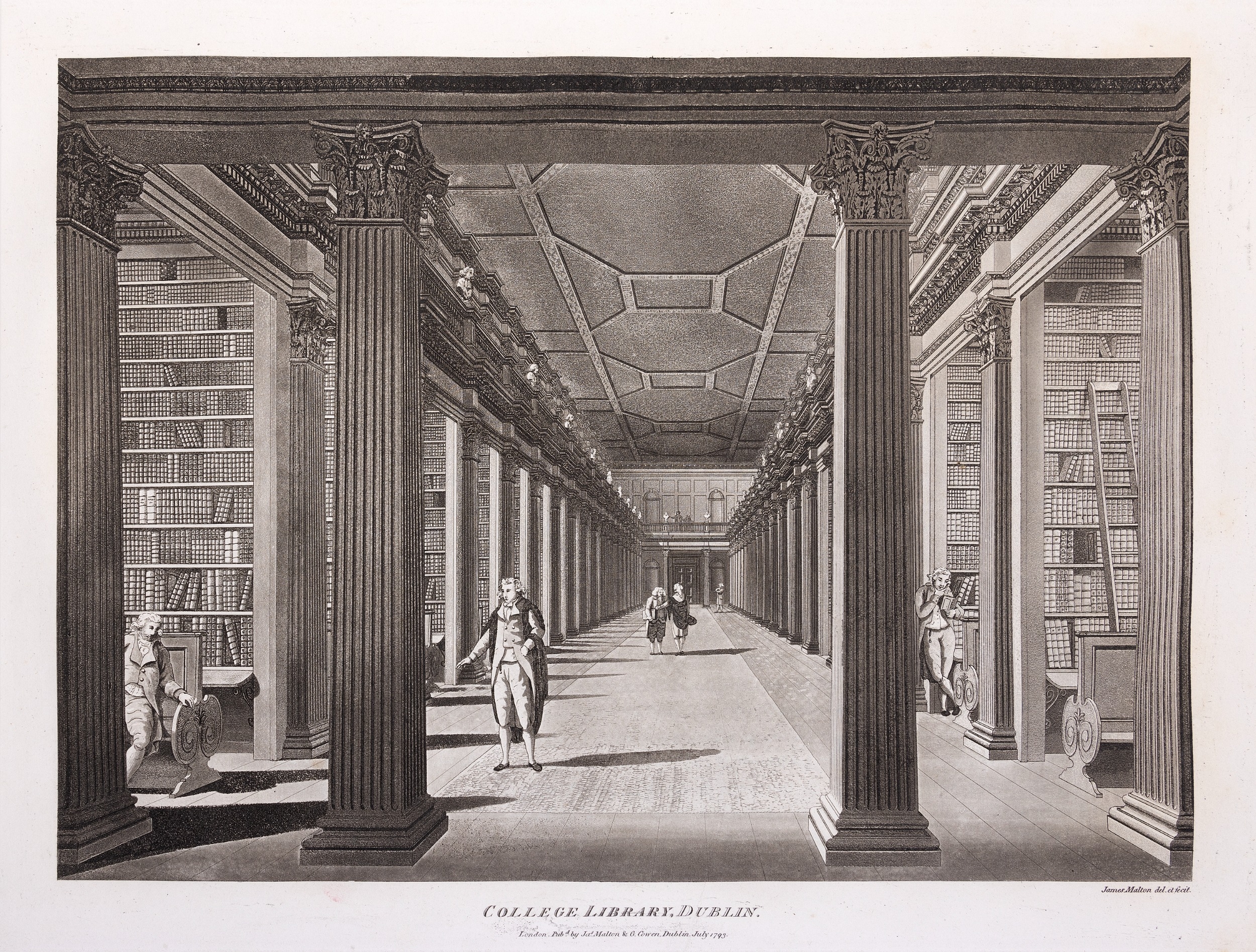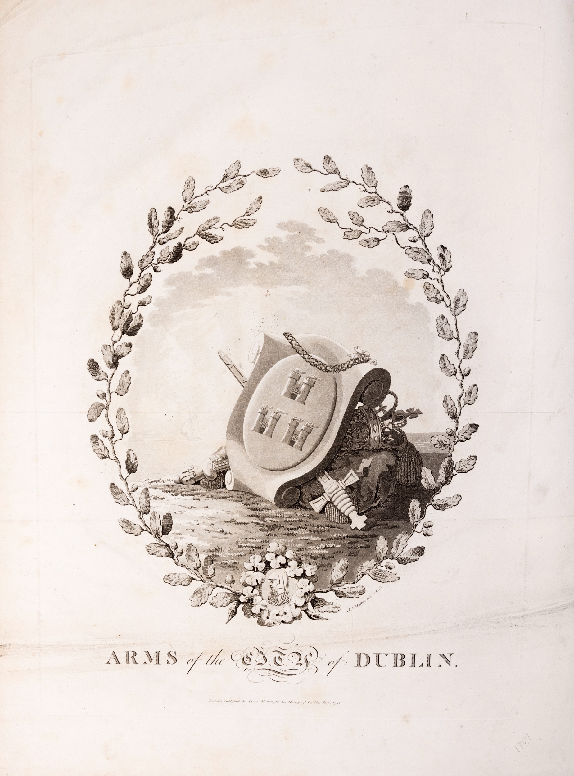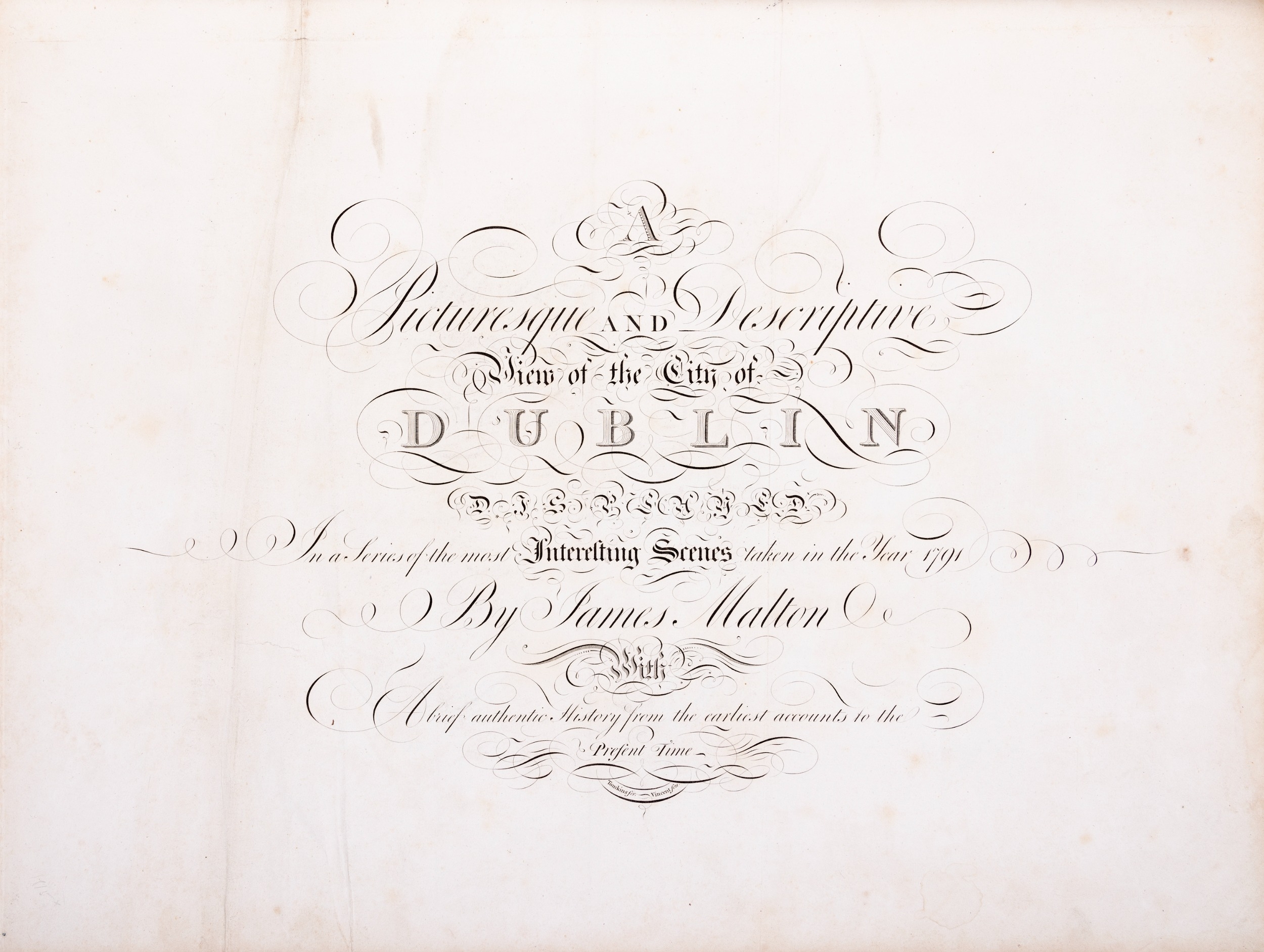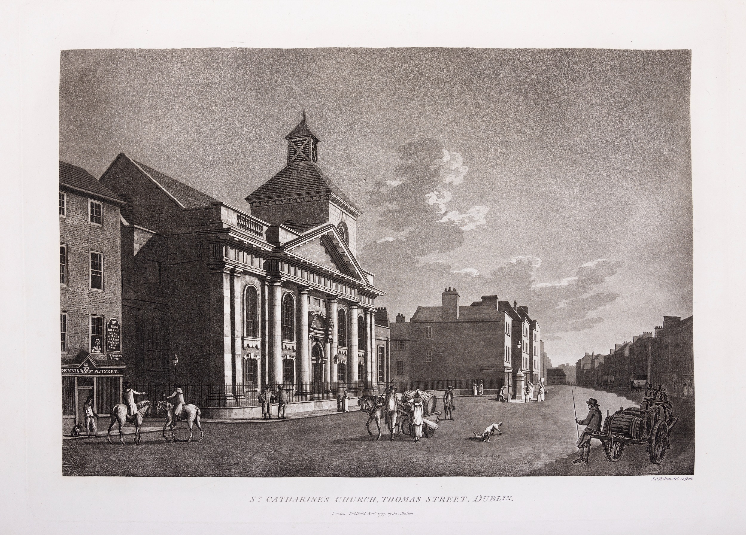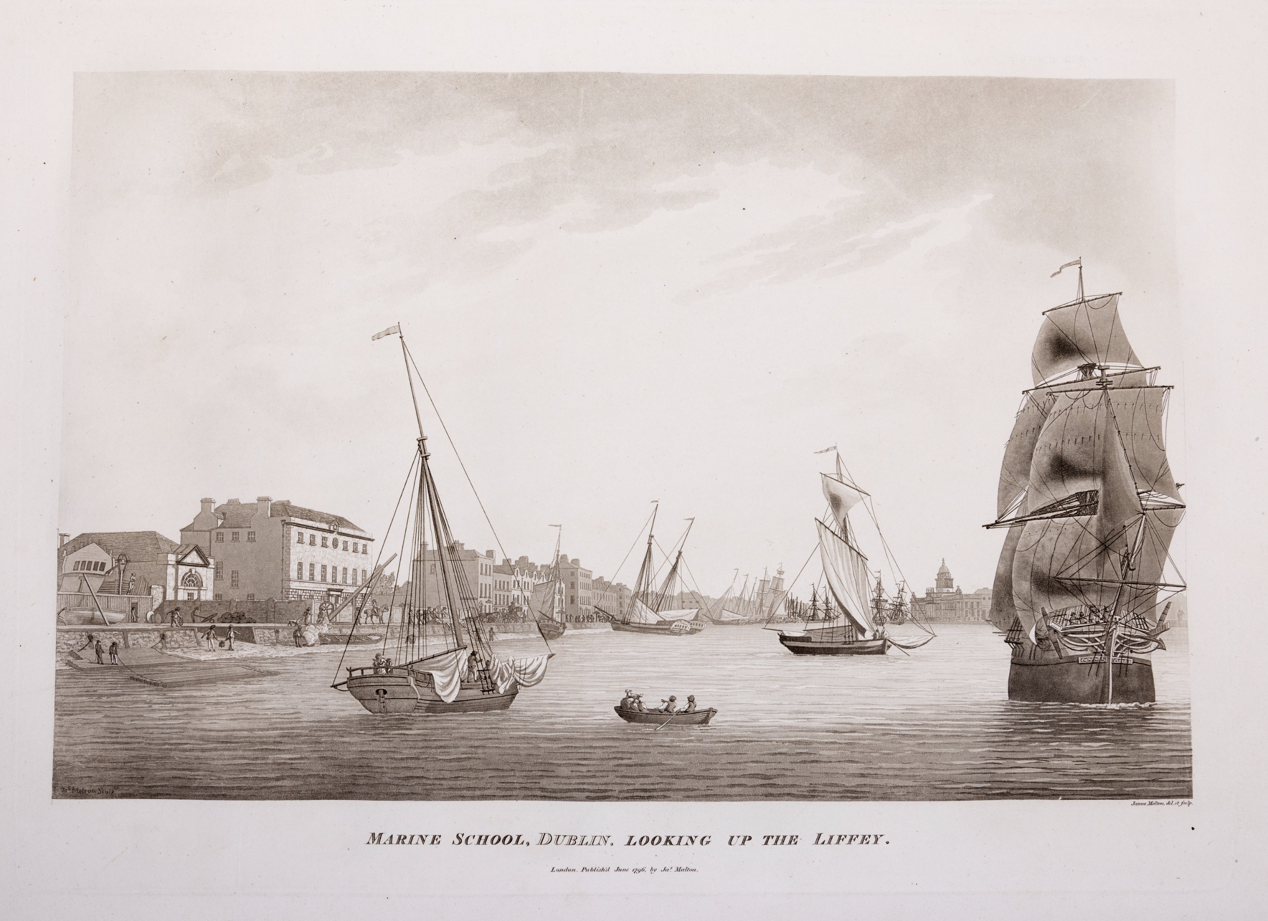 JAMES MALTON (1761-1803) A PICTURESQUE AND DESCRIPTIVE VIEW OF THE CITY OF DUBLIN In a series of the most Interesting Scenes taken in the year 1791. By James Malton. With a brief authentic history from the earliest accounts to the present time. Oblong folio, 1809 edition, engraved titlepage and dedication, Arms of Dublin, A Correct Survey of Dublin as it stood in the year 1610, A Correct Survey of the Bay of Dublin 1795, and twenty-five plates of views. London: 1803. The plates are as follows: Great Courtyard, Dublin Castle; The Parliament House; Trinity College; College Library; Provost's House; St. Patrick's Cathedral; West Front of St. Patrick's Cathedral; Royal Exchange; Custom House; View of the Law Courts, looking up the Liffey; Tholsel; Old Soldiers Hospital, Kilmainham; Royal Infirmary, Phoenix Park; Blue Coat Hospital; Lying-in Hospital; Rotunda New Rooms; St. Catharine's Church; Marine School; Leinster House; Charlemont House; Powerscourt House; View of Capel Street, looking over Essex Bridge; St. Stephen's Green; Barracks; View of Dublin from the Magazine, Phoenix Park. Dedicated to the Governors and Directors of the Hospital, including the College Library, dedicated to Edmund Burke. Besides the above twenty-five views the bound volume contains the Arms of Dublin, as frontispiece; Survey of the City of Dublin as it stood in 1610, taken from Speed's Map; Survey of the Bay of Dublin, 1795, and a folding map of Dublin by Faden . At the end of the volume is a plate with two outline Keys - one of the smaller View of Dublin from the Park, the other of the smaller view of the Barracks. All the plates are inscribed James Malton del. et fecit James Malton’s A Picturesque and Descriptive View of the City of Dublin (1799) constitutes a significant artistic and historical document, reflecting the author’s profound admiration for the city’s architectural grandeur. In the preface, Malton expresses his desire to bring Dublin into the cultural spotlight, believing it to be a capital that had been unjustly neglected. His work, however, emerges from a context marked by both professional turmoil and personal ambition. “Few cities can boast more extensive conveniences, more eminent beauties, than Dublin… To convey to the curious inquirer adequate ideas of those objects; to diffuse information of a Capital so long undesertly unnoticed, and to give it that place in estimation with regard to others it merits, this work was undertaken.” Preface, A Picturesque and Descriptive view of the City of Dublin, James Malton, 1799 Born in England in 1765, Malton was the son of Thomas Malton, a noted architectural draughtsman and instructor in geometry and perspective. The Malton family relocated to Dublin in 1769, where the elder Malton sought to establish himself within the city’s vibrant architectural scene. In 1781, through his father’s connections, James Malton secured a position as a drawing clerk under the esteemed architect James Gandon, who was then overseeing the construction of the Custom House, one of the city’s most important public buildings. Despite initial praise from Gandon, Malton’s tenure was short-lived; he was dismissed due to what Gandon described as breaches of professional trust and misconduct. This dismissal later culminated in an anonymous and caustic critique of Gandon’s architectural designs, published in 1787—a possible act of retaliation by Malton or his father. That same year, Malton failed in his candidacy for the position of Master of the Dublin Society’s School of Architectural Drawing. Undeterred by these setbacks, Malton devoted himself to documenting the architecture of Dublin. By 1791, he had completed a comprehensive series of architectural drawings capturing the city’s most prominent buildings. These drawings vividly depicted Dublin’s Georgian streetscapes with great detail and accuracy. The engravings were issued in six instalments between 1792 and 1799, with the final bound volume published that same year, complete with descriptive text. Malton’s engravings are not merely technical records but are imbued with an artistic vision that animates the architecture of late eighteenth-century Dublin. His Picturesque and Descriptive View situates Dublin within the aesthetic discourses of the time, contributing to the visual and cultural representation of the city.