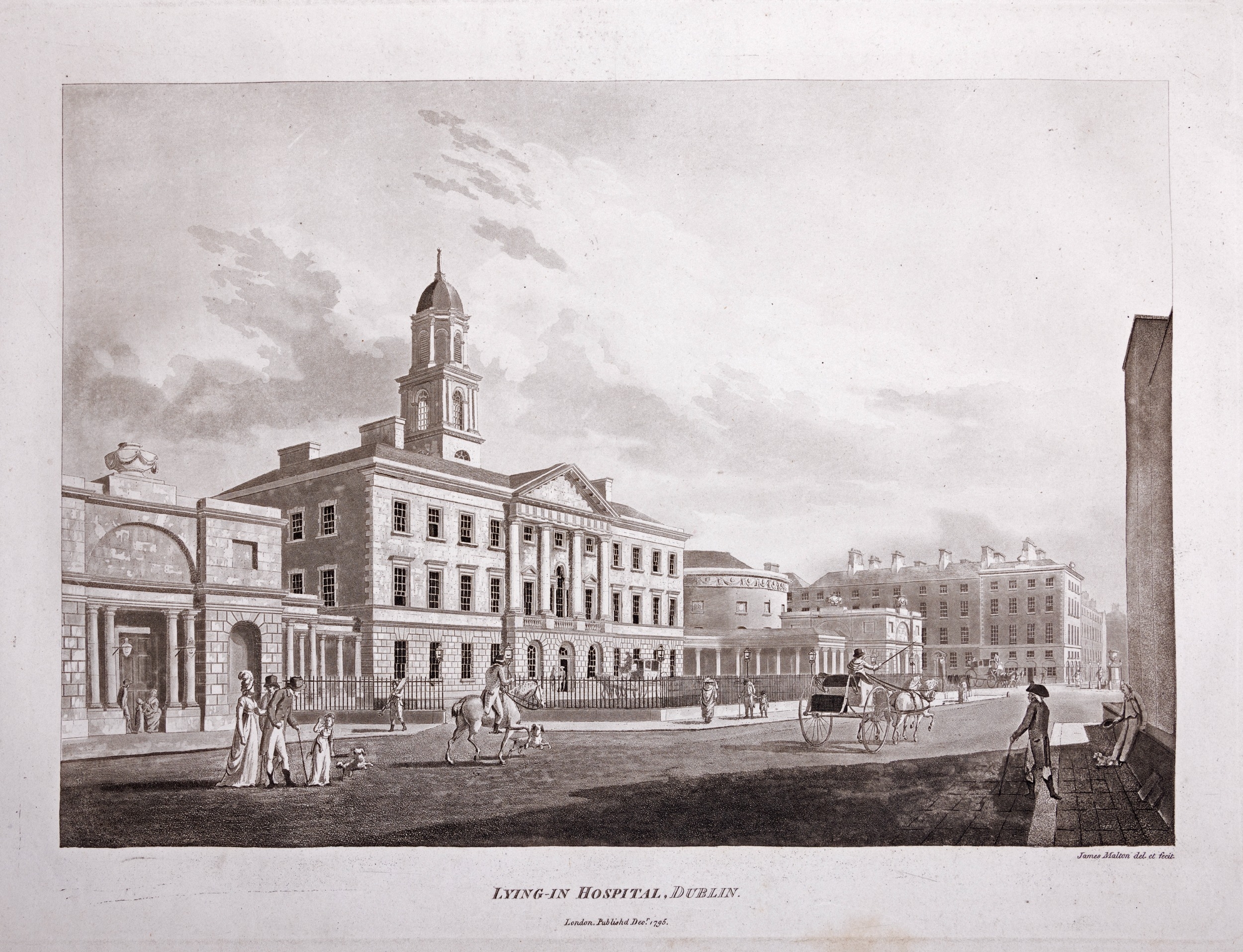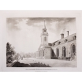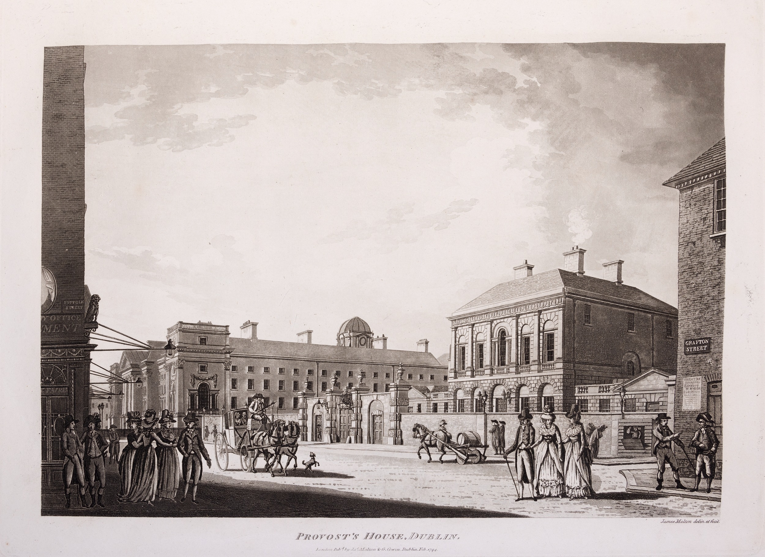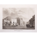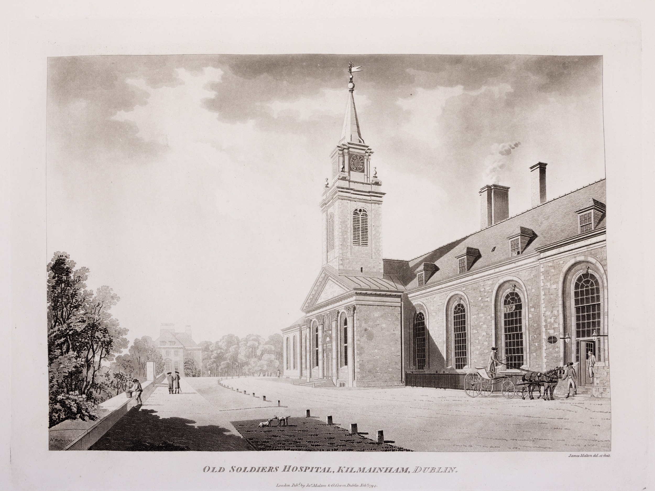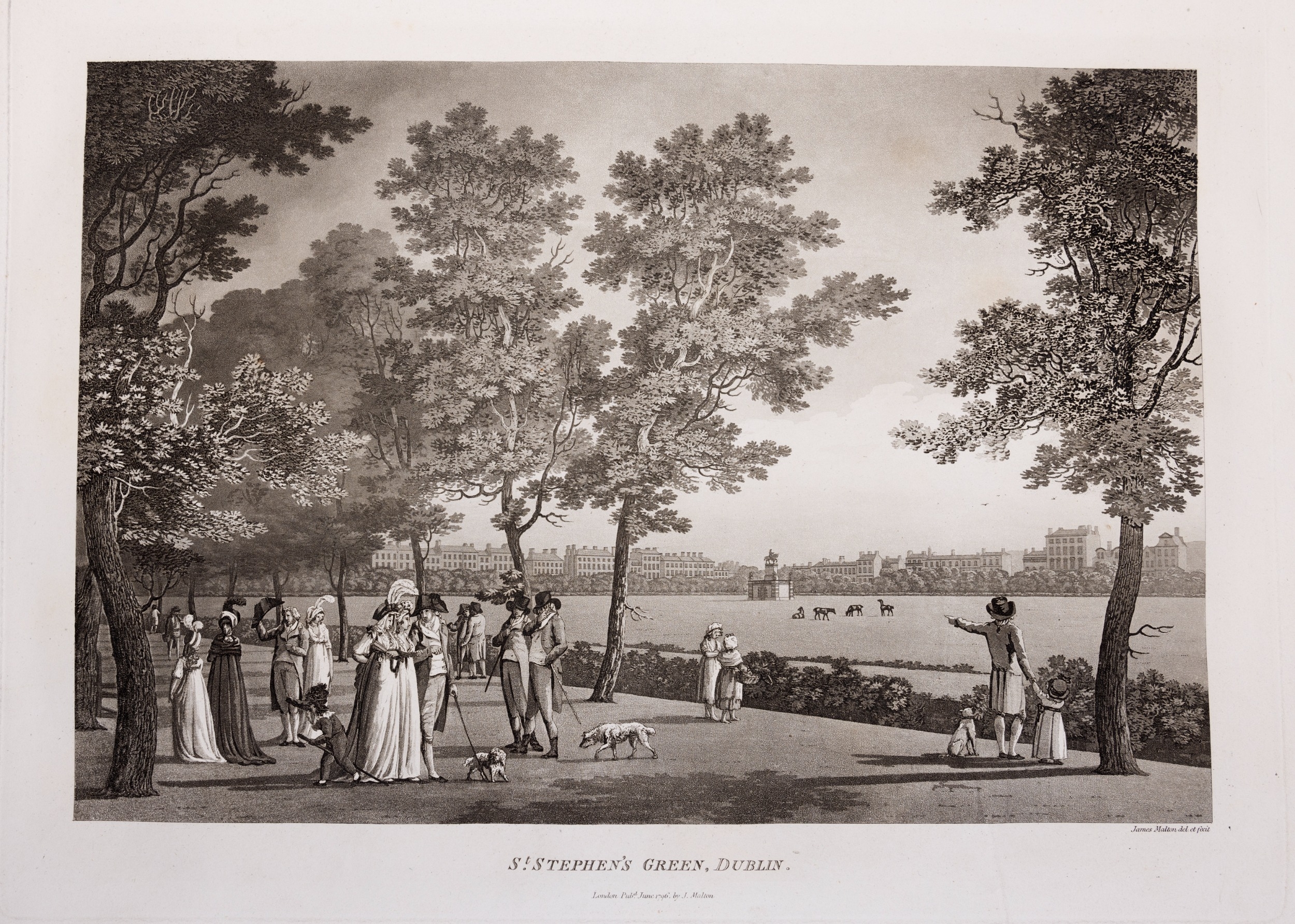 JAMES MALTON (1761-1803) A PICTURESQUE AND DESCRIPTIVE VIEW OF THE CITY OF DUBLIN In a series of the most Interesting Scenes taken in the year 1791. By James Malton. With a brief authentic history from the earliest accounts to the present time. Oblong folio, 1809 edition, engraved titlepage and dedication, Arms of Dublin, A Correct Survey of Dublin as it stood in the year 1610, A Correct Survey of the Bay of Dublin 1795, and twenty-five plates of views. London: 1803. The plates are as follows: Great Courtyard, Dublin Castle; The Parliament House; Trinity College; College Library; Provost's House; St. Patrick's Cathedral; West Front of St. Patrick's Cathedral; Royal Exchange; Custom House; View of the Law Courts, looking up the Liffey; Tholsel; Old Soldiers Hospital, Kilmainham; Royal Infirmary, Phoenix Park; Blue Coat Hospital; Lying-in Hospital; Rotunda New Rooms; St. Catharine's Church; Marine School; Leinster House; Charlemont House; Powerscourt House; View of Capel Street, looking over Essex Bridge; St. Stephen's Green; Barracks; View of Dublin from the Magazine, Phoenix Park. Dedicated to the Governors and Directors of the Hospital, including the College Library, dedicated to Edmund Burke. Besides the above twenty-five views the bound volume contains the Arms of Dublin, as frontispiece; Survey of the City of Dublin as it stood in 1610, taken from Speed's Map; Survey of the Bay of Dublin, 1795, and a folding map of Dublin by Faden . At the end of the volume is a plate with two outline Keys - one of the smaller View of Dublin from the Park, the other of the smaller view of the Barracks. All the plates are inscribed James Malton del. et fecit James Malton’s A Picturesque and Descriptive View of the City of Dublin (1799) constitutes a significant artistic and historical document, reflecting the author’s profound admiration for the city’s architectural grandeur. In the preface, Malton expresses his desire to bring Dublin into the cultural spotlight, believing it to be a capital that had been unjustly neglected. His work, however, emerges from a context marked by both professional turmoil and personal ambition. “Few cities can boast more extensive conveniences, more eminent beauties, than Dublin… To convey to the curious inquirer adequate ideas of those objects; to diffuse information of a Capital so long undesertly unnoticed, and to give it that place in estimation with regard to others it merits, this work was undertaken.” Preface, A Picturesque and Descriptive view of the City of Dublin, James Malton, 1799 Born in England in 1765, Malton was the son of Thomas Malton, a noted architectural draughtsman and instructor in geometry and perspective. The Malton family relocated to Dublin in 1769, where the elder Malton sought to establish himself within the city’s vibrant architectural scene. In 1781, through his father’s connections, James Malton secured a position as a drawing clerk under the esteemed architect James Gandon, who was then overseeing the construction of the Custom House, one of the city’s most important public buildings. Despite initial praise from Gandon, Malton’s tenure was short-lived; he was dismissed due to what Gandon described as breaches of professional trust and misconduct. This dismissal later culminated in an anonymous and caustic critique of Gandon’s architectural designs, published in 1787—a possible act of retaliation by Malton or his father. That same year, Malton failed in his candidacy for the position of Master of the Dublin Society’s School of Architectural Drawing. Undeterred by these setbacks, Malton devoted himself to documenting the architecture of Dublin. By 1791, he had completed a comprehensive series of architectural drawings capturing the city’s most prominent buildings. These drawings vividly depicted Dublin’s Georgian streetscapes with great detail and accuracy. The engravings were issued in six instalments between 1792 and 1799, with the final bound volume published that same year, complete with descriptive text. Malton’s engravings are not merely technical records but are imbued with an artistic vision that animates the architecture of late eighteenth-century Dublin. His Picturesque and Descriptive View situates Dublin within the aesthetic discourses of the time, contributing to the visual and cultural representation of the city.