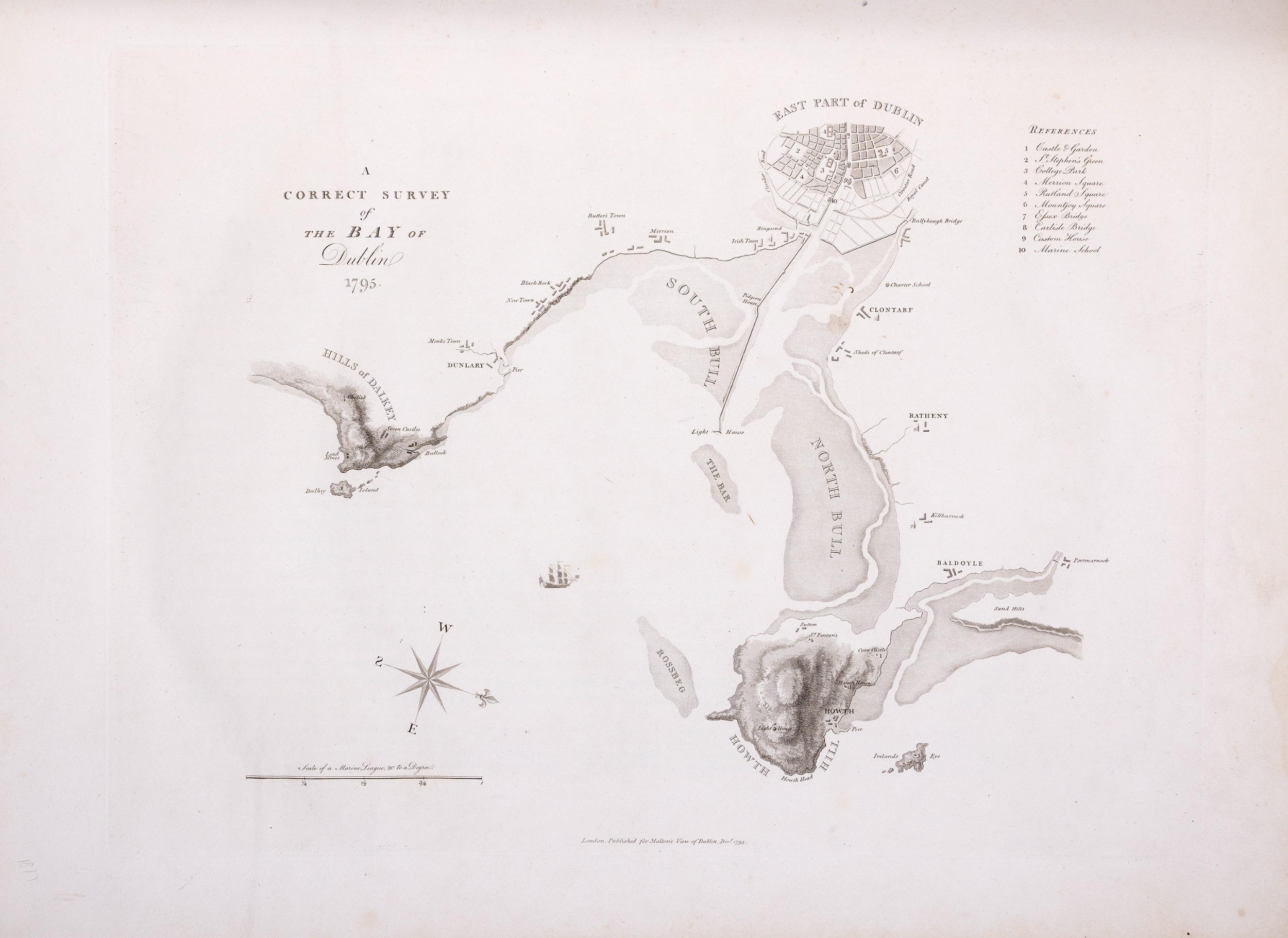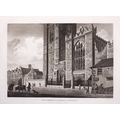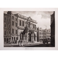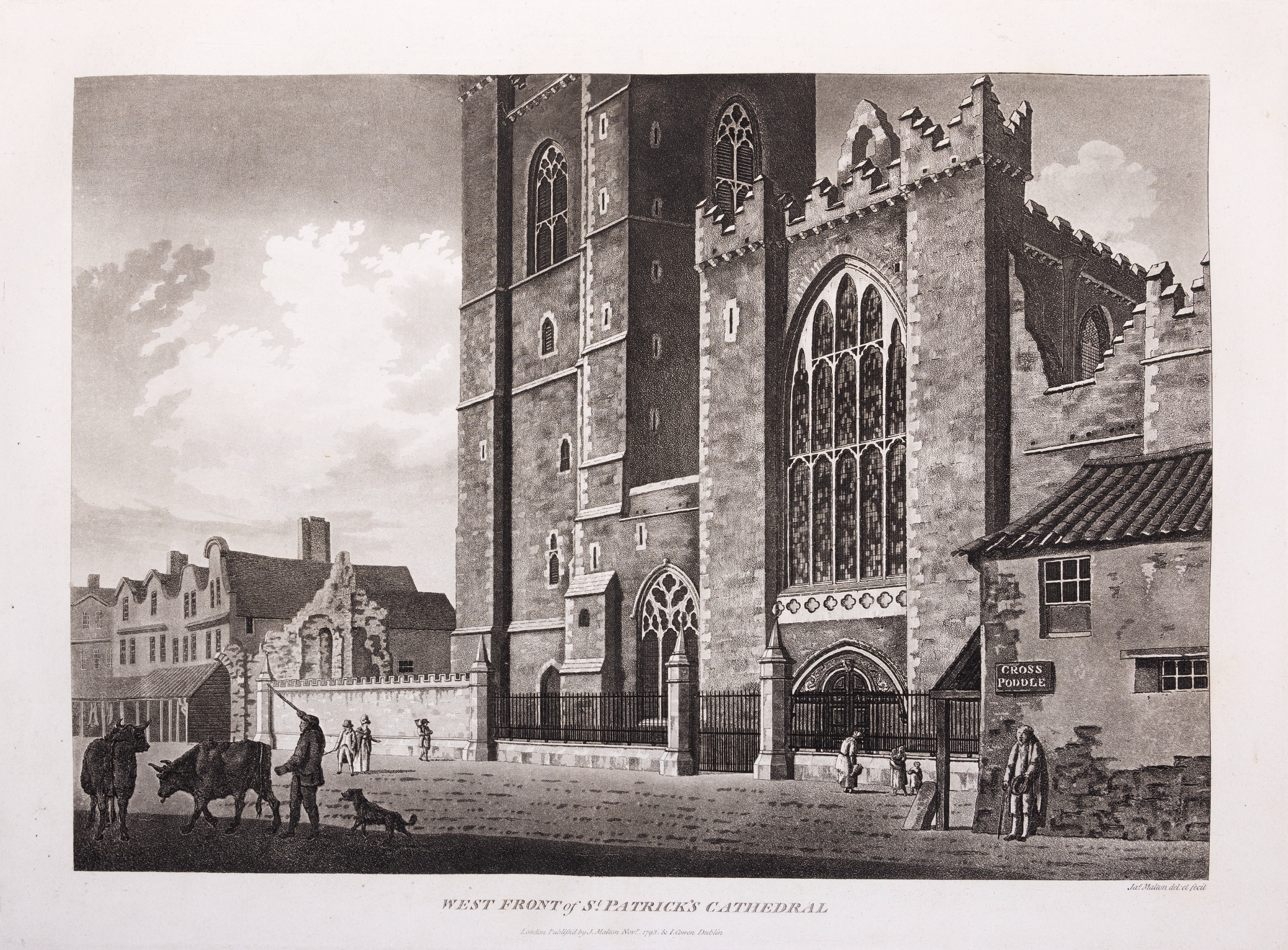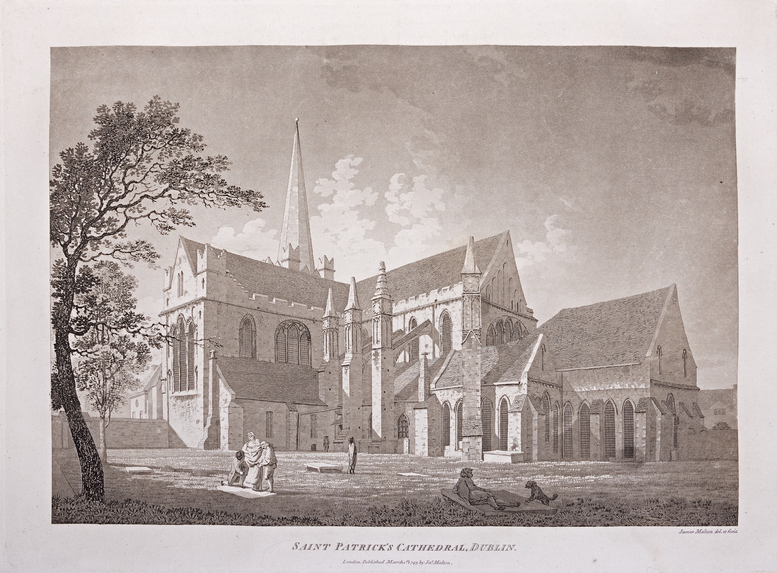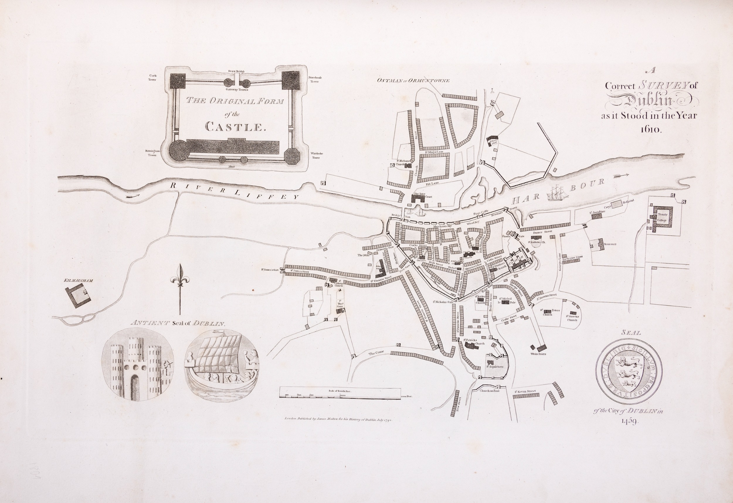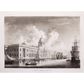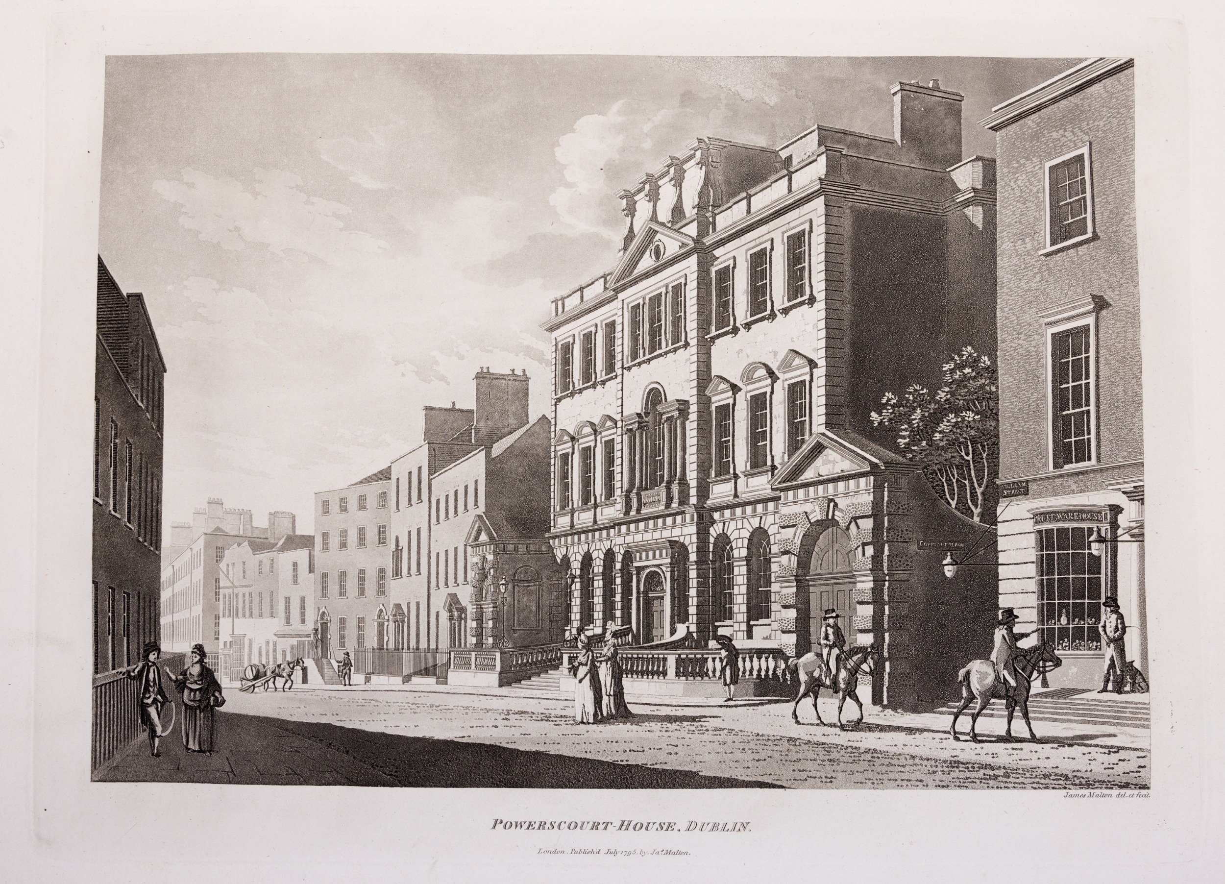 JAMES MALTON (1761-1803) A PICTURESQUE AND DESCRIPTIVE VIEW OF THE CITY OF DUBLIN In a series of the most Interesting Scenes taken in the year 1791. By James Malton. With a brief authentic history from the earliest accounts to the present time. Oblong folio, 1809 edition, engraved titlepage and dedication, Arms of Dublin, A Correct Survey of Dublin as it stood in the year 1610, A Correct Survey of the Bay of Dublin 1795, and twenty-five plates of views. London: 1803. The plates are as follows: Great Courtyard, Dublin Castle; The Parliament House; Trinity College; College Library; Provost's House; St. Patrick's Cathedral; West Front of St. Patrick's Cathedral; Royal Exchange; Custom House; View of the Law Courts, looking up the Liffey; Tholsel; Old Soldiers Hospital, Kilmainham; Royal Infirmary, Phoenix Park; Blue Coat Hospital; Lying-in Hospital; Rotunda New Rooms; St. Catharine's Church; Marine School; Leinster House; Charlemont House; Powerscourt House; View of Capel Street, looking over Essex Bridge; St. Stephen's Green; Barracks; View of Dublin from the Magazine, Phoenix Park. Dedicated to the Governors and Directors of the Hospital, including the College Library, dedicated to Edmund Burke. Besides the above twenty-five views the bound volume contains the Arms of Dublin, as frontispiece; Survey of the City of Dublin as it stood in 1610, taken from Speed's Map; Survey of the Bay of Dublin, 1795, and a folding map of Dublin by Faden . At the end of the volume is a plate with two outline Keys - one of the smaller View of Dublin from the Park, the other of the smaller view of the Barracks. All the plates are inscribed James Malton del. et fecit James Malton’s A Picturesque and Descriptive View of the City of Dublin (1799) constitutes a significant artistic and historical document, reflecting the author’s profound admiration for the city’s architectural grandeur. In the preface, Malton expresses his desire to bring Dublin into the cultural spotlight, believing it to be a capital that had been unjustly neglected. His work, however, emerges from a context marked by both professional turmoil and personal ambition. “Few cities can boast more extensive conveniences, more eminent beauties, than Dublin… To convey to the curious inquirer adequate ideas of those objects; to diffuse information of a Capital so long undesertly unnoticed, and to give it that place in estimation with regard to others it merits, this work was undertaken.” Preface, A Picturesque and Descriptive view of the City of Dublin, James Malton, 1799 Born in England in 1765, Malton was the son of Thomas Malton, a noted architectural draughtsman and instructor in geometry and perspective. The Malton family relocated to Dublin in 1769, where the elder Malton sought to establish himself within the city’s vibrant architectural scene. In 1781, through his father’s connections, James Malton secured a position as a drawing clerk under the esteemed architect James Gandon, who was then overseeing the construction of the Custom House, one of the city’s most important public buildings. Despite initial praise from Gandon, Malton’s tenure was short-lived; he was dismissed due to what Gandon described as breaches of professional trust and misconduct. This dismissal later culminated in an anonymous and caustic critique of Gandon’s architectural designs, published in 1787—a possible act of retaliation by Malton or his father. That same year, Malton failed in his candidacy for the position of Master of the Dublin Society’s School of Architectural Drawing. Undeterred by these setbacks, Malton devoted himself to documenting the architecture of Dublin. By 1791, he had completed a comprehensive series of architectural drawings capturing the city’s most prominent buildings. These drawings vividly depicted Dublin’s Georgian streetscapes with great detail and accuracy. The engravings were issued in six instalments between 1792 and 1799, with the final bound volume published that same year, complete with descriptive text. Malton’s engravings are not merely technical records but are imbued with an artistic vision that animates the architecture of late eighteenth-century Dublin. His Picturesque and Descriptive View situates Dublin within the aesthetic discourses of the time, contributing to the visual and cultural representation of the city.