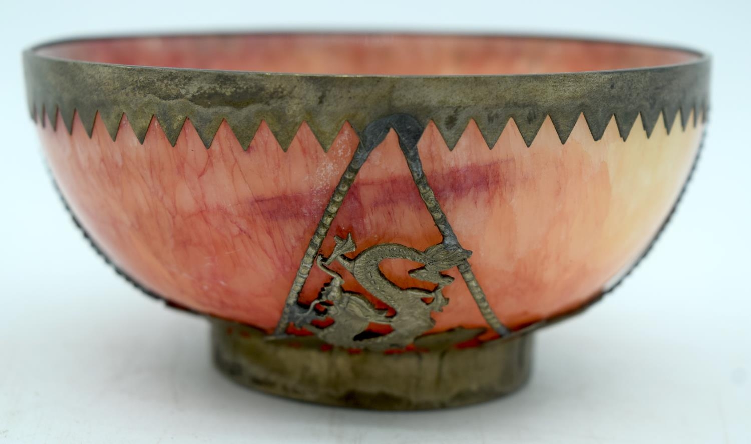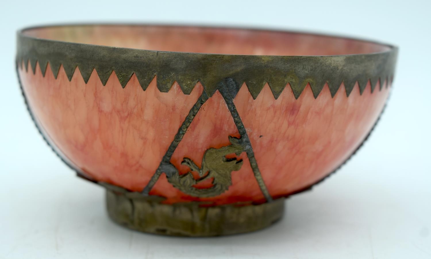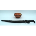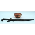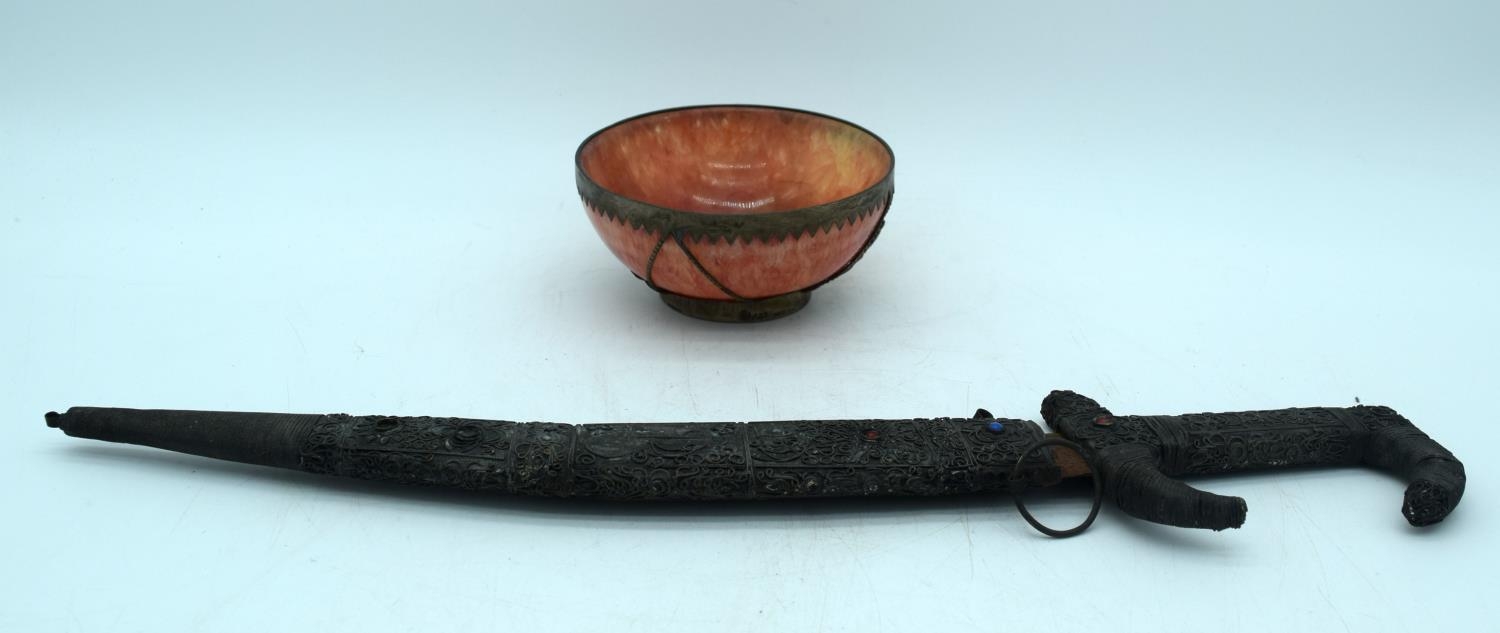 AN EARLY 20TH CENTURY CHINESE CARVED PINK STONE BOWL together with a coral inset dagger. Largest 36 cm long. (2)
