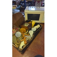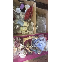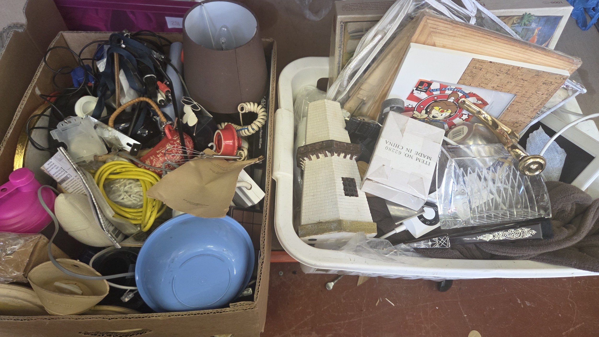 Box and Basket of Mixed Household Goods Decorative Ornaments and Small Electronics