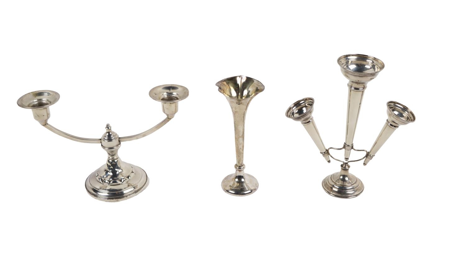Silverware: An American silver two branch Candelabra, on circular base (weighted) approx. 13cms high; an Edwardian silver Posy Vase, Sheffield J. Dixon & Sons Ltd., 1931 (weighted) approx. 14cms high; also a small three part Vase Epergne, Birmingham 1909, approx. 18cms high (weighted). (3)