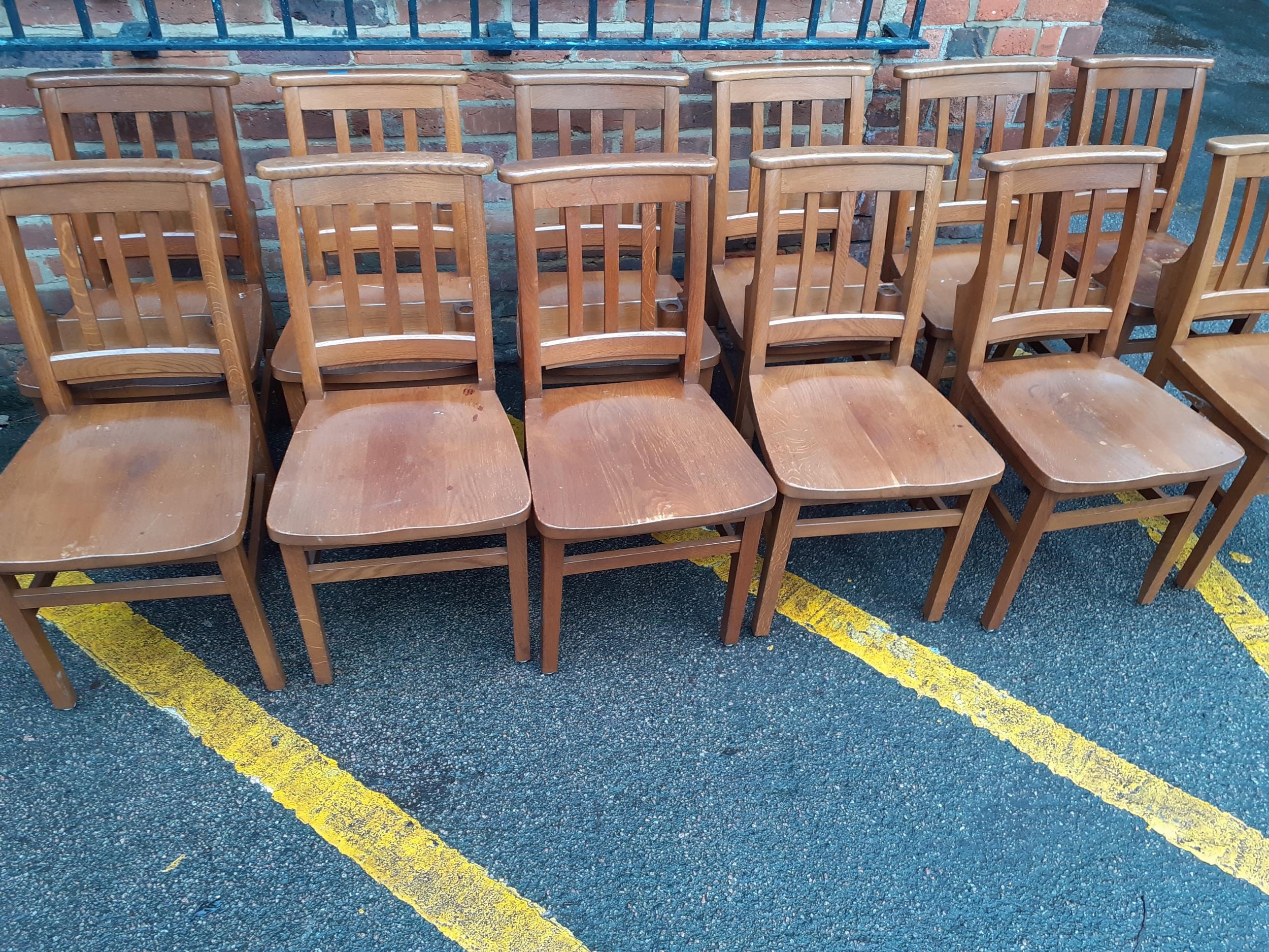 Twelve vintage oak school chairs A/F made by Glennisters, High Wycombe
