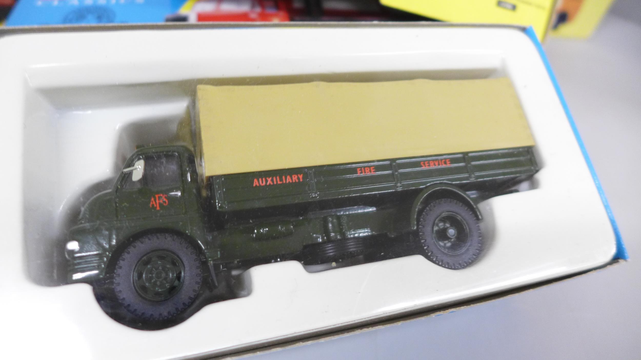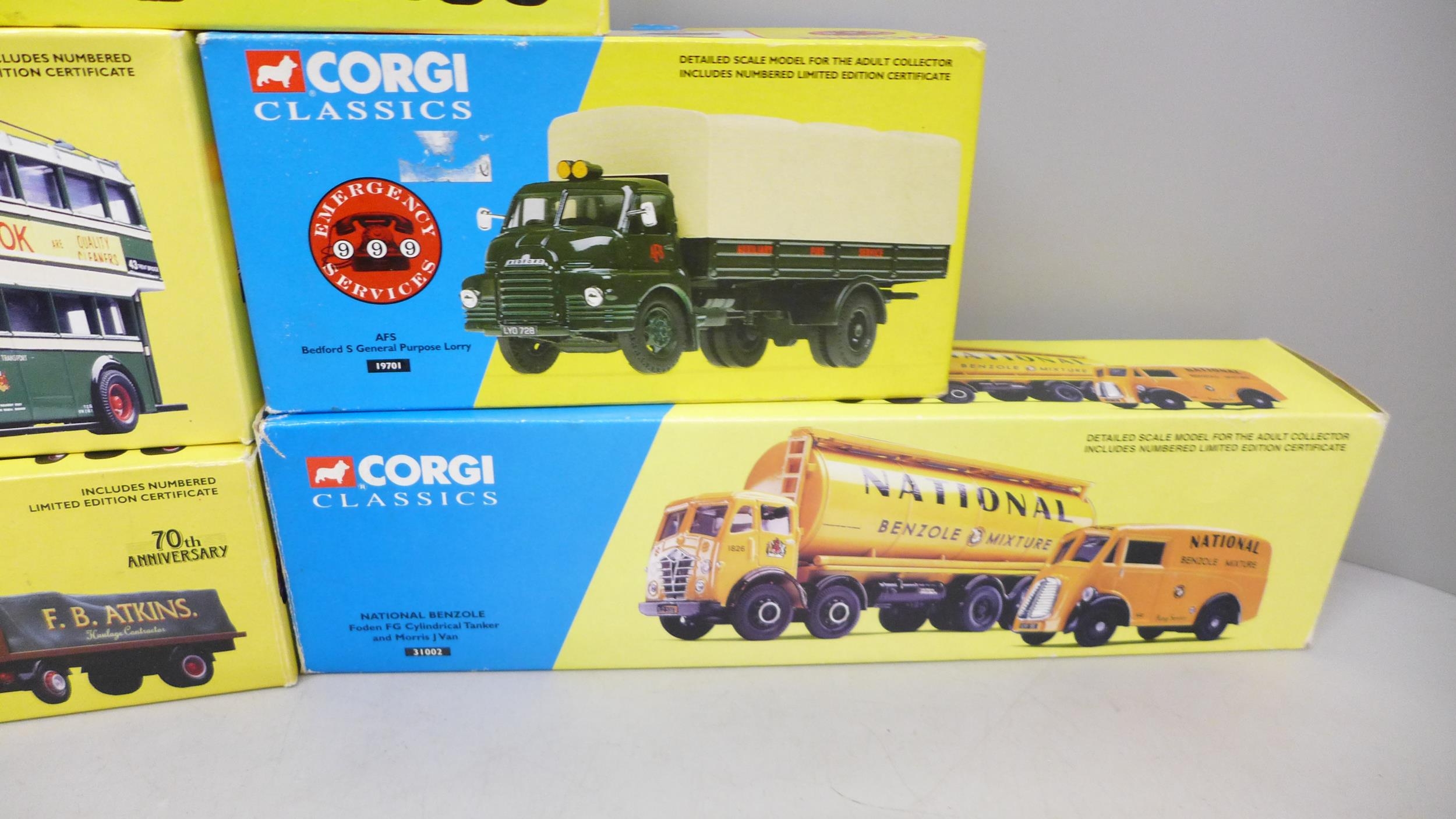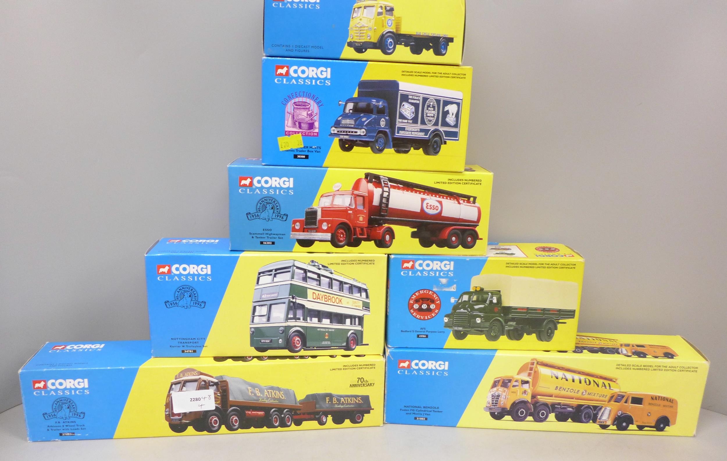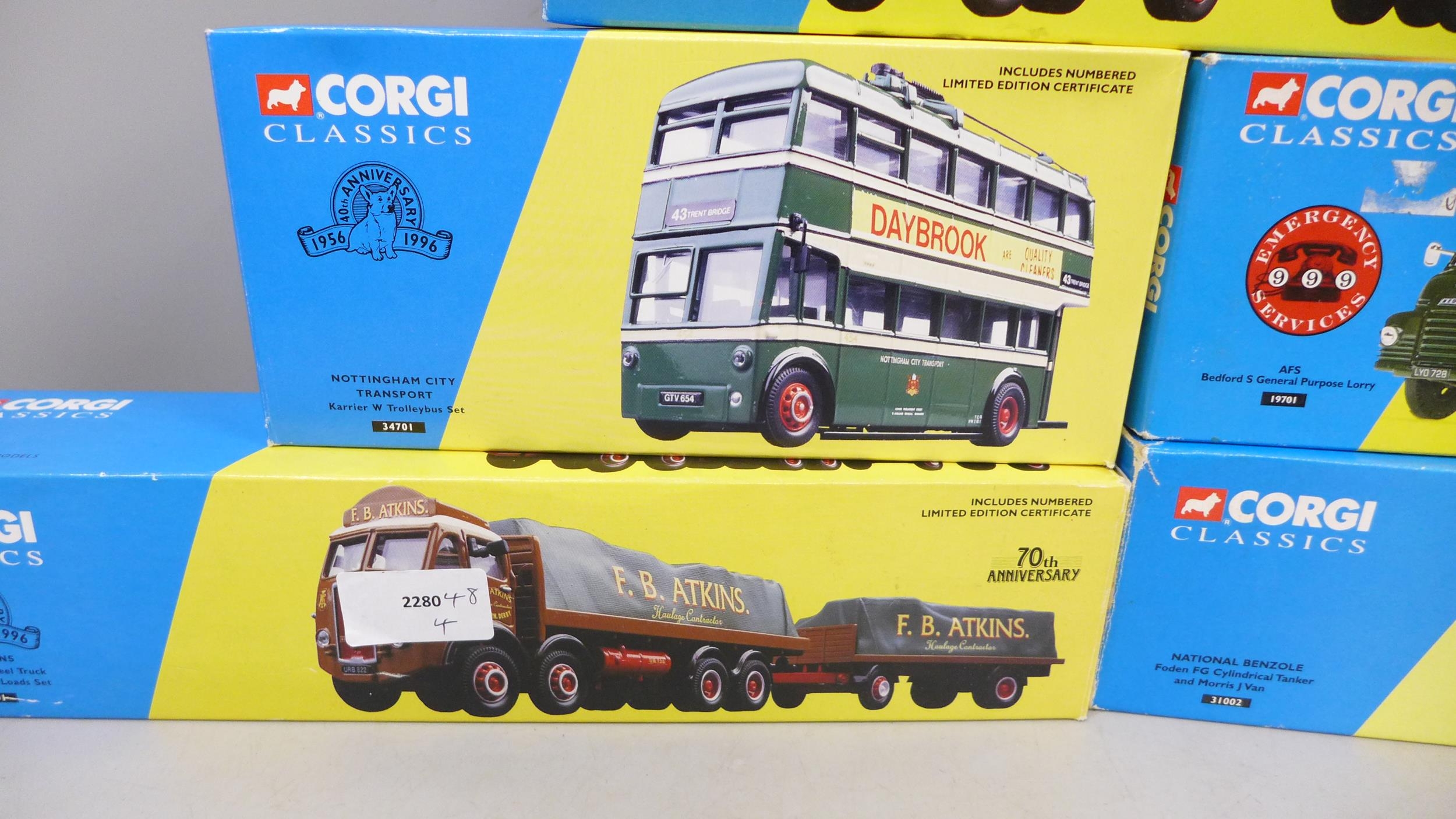 Seven Corgi Classics model vehicles, including Nottingham City Transport Trolleybus, all boxed