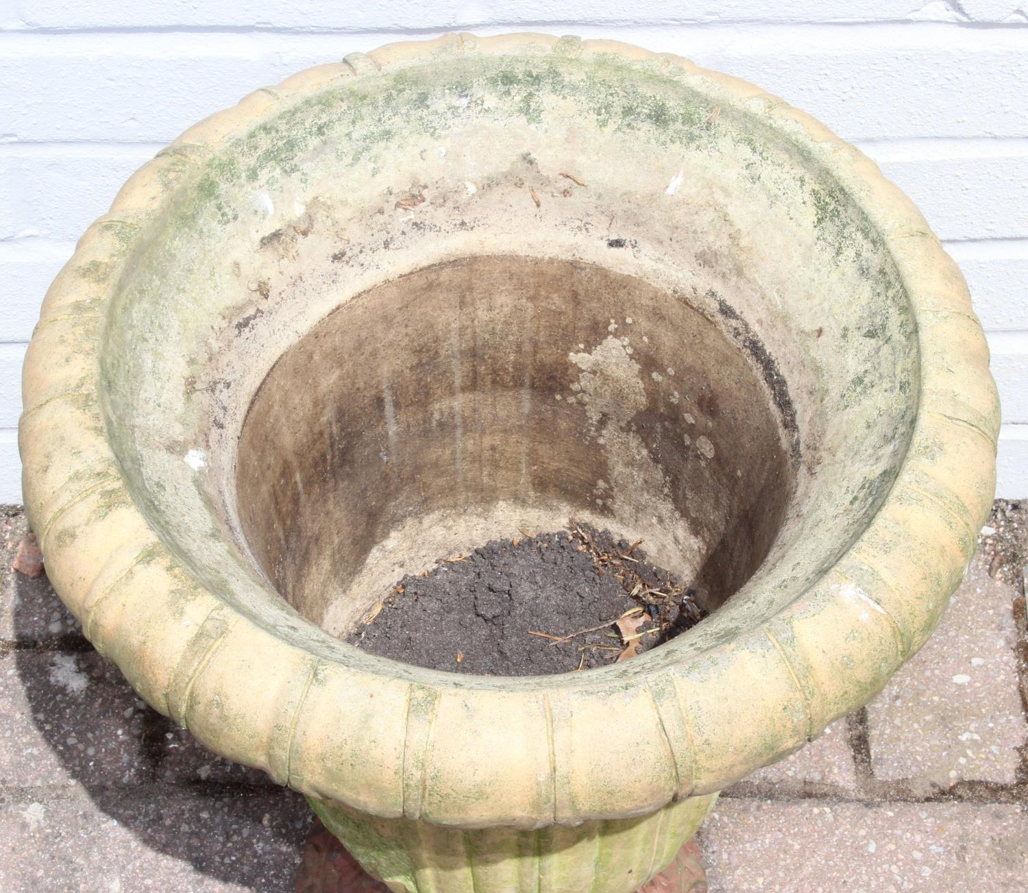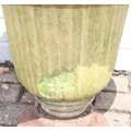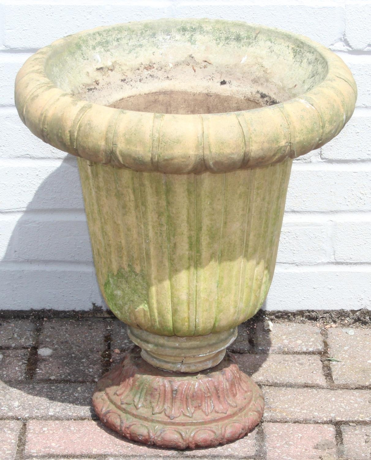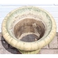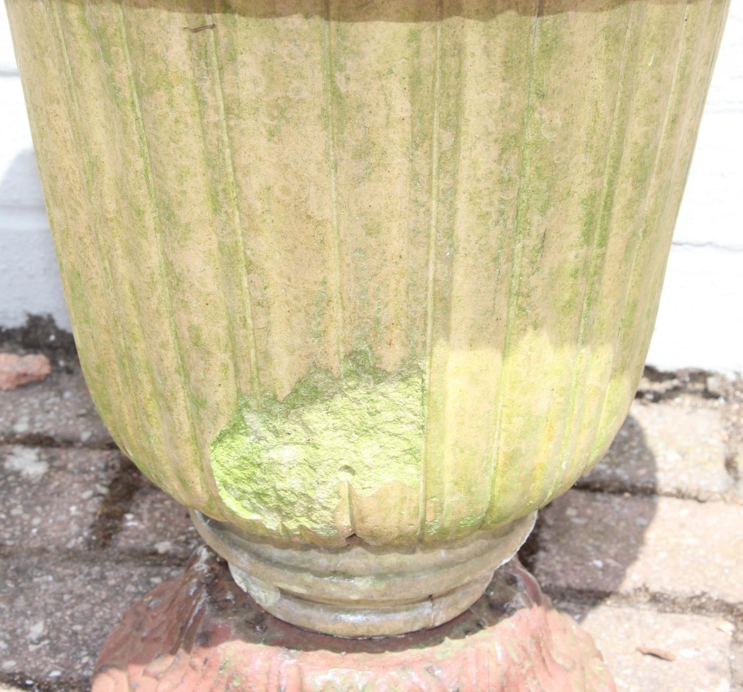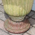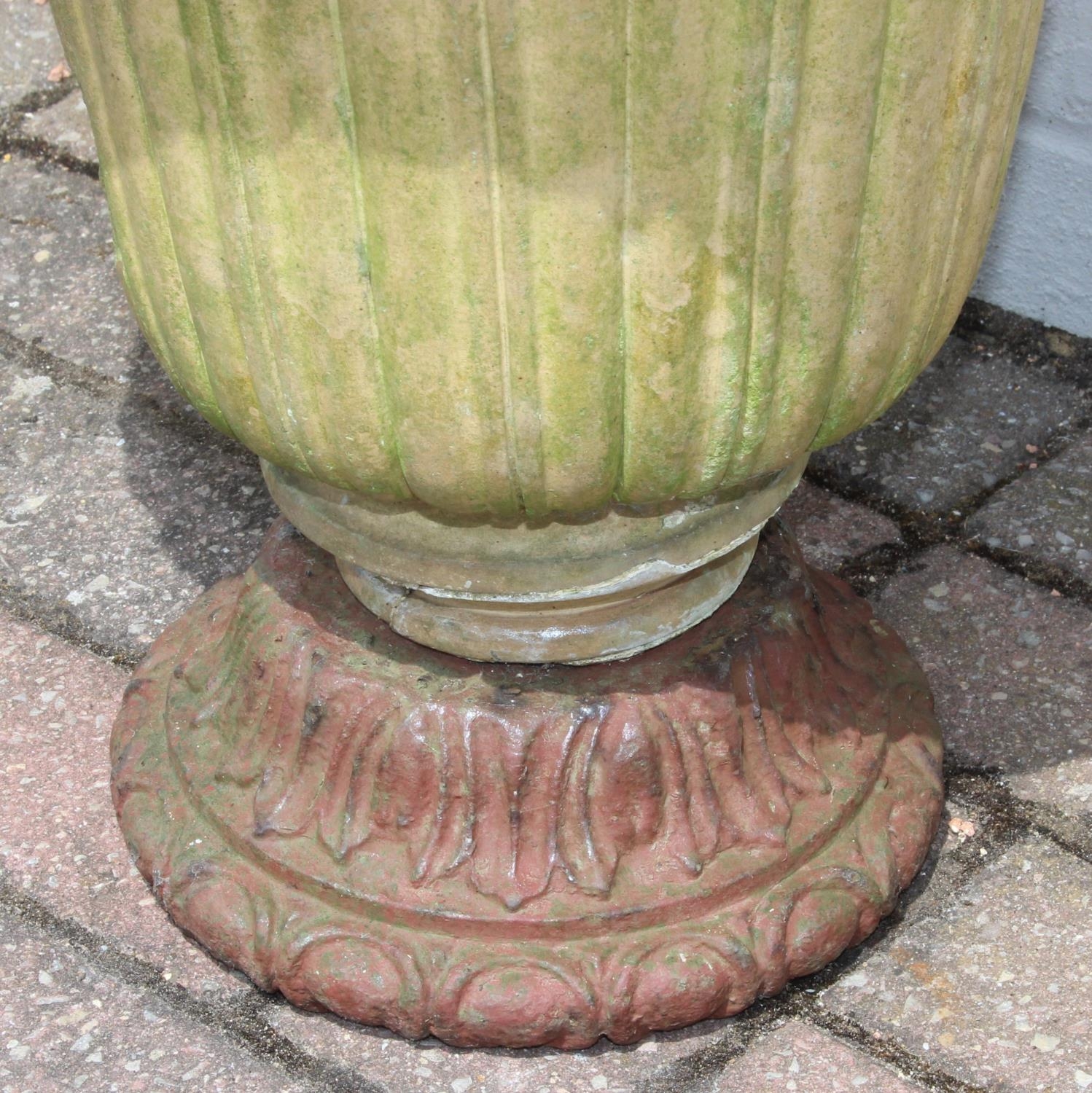 Antique ceramic garden urn with cast iron base, 43cm diameter x 48cm tall