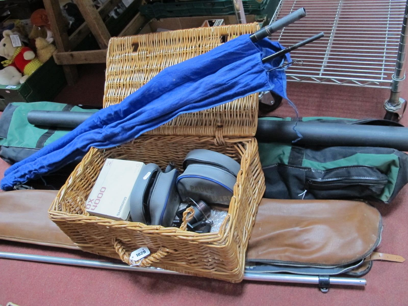 Fishing - rods, Shakespeare and others, Sundridge, Shimano reels, torch, wicker basket.