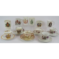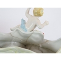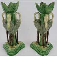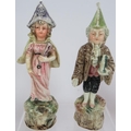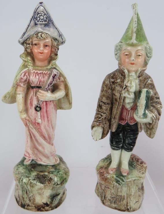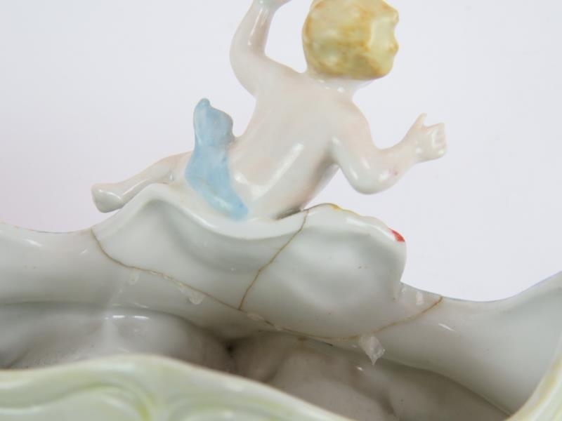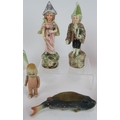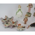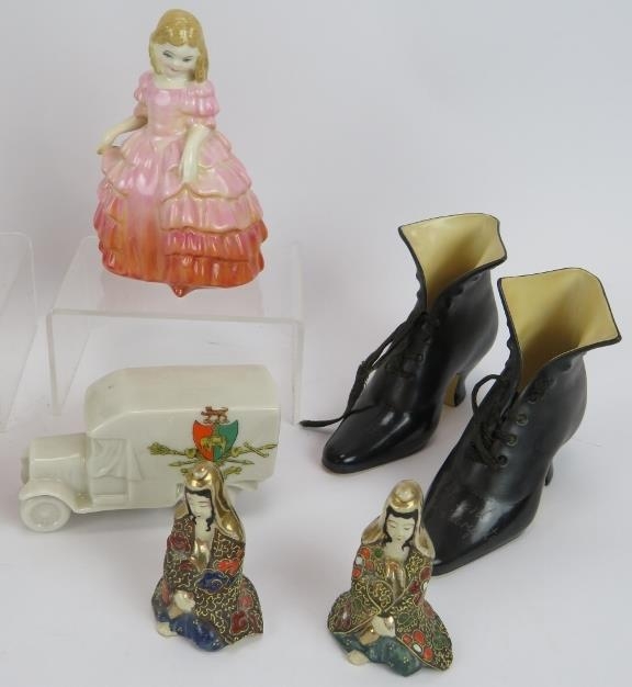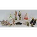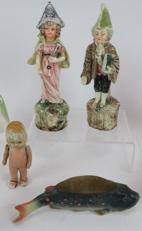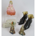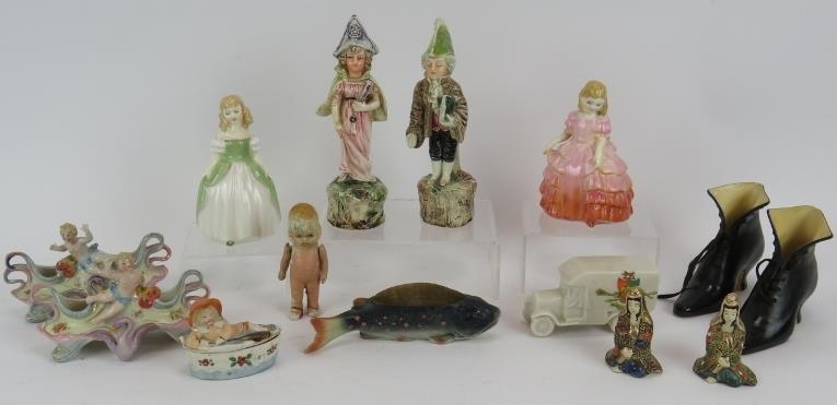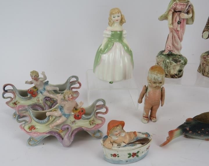A mixed lot of antique ceramic figures including a pair of Majolica figurines, a continental cherub posy vases, Bisque fish pin cushion, pair of ceramic shoes, two Royal Doulton figurines and others. (14).