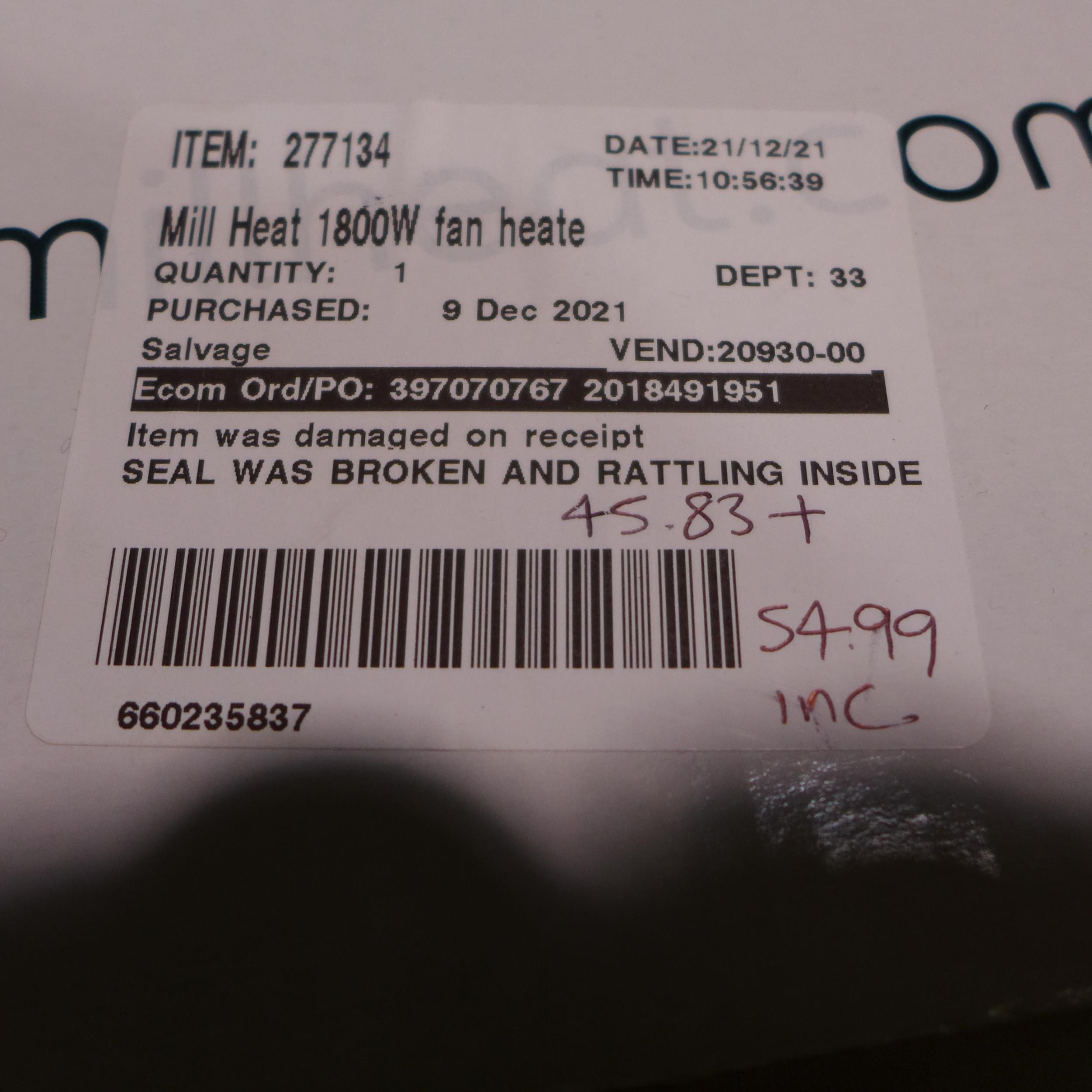 Mill 1800W PTC Fan Heater (model no.:- CUS1800MECWA) (246-18...