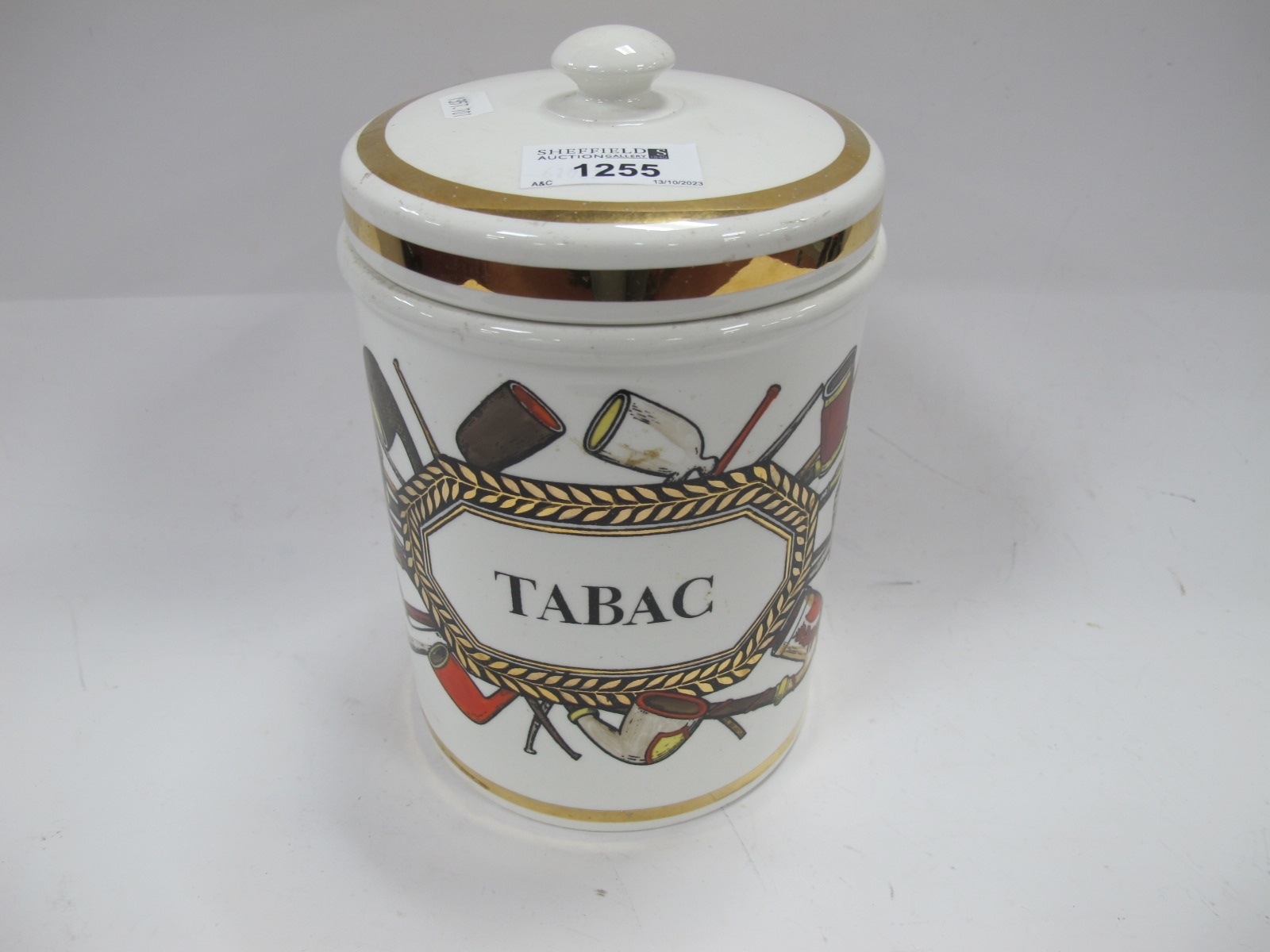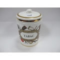 FornasettiTobacco Jar, circa 1960's/70's, featuring 'Tabac' in lozenge surrmounted by images of smokers pipes with lid, 20cm high