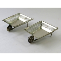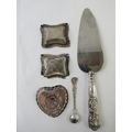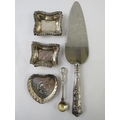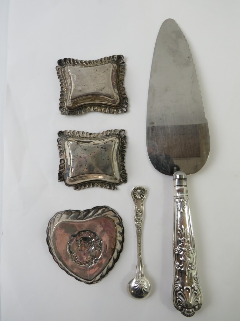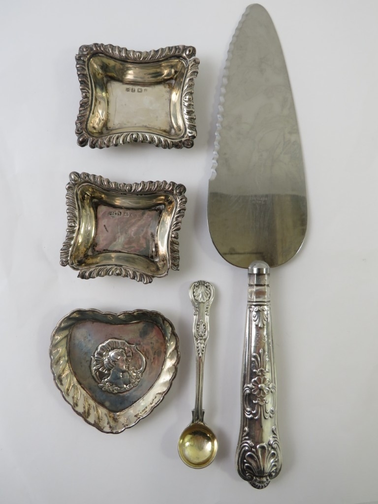 Five hallmarked silver items to include a pair of pin dishes, a heart shaped pin dish, a king's pattern mustard poon and a silver handles pie slice. Approx weighable silver 42 grams. (5)