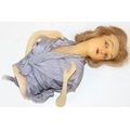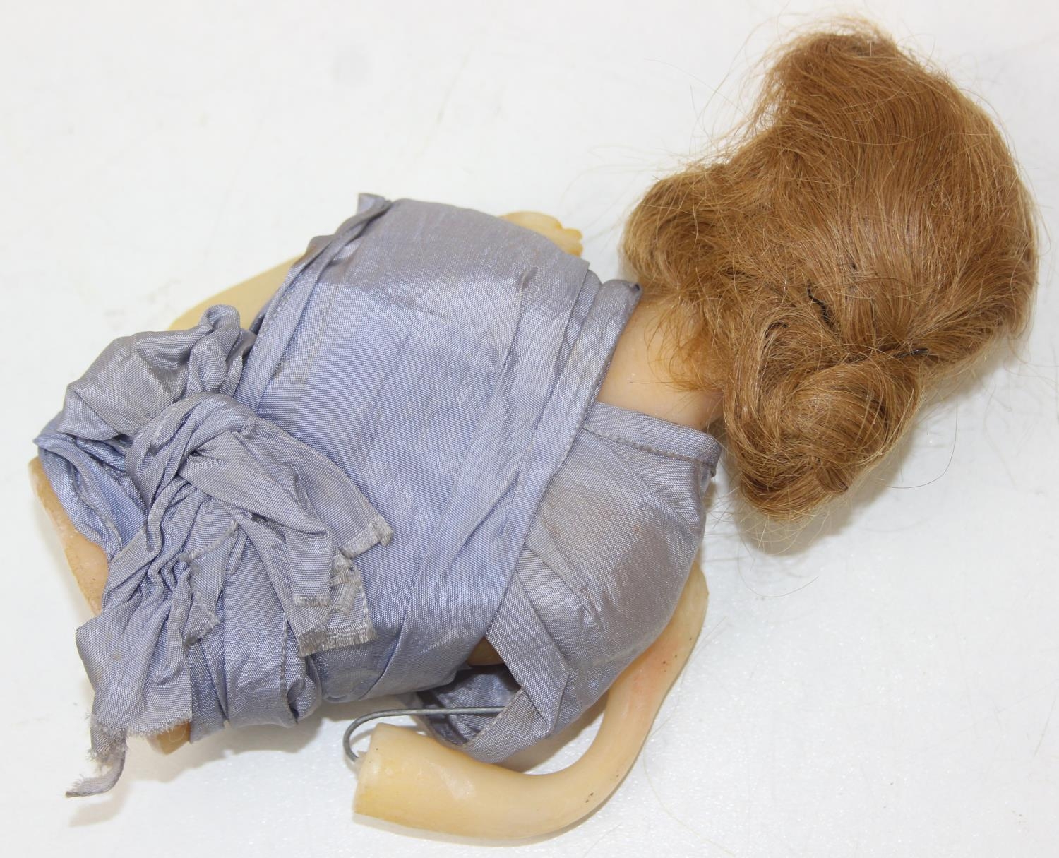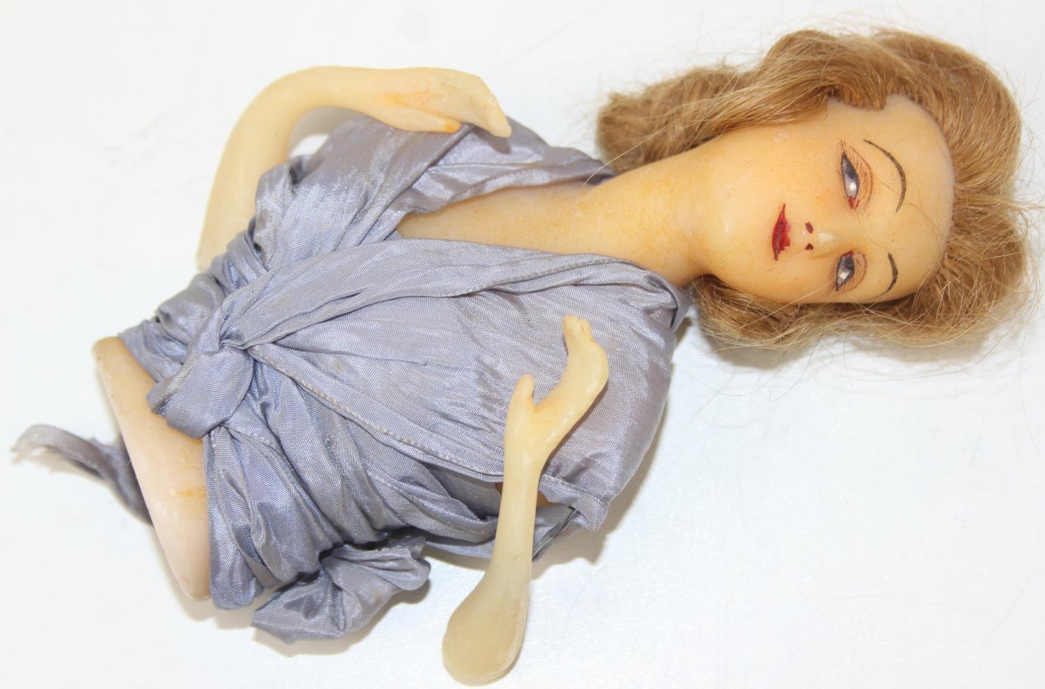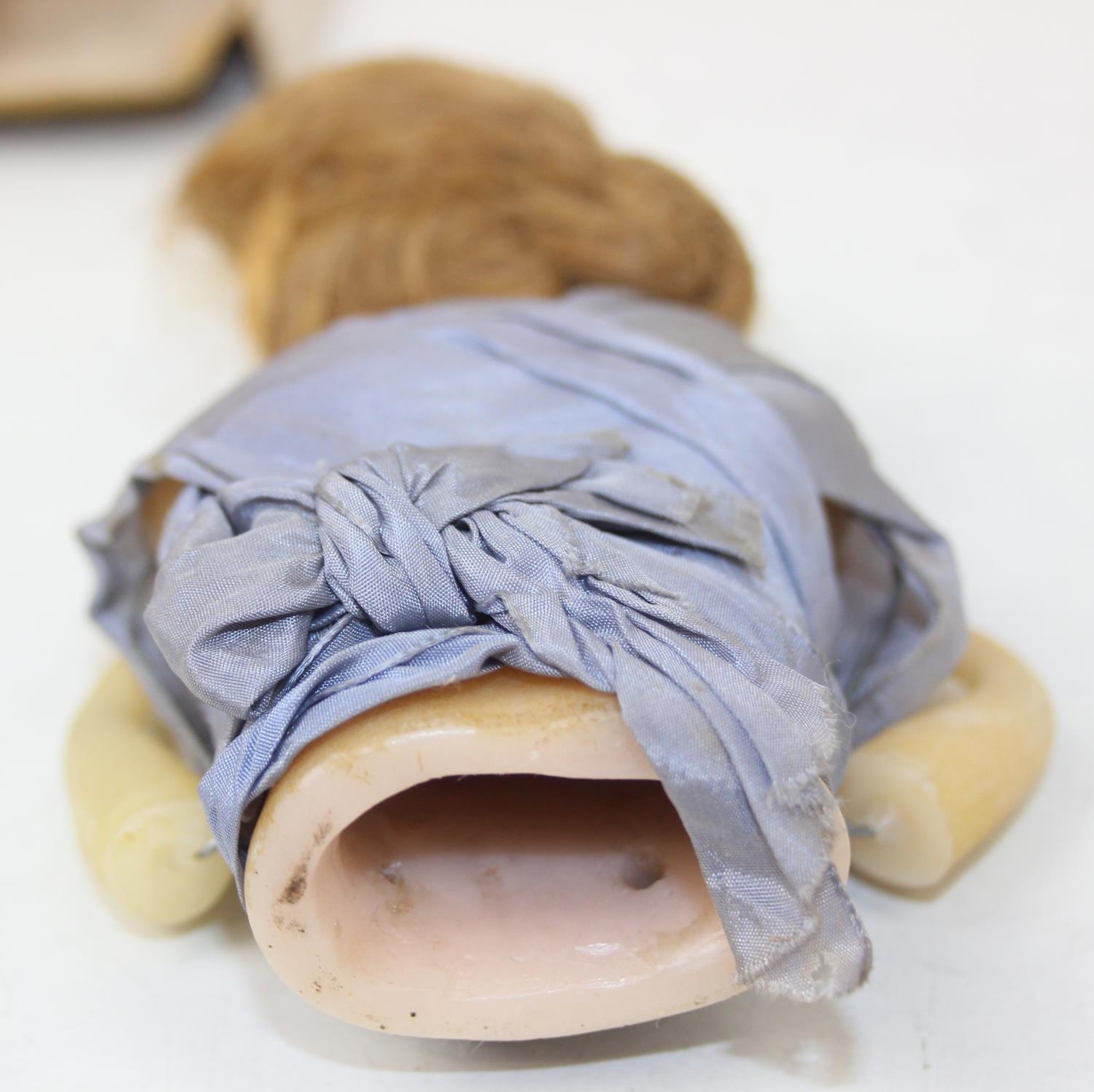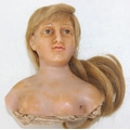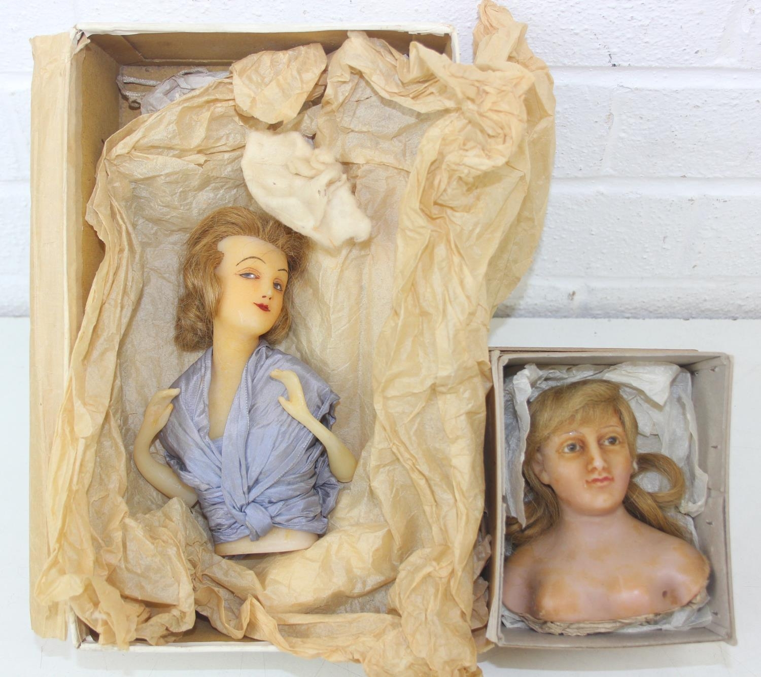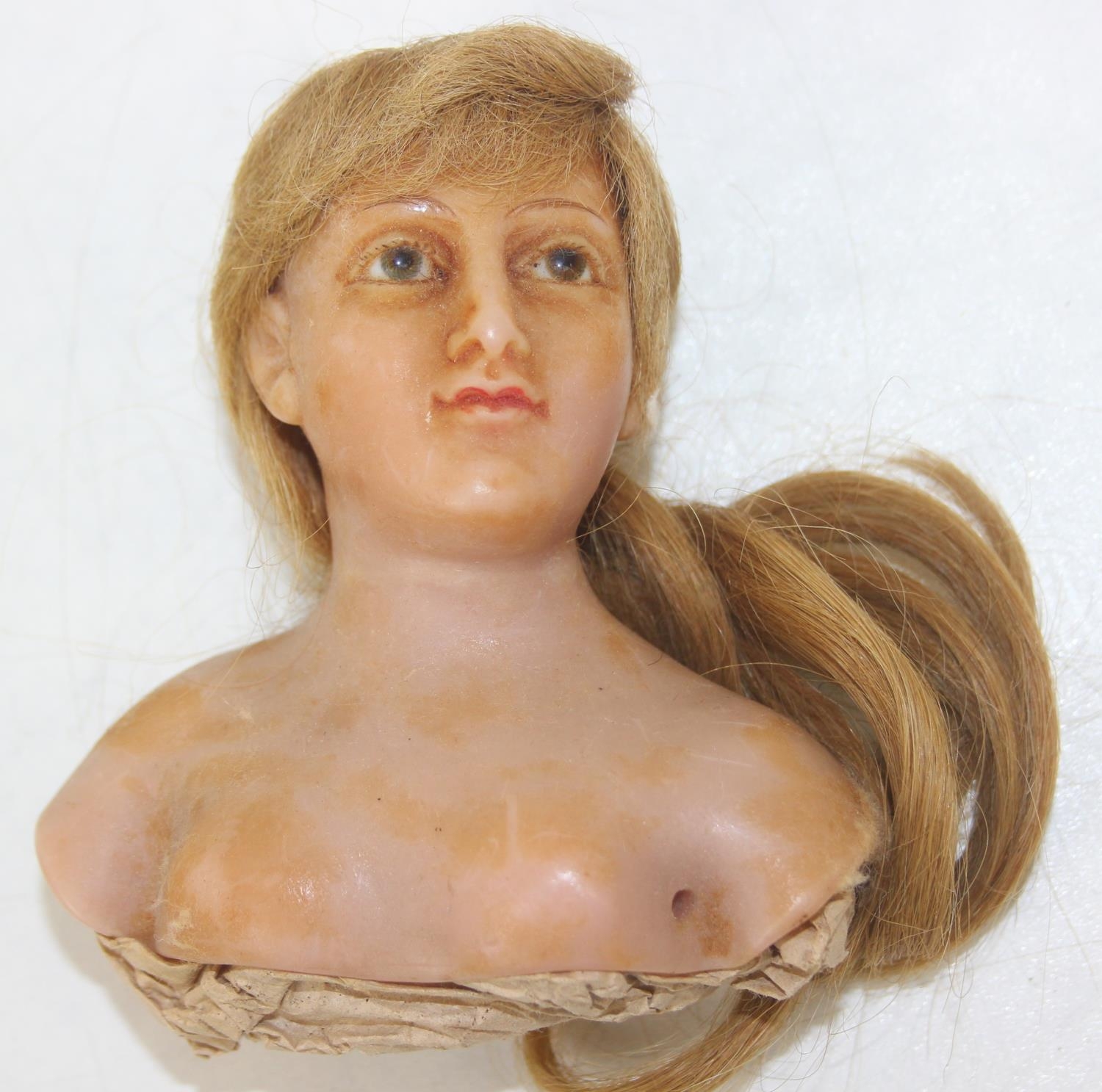 Two antique wax doll heads, one with glass eyes, the other painted with torso and arms, no makers marks, the largest 16cm tall [2]