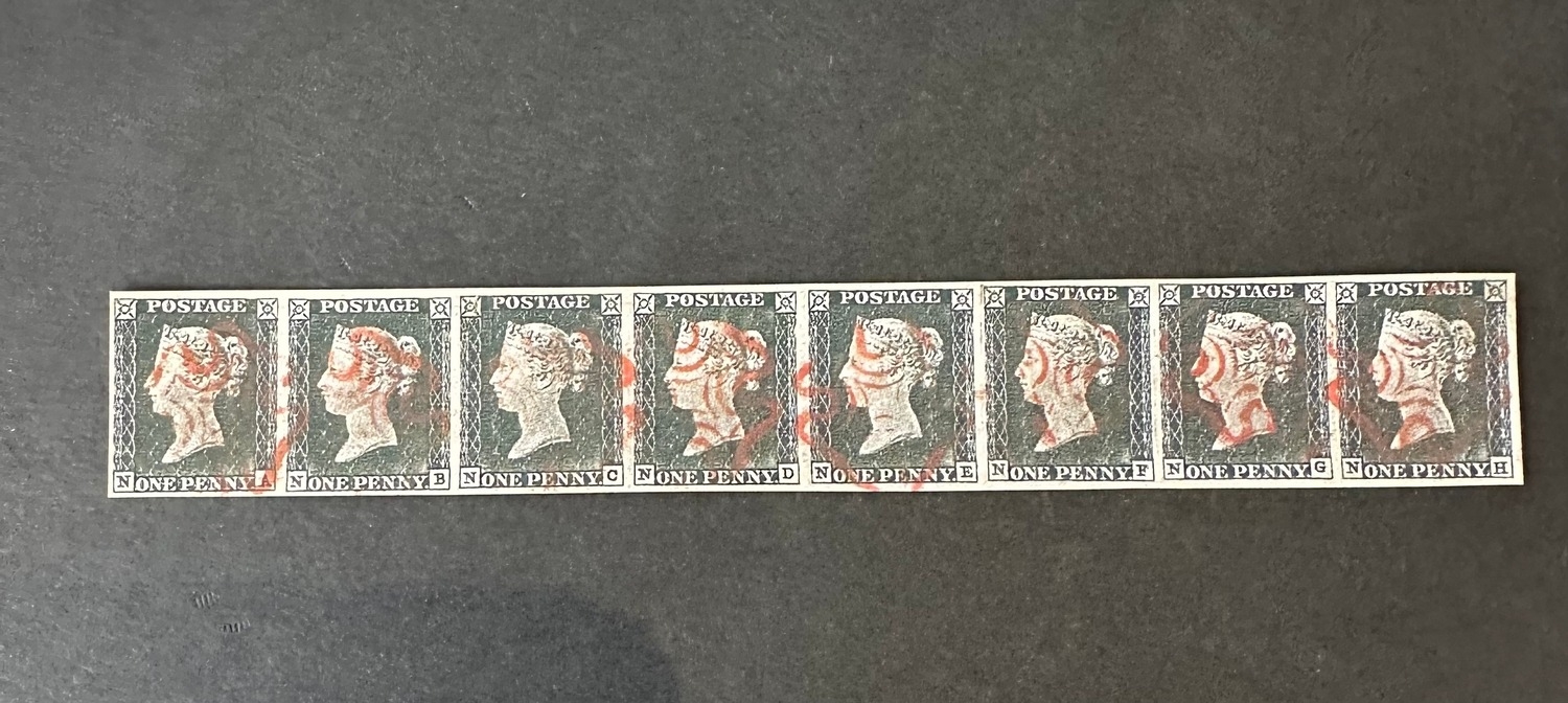 Replica strip of 8 penny black stamps with red Maltese cross cancels