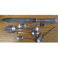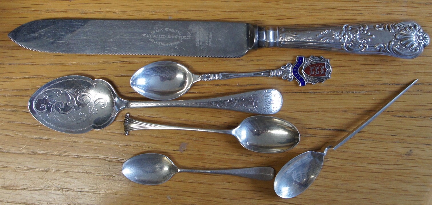A silver handled knife, Sheffield 1937 by Viners, together with a silver jam spoon, Sheffield 1924 by Robert Pringle, silver Jersey enamelled souvenir spoon, plus three others (6).