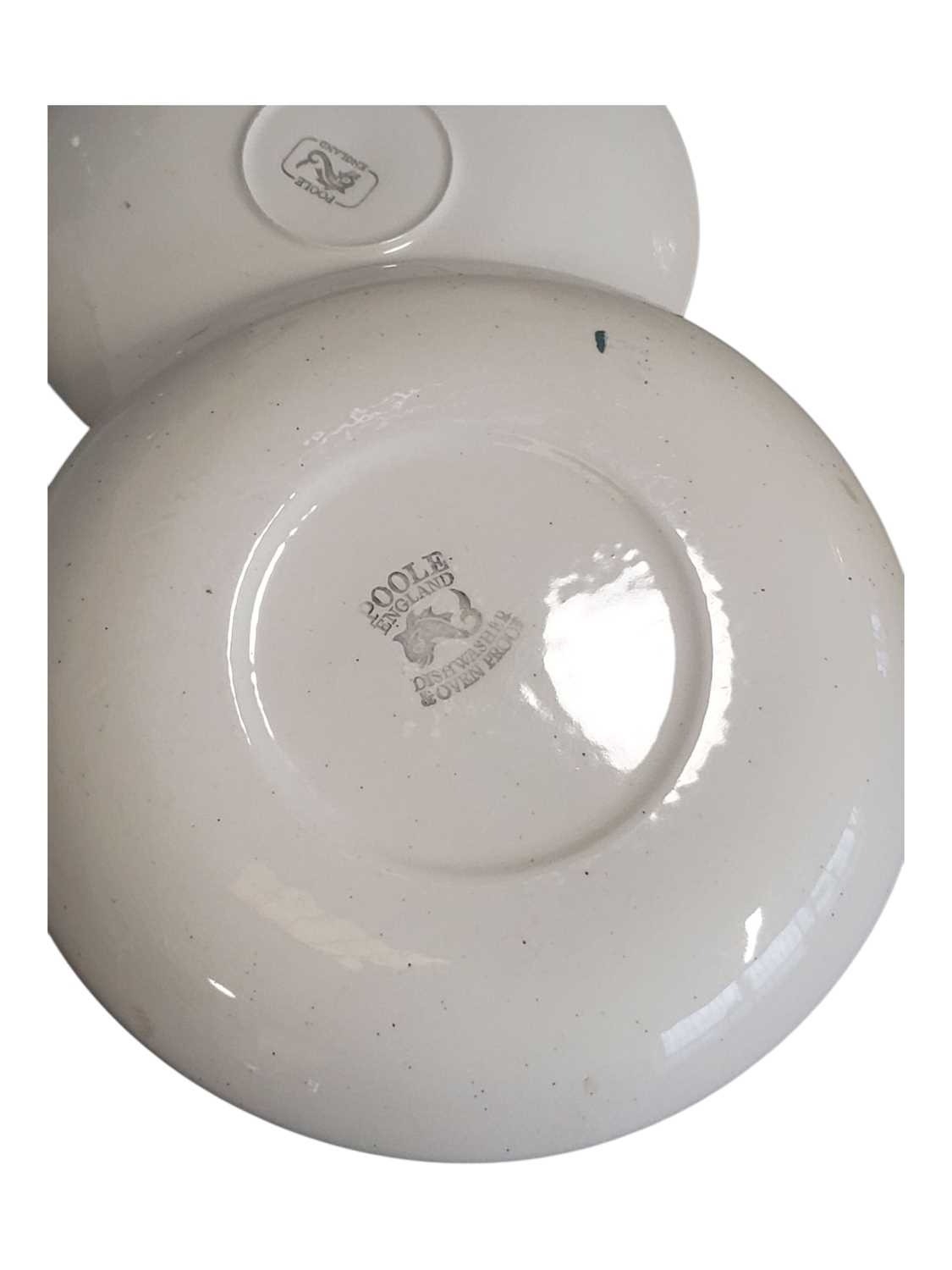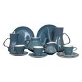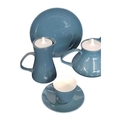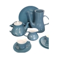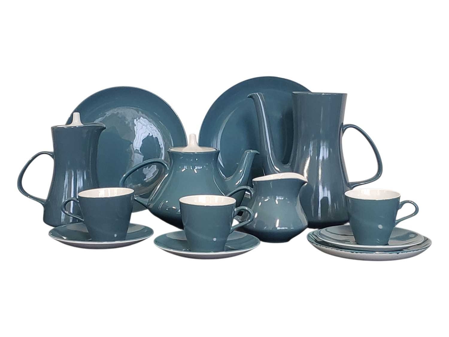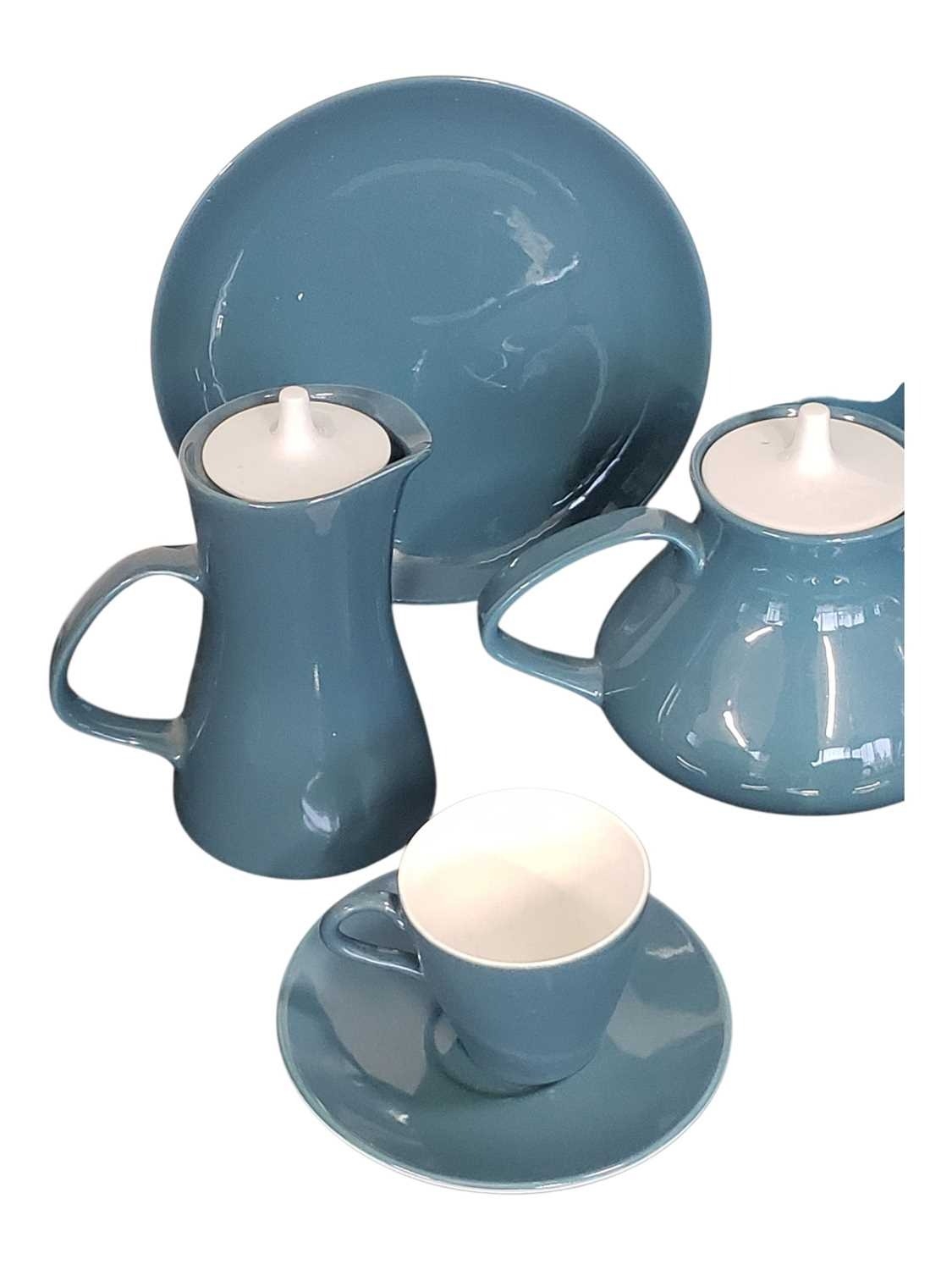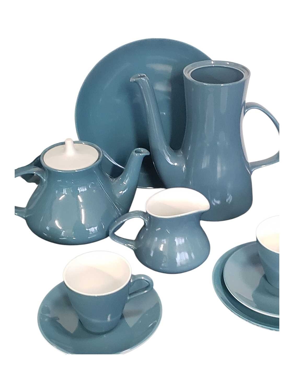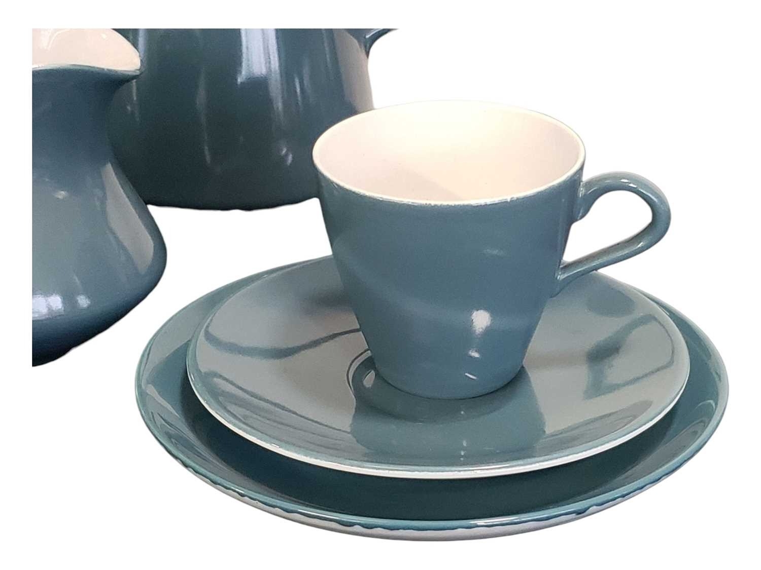 Poole Pottery - Mid century vintage two tone pottery tea service. Comprising a tea pot, coffee cups, saucers, bowls, plates, milk jug, sugar pot and more. Decorated in a blue and white two tone colourway. Makers mark to the base.